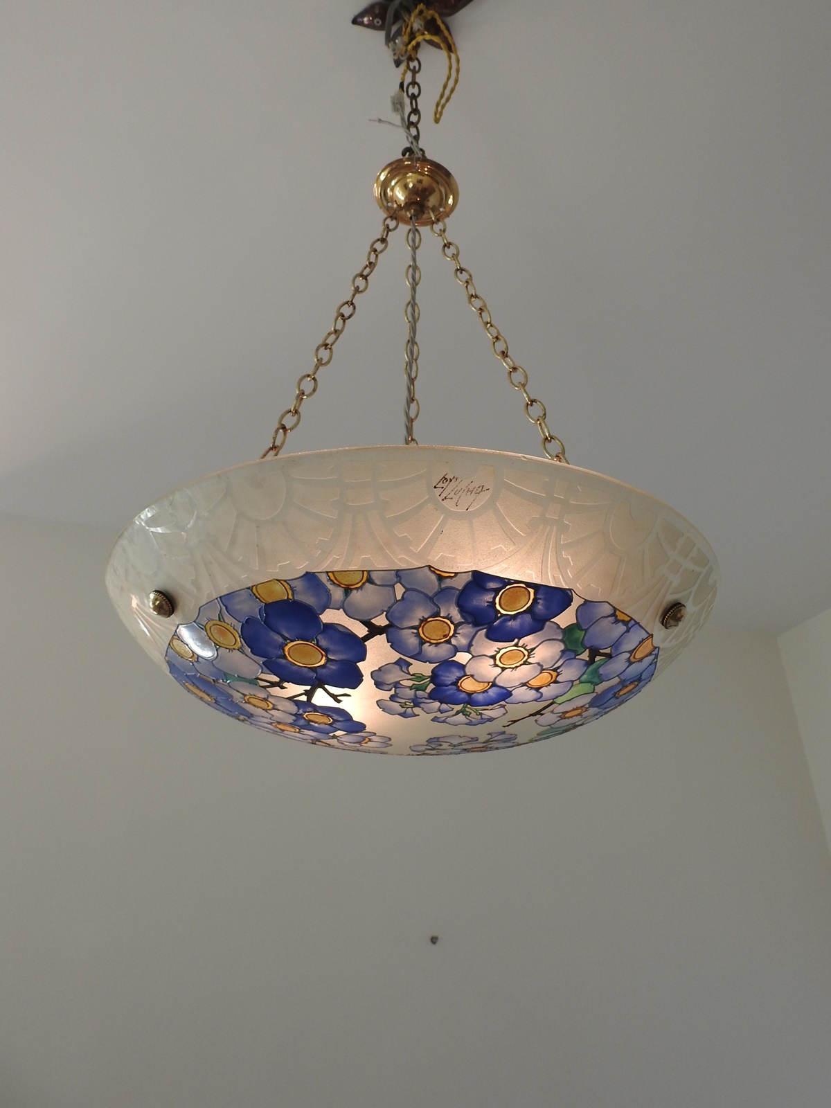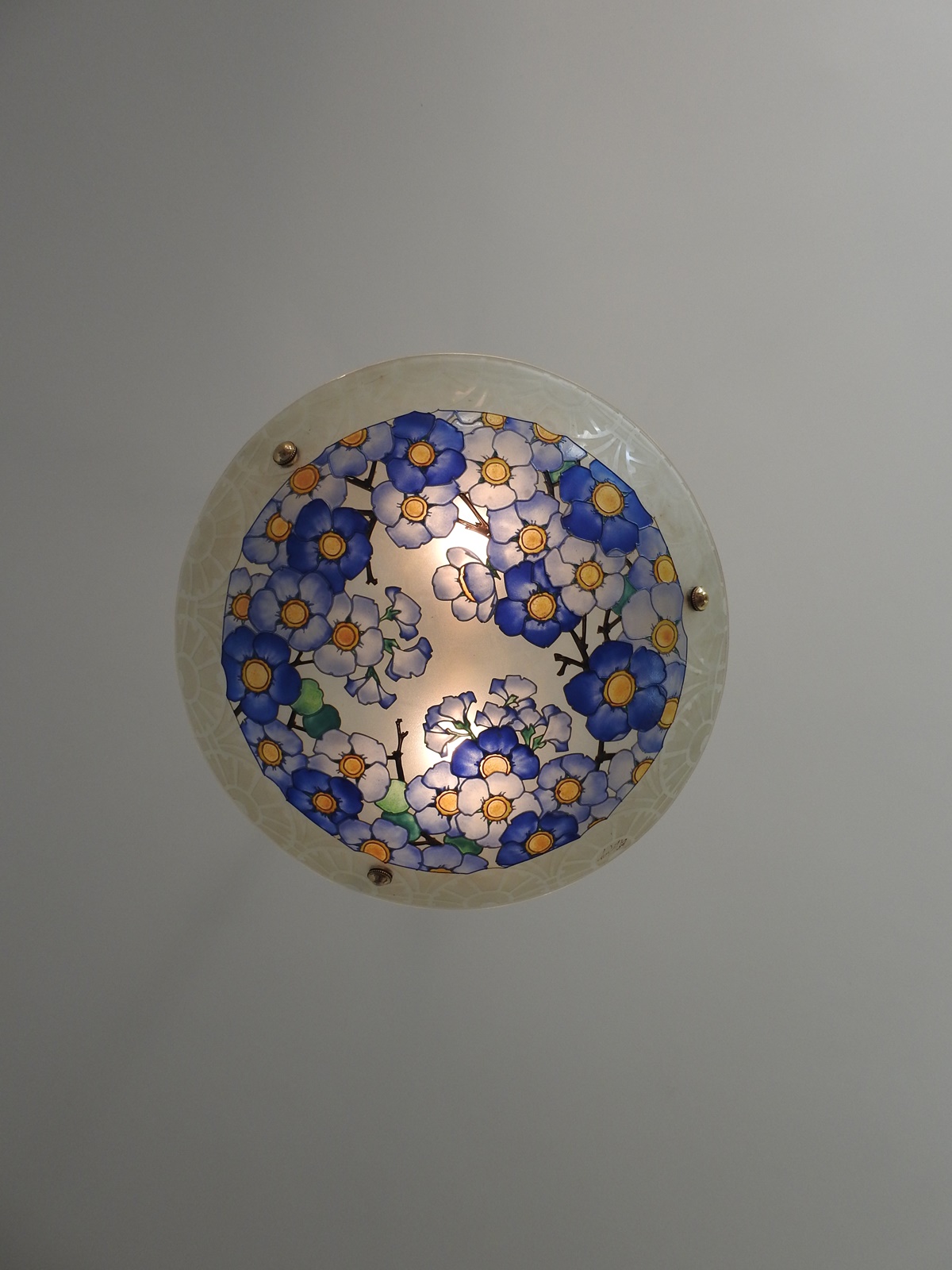 Product Code: LG434A large Loys Lucha “blue blossoms” enamelled glass plafonnier, with acid-etched geometric border. France c1935