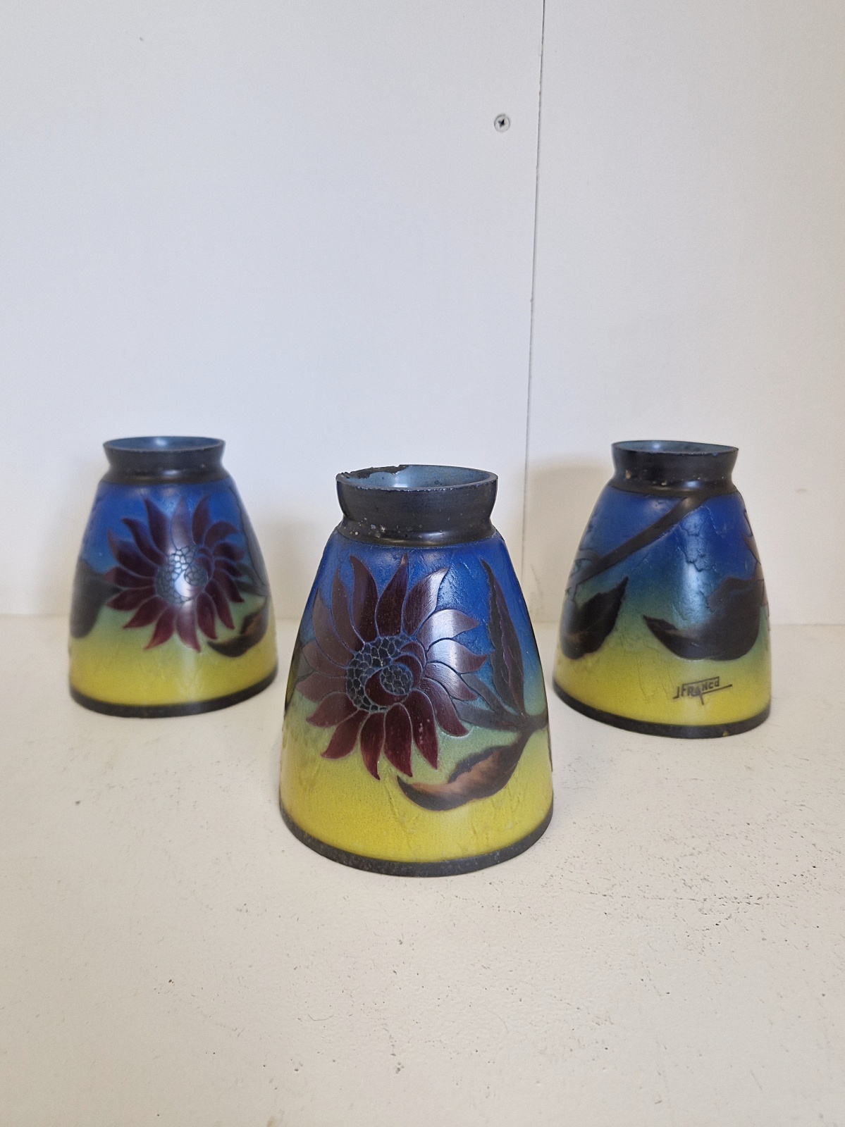 Product Code: PDV004An attractive set of 3 Cameo glass lampshades in the style of Loys Lucha and signed in the glass J.France.