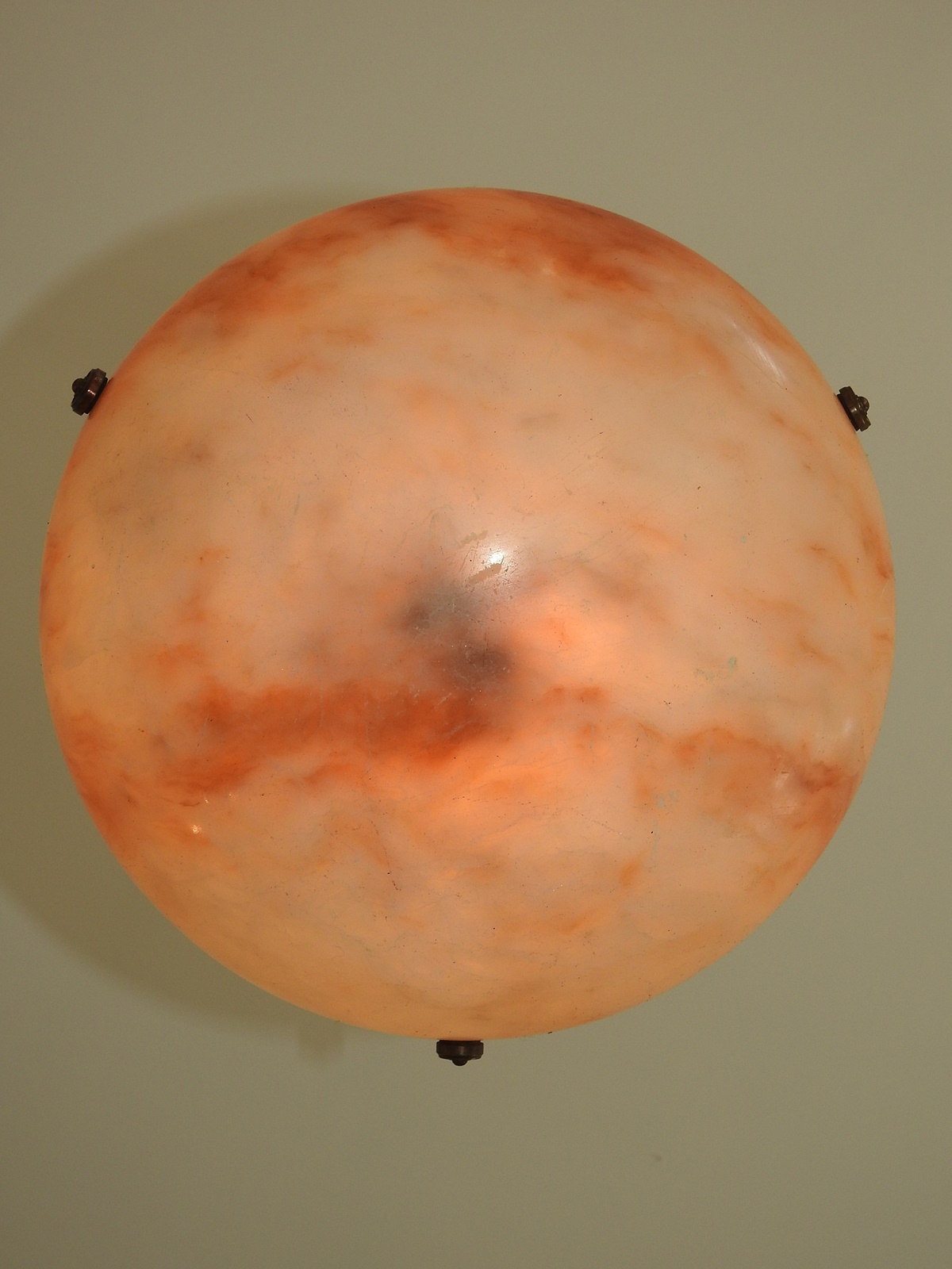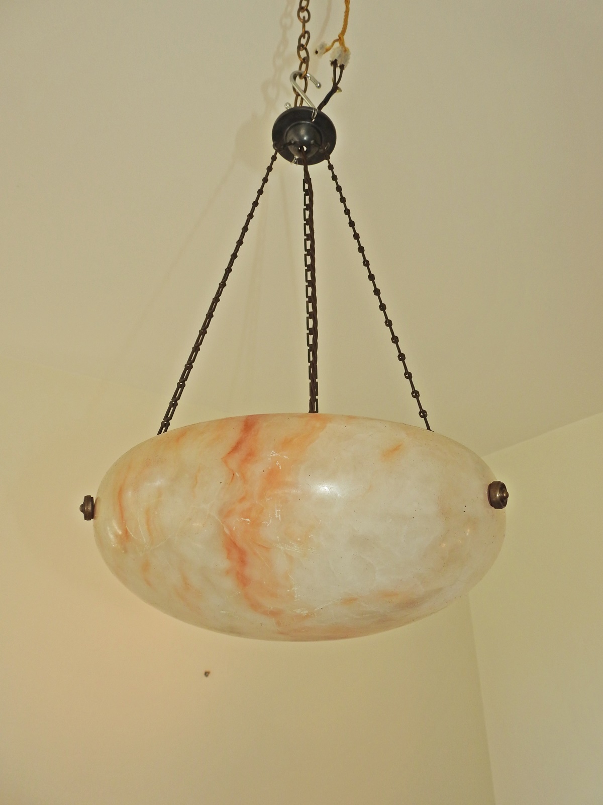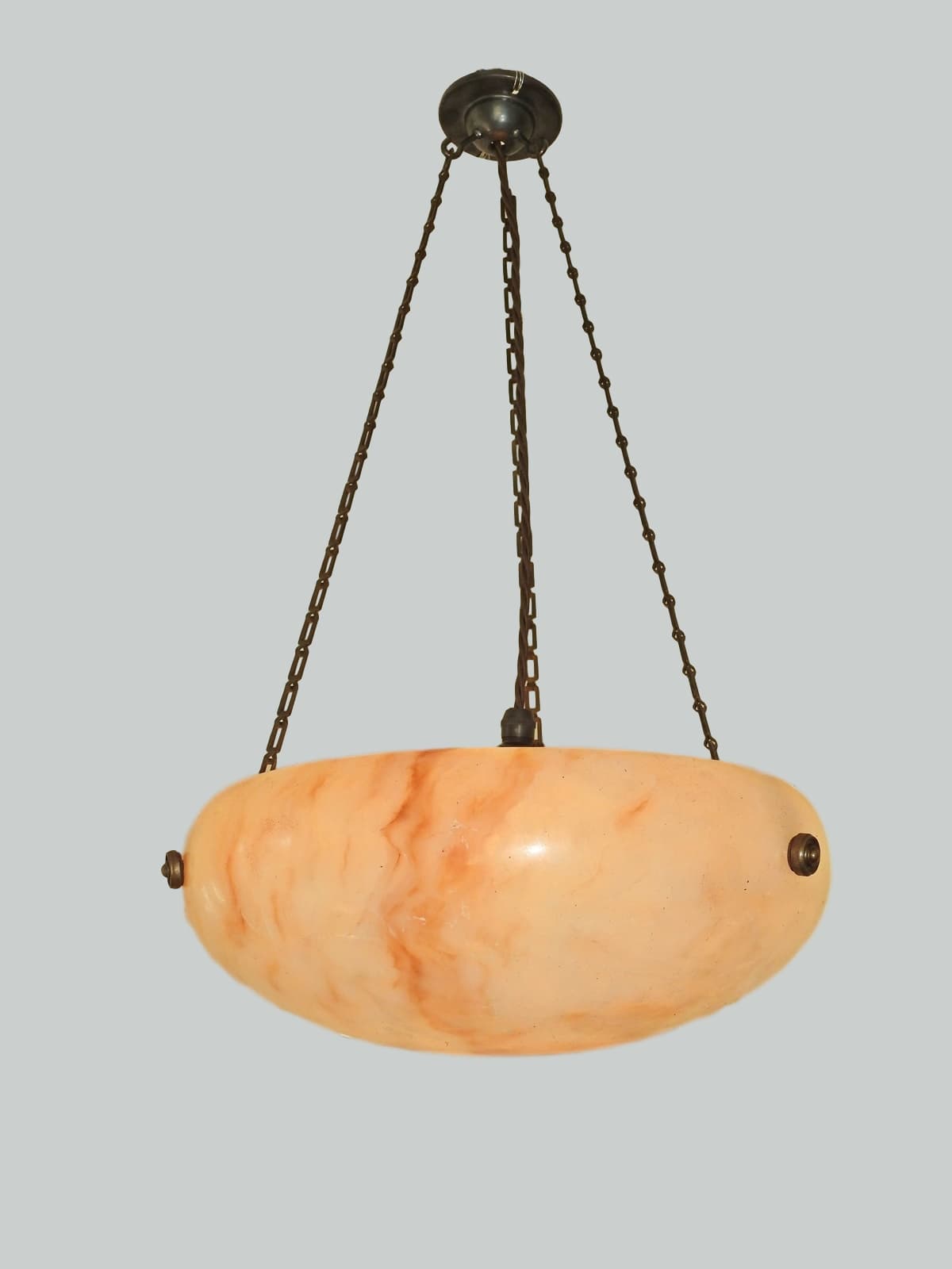 A small alabaster plafonnier in warm tones or cream and orange, with original finials and period chain. England, c1920