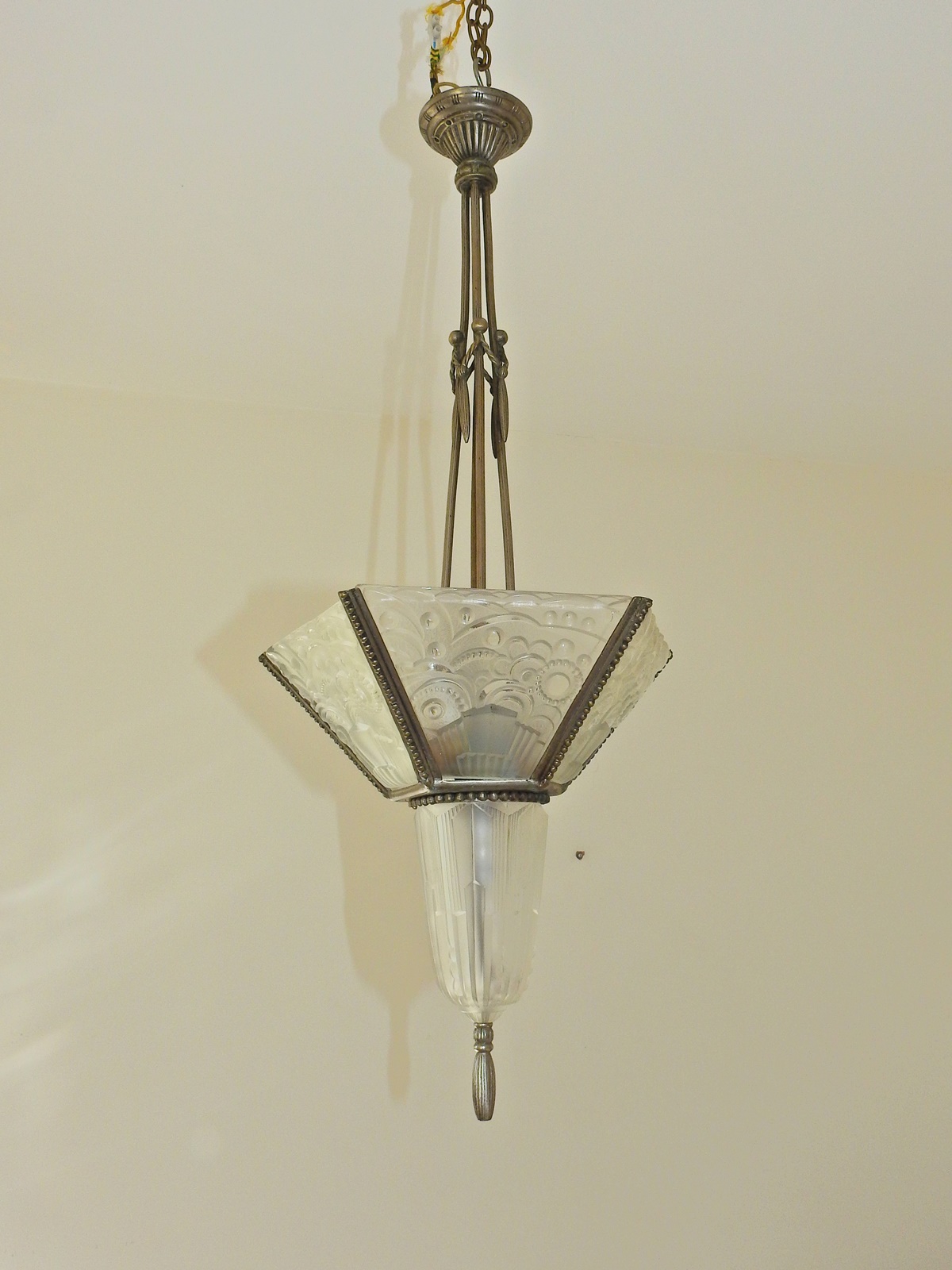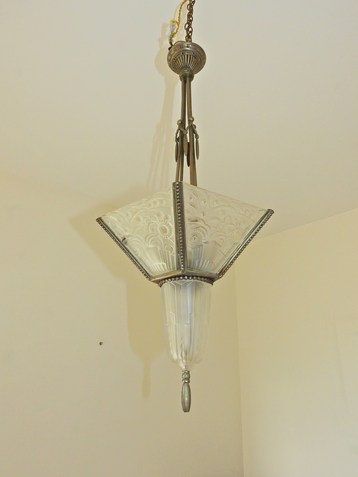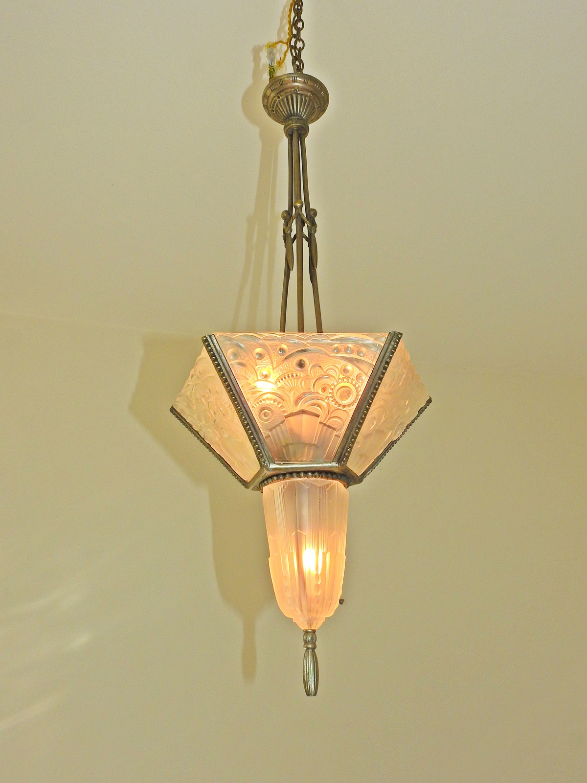 An elegant art deco nickelled-metal hanging lamp, the moulded and polished glass panels with stylised geometric design certainly by George Leleu but apparently unsigned