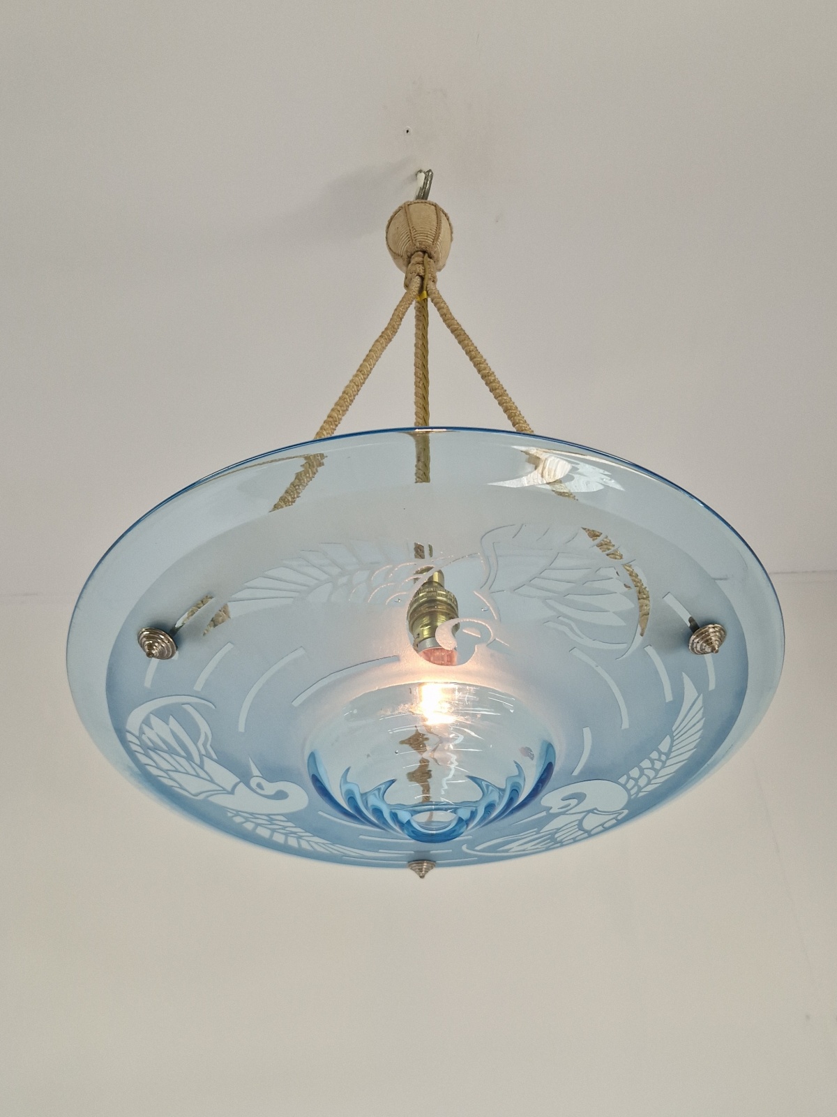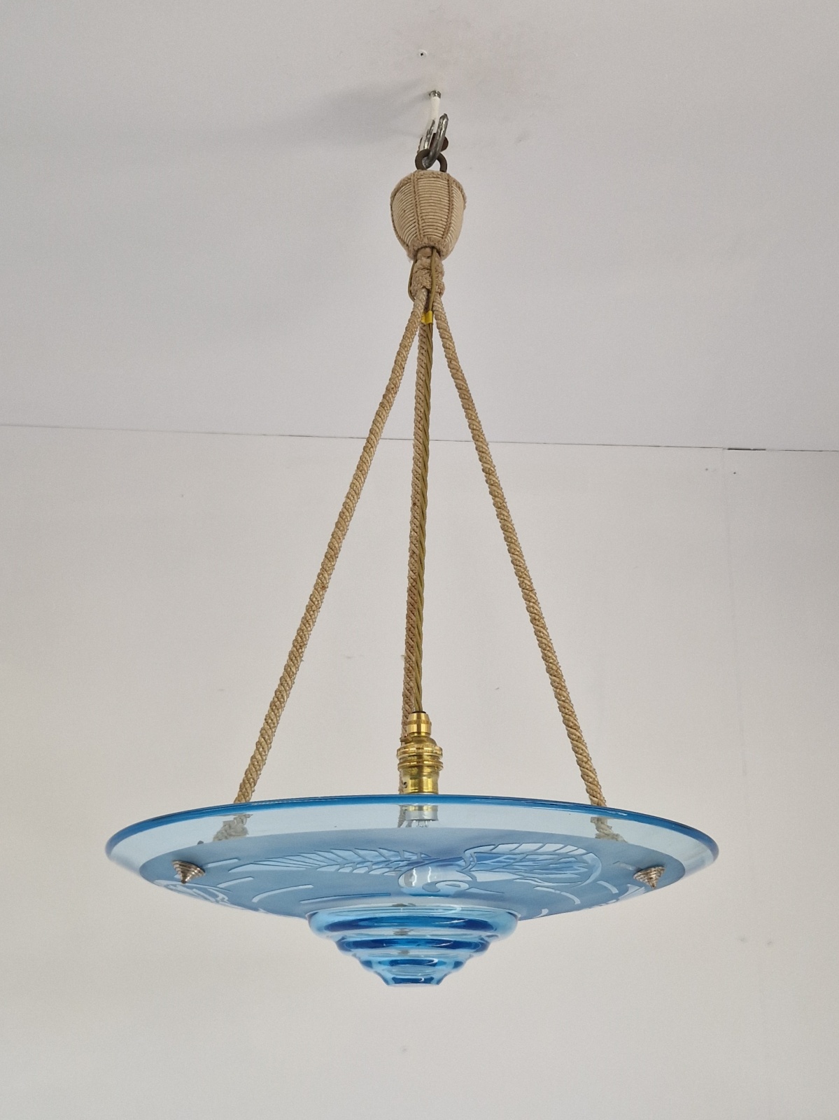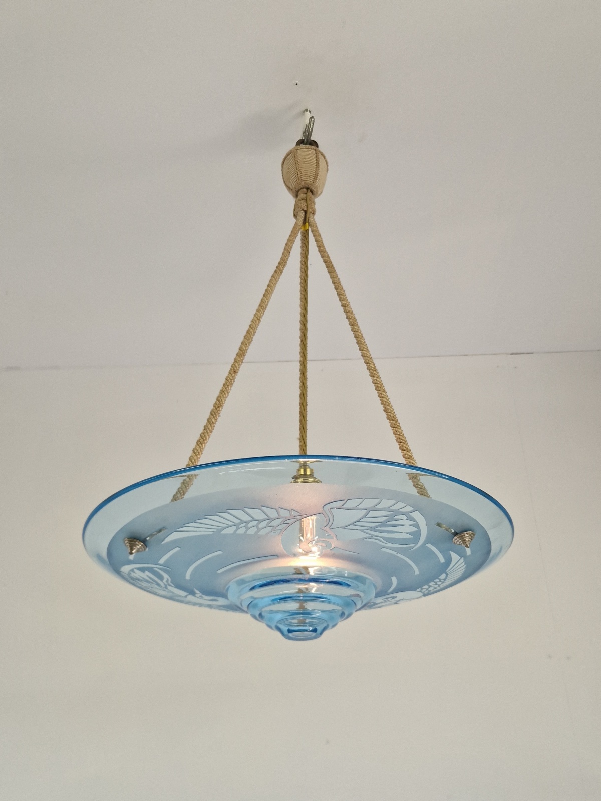 Product Code: JAL1201A rare & stylish art deco plafonnier signed by André Delatte, Nancy. The clear and acid-etched blue glass designed with storks and hangs with the original rope fitments for suspension. France c.1925