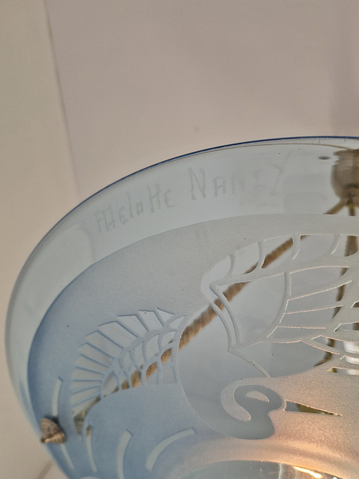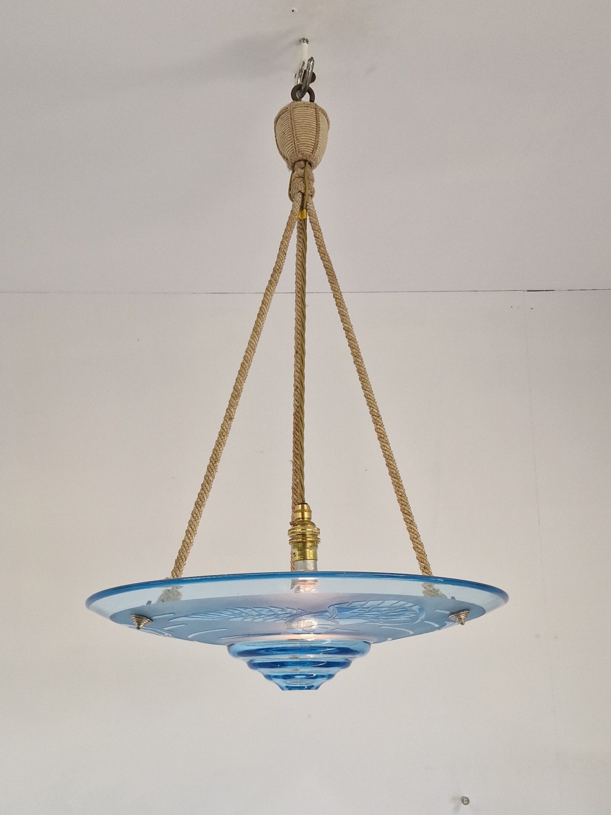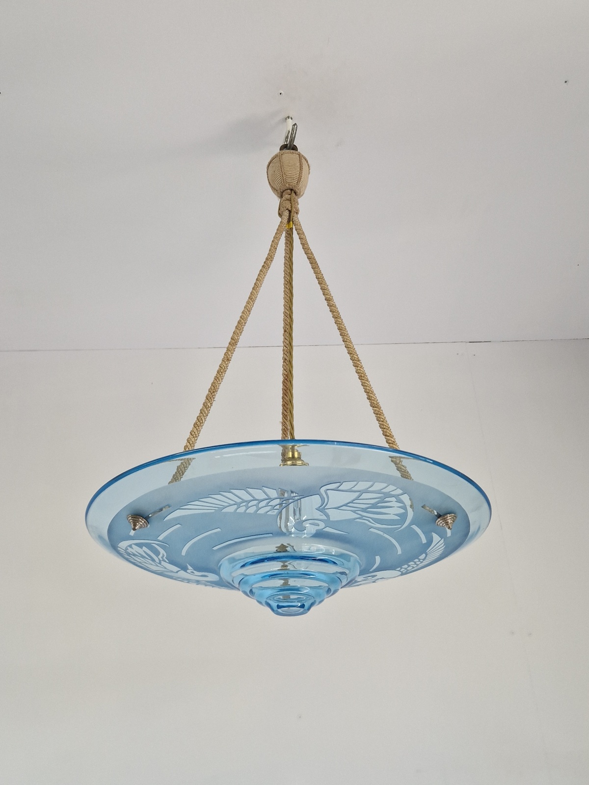 Product Code: JAL1201A rare & stylish art deco plafonnier signed by André Delatte, Nancy. The clear and acid-etched blue glass designed with storks and hangs with the original rope fitments for suspension. France c.1925