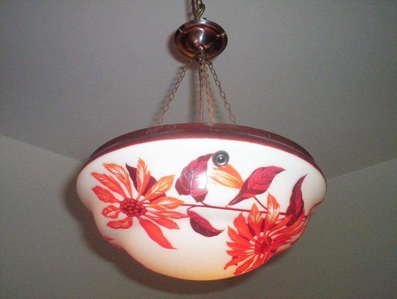 An opaline “faux-cameo” glass plafonnier, overlaid in red with a design of flowers and foliage, with bronzed metal replacement fitments for suspension. England, c.1930. Diam.36cm/14ins.