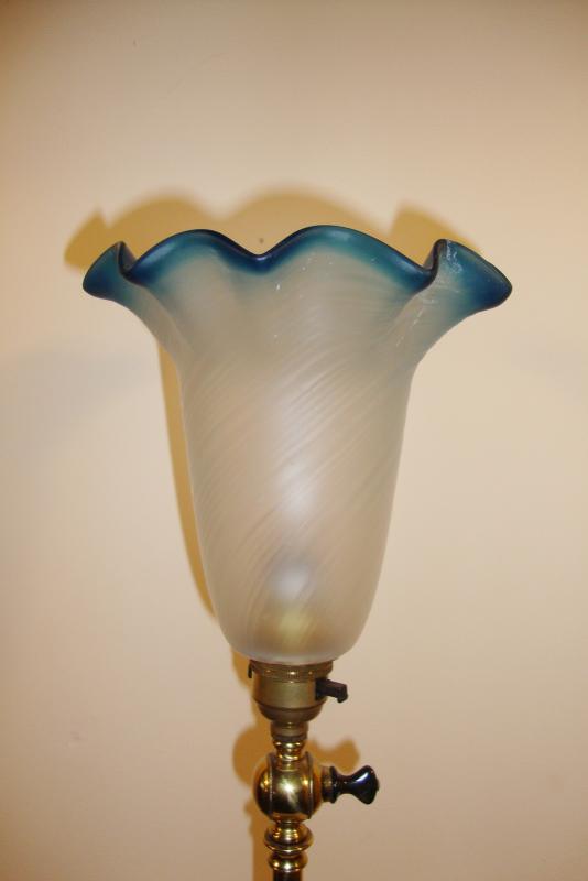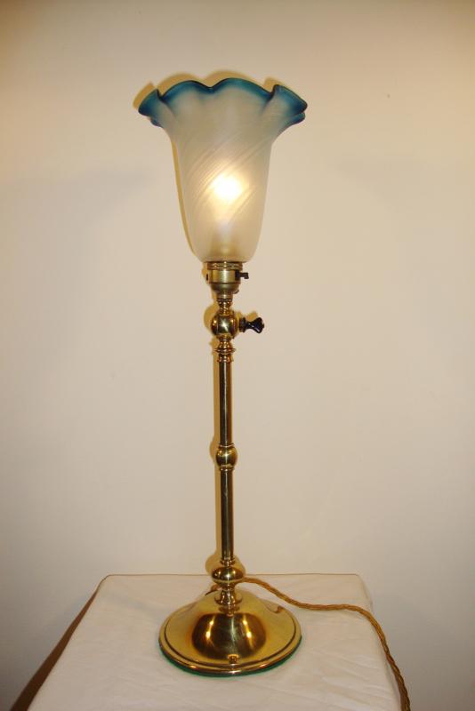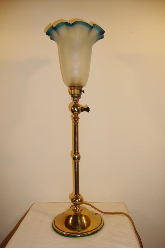 A pair of cast-brass table lamps with original switch mechanism, each supporting a deep-blue and satin-glass lampshade. England, c.1910.