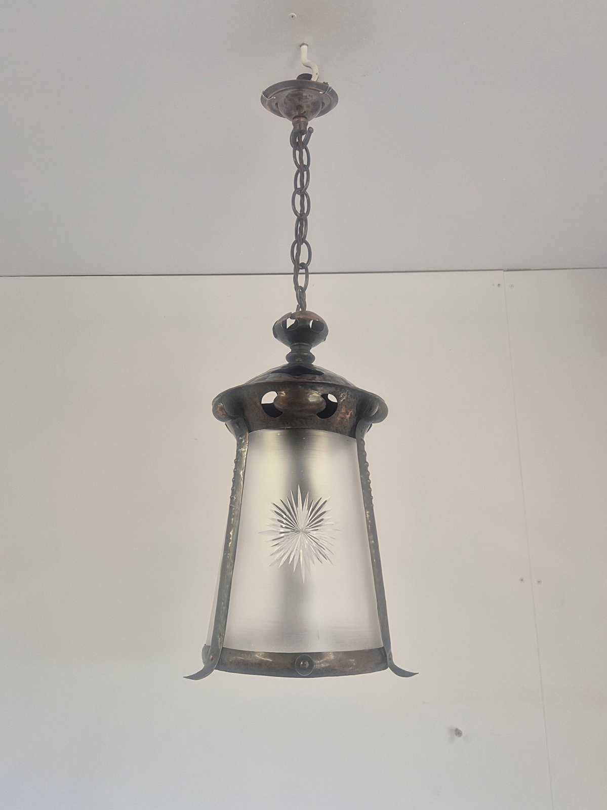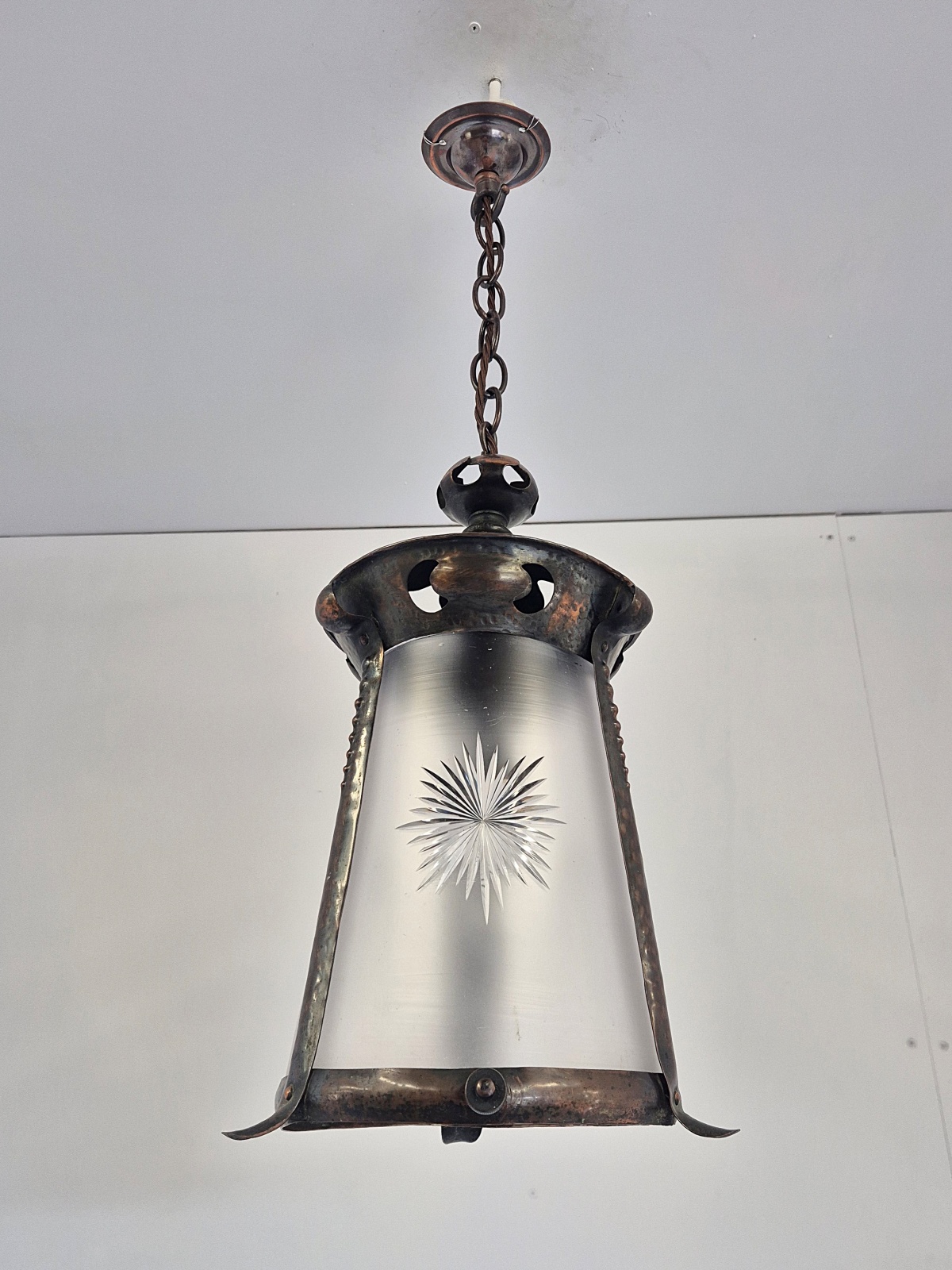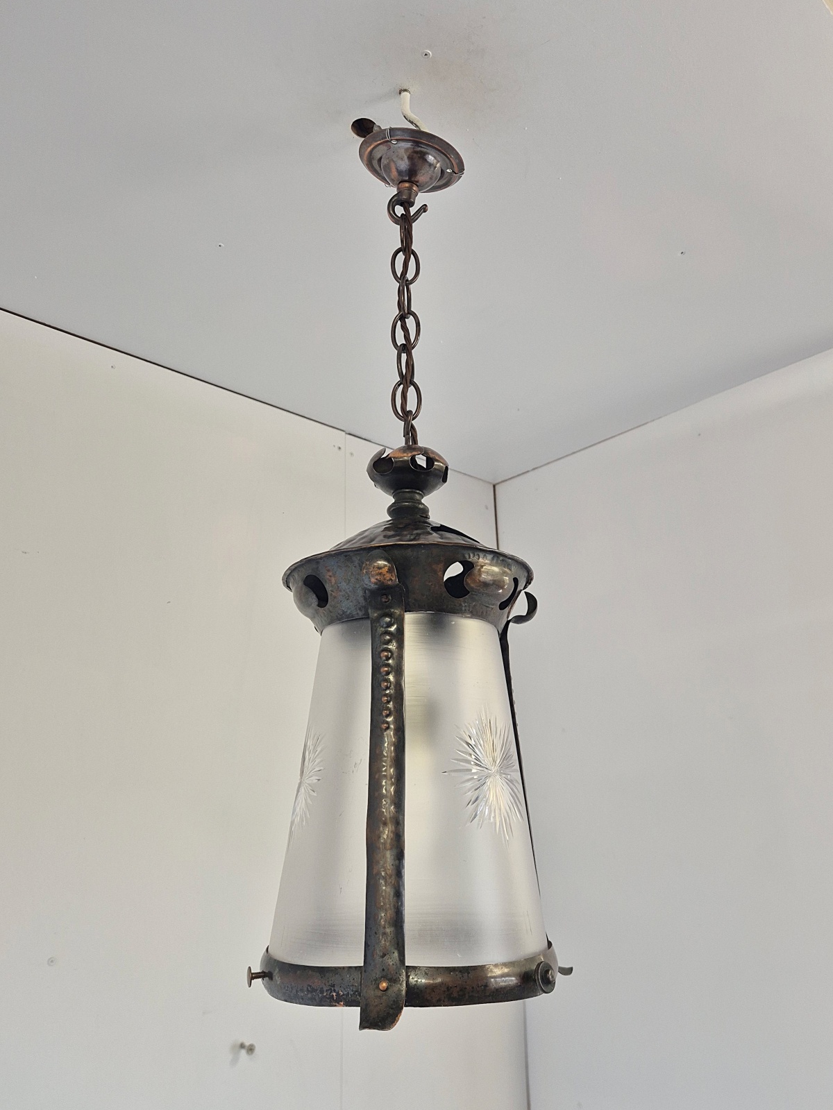 Product Code: LG835An oxidised-copper arts and crafts hall lantern with cut-glass insert attributed to J & W.B.Smith Ltd, London & Glasgow . England,c.1905