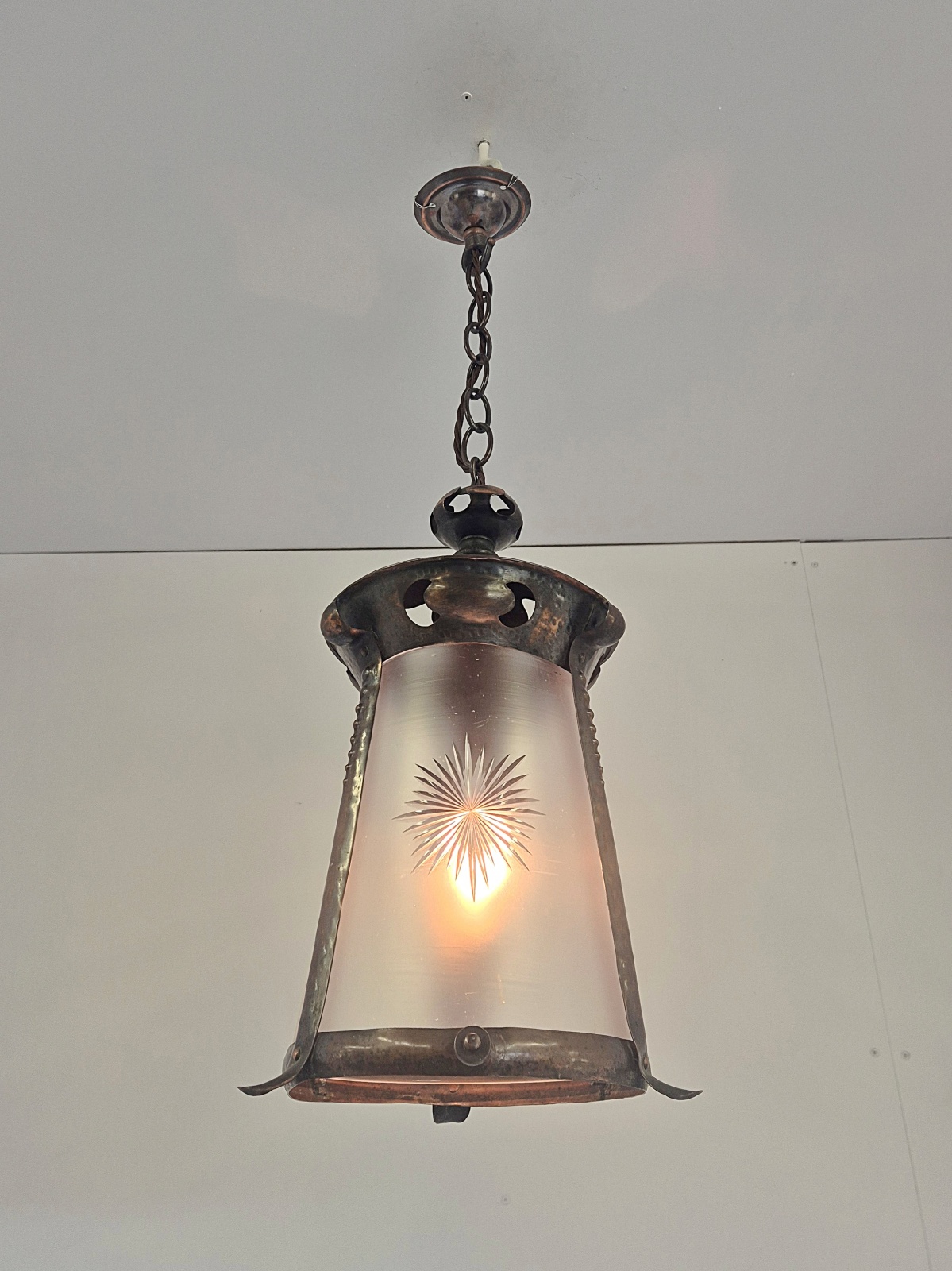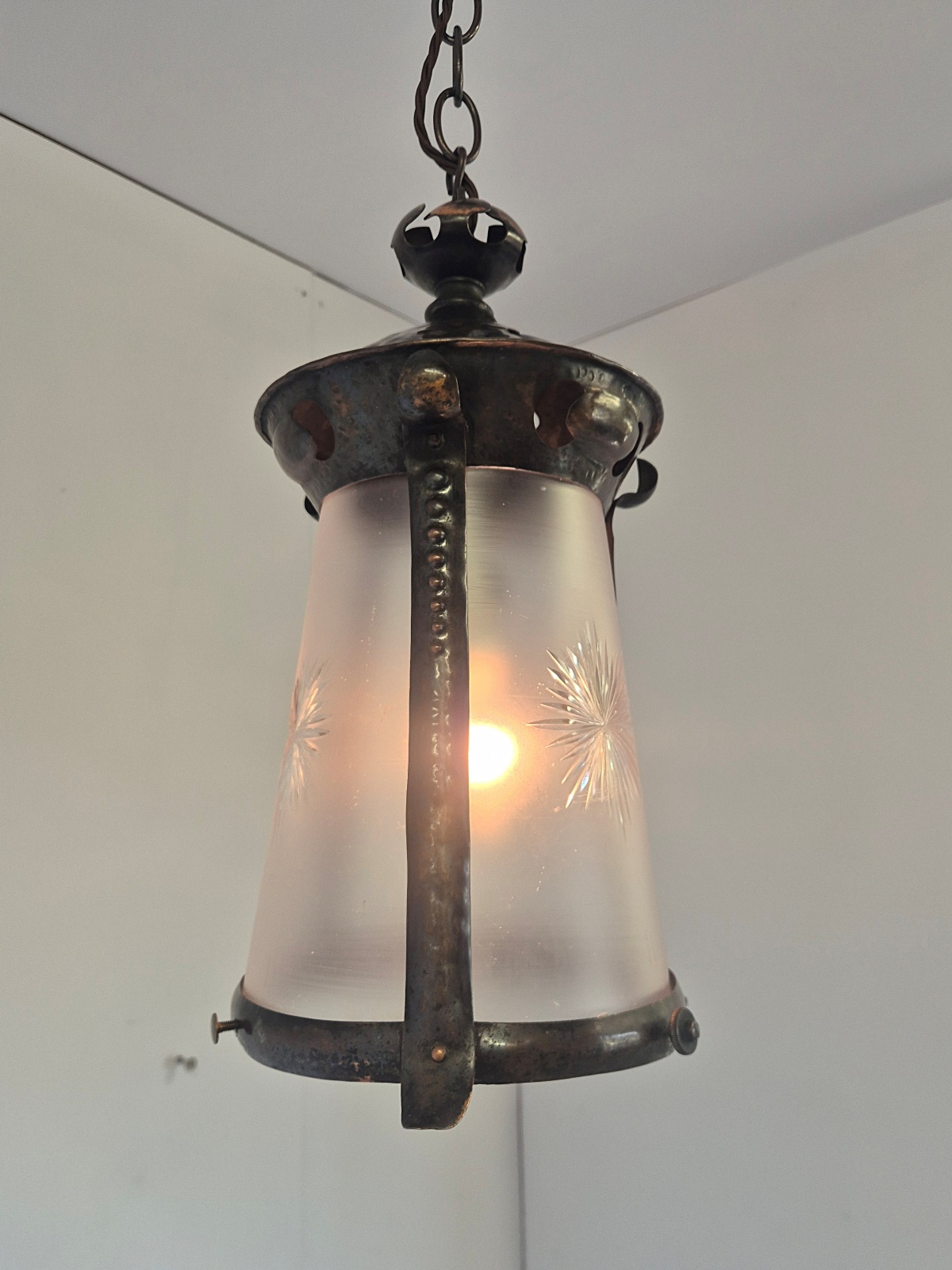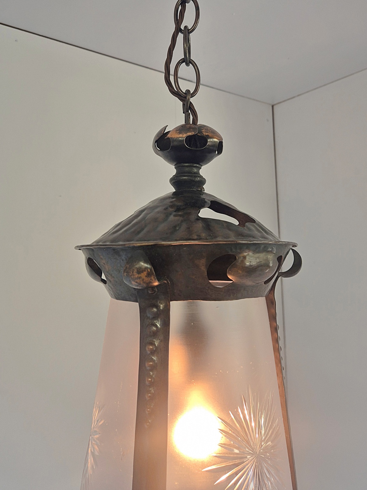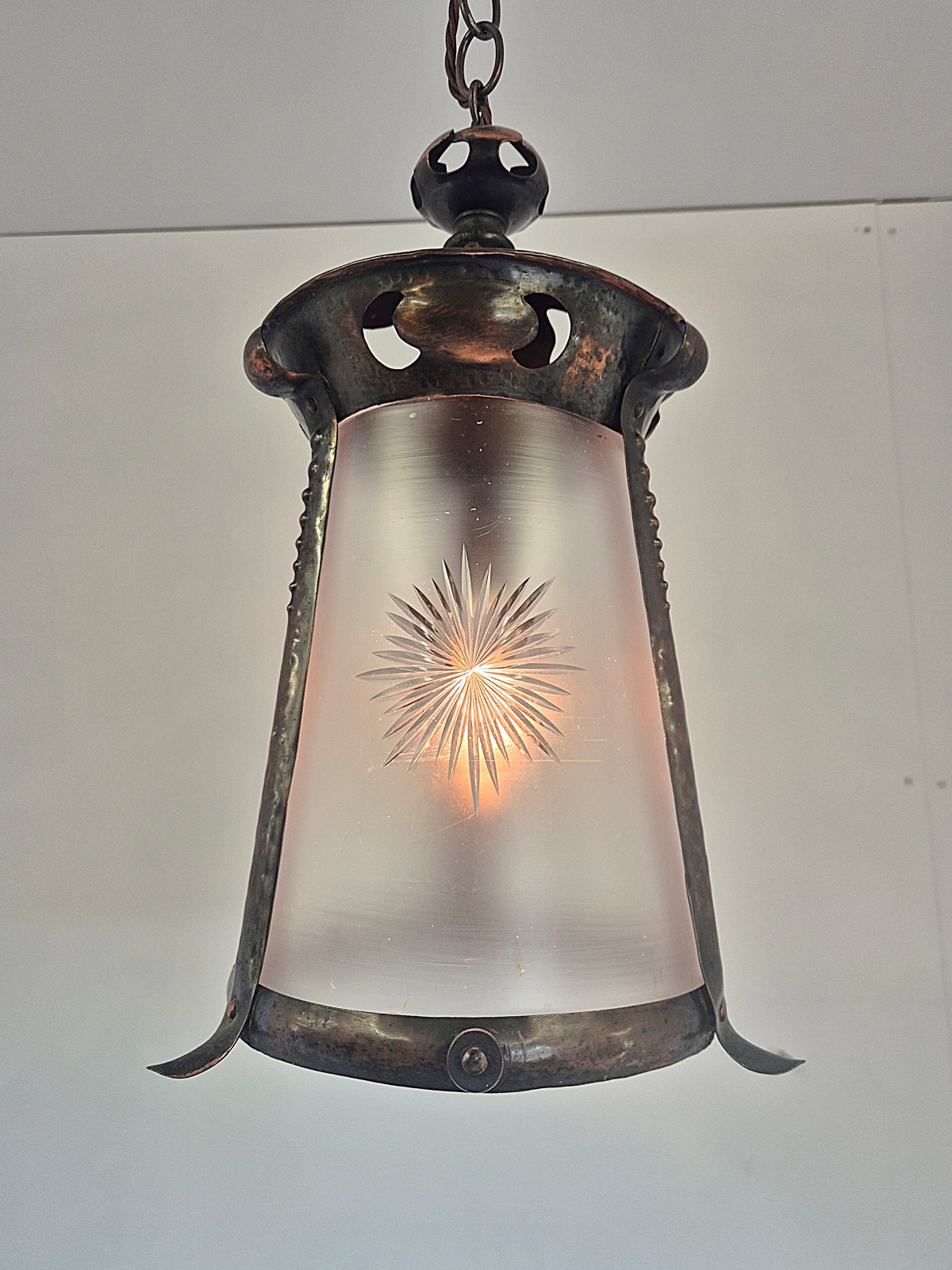 Product Code: LG835An oxidised-copper arts and crafts hall lantern with cut-glass insert attributed to J & W.B.Smith Ltd, London & Glasgow . England,c.1905