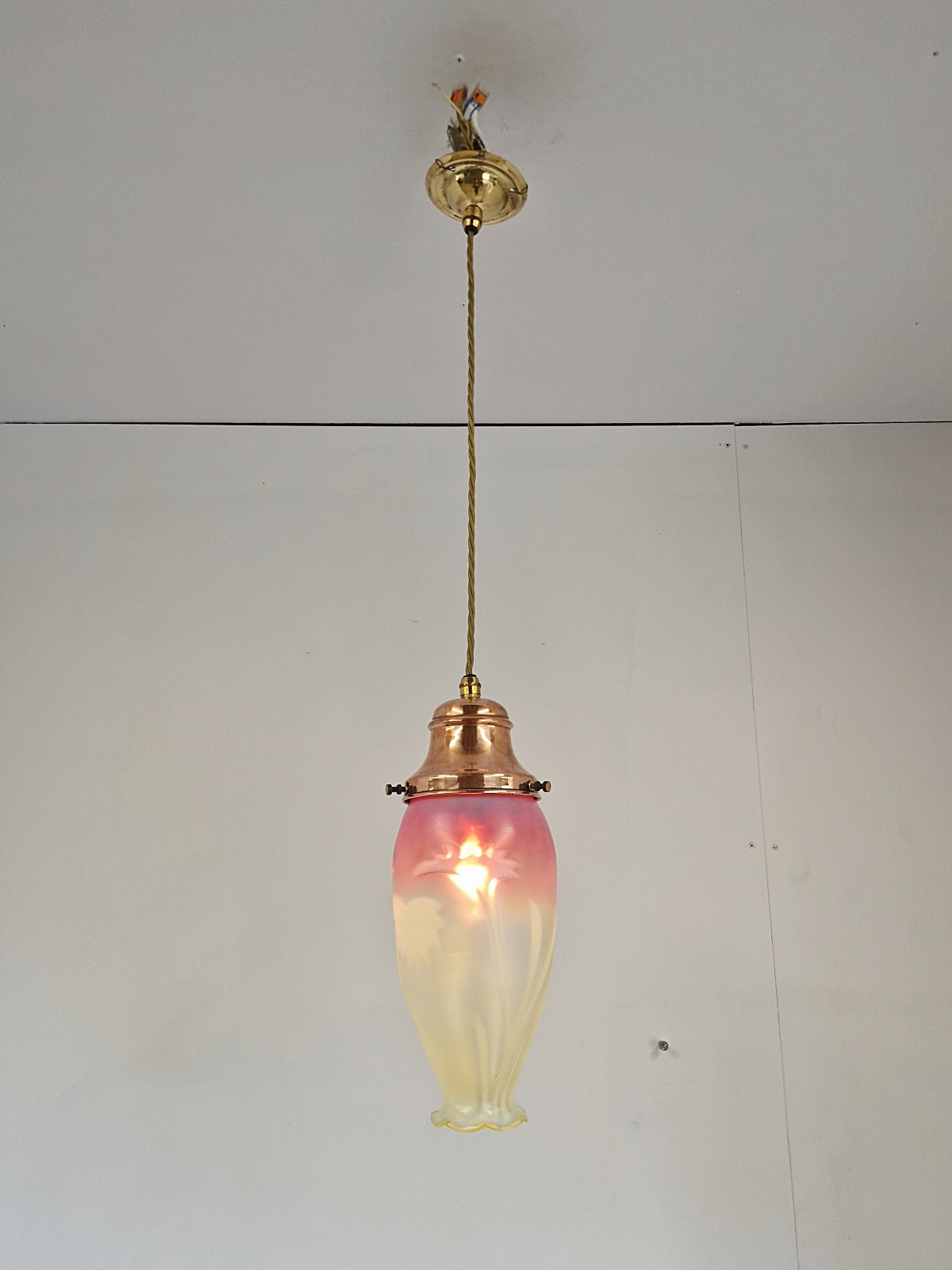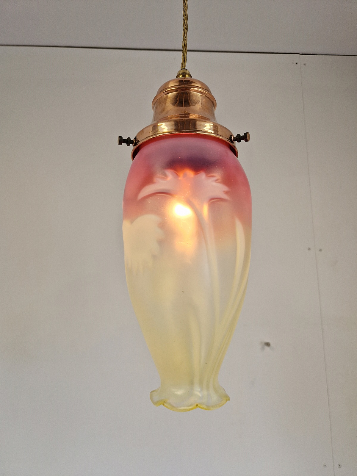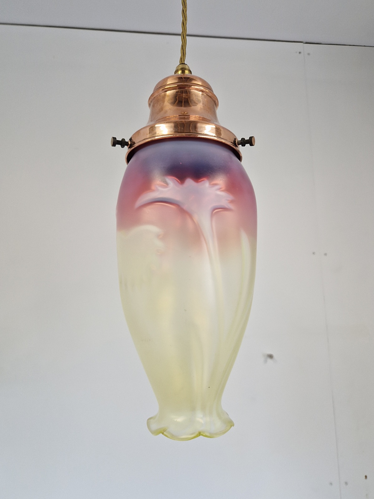 A rare pair of cranberry and vaseline-glass lampshades with unusual floral design attributed to John Walsh Walsh of Birmingham. Suspended with period copper gallery and replacement ceiling rose. England c.1900