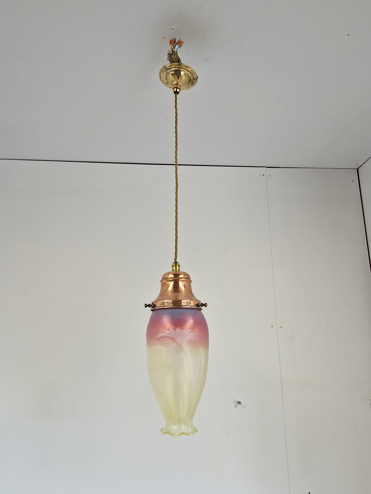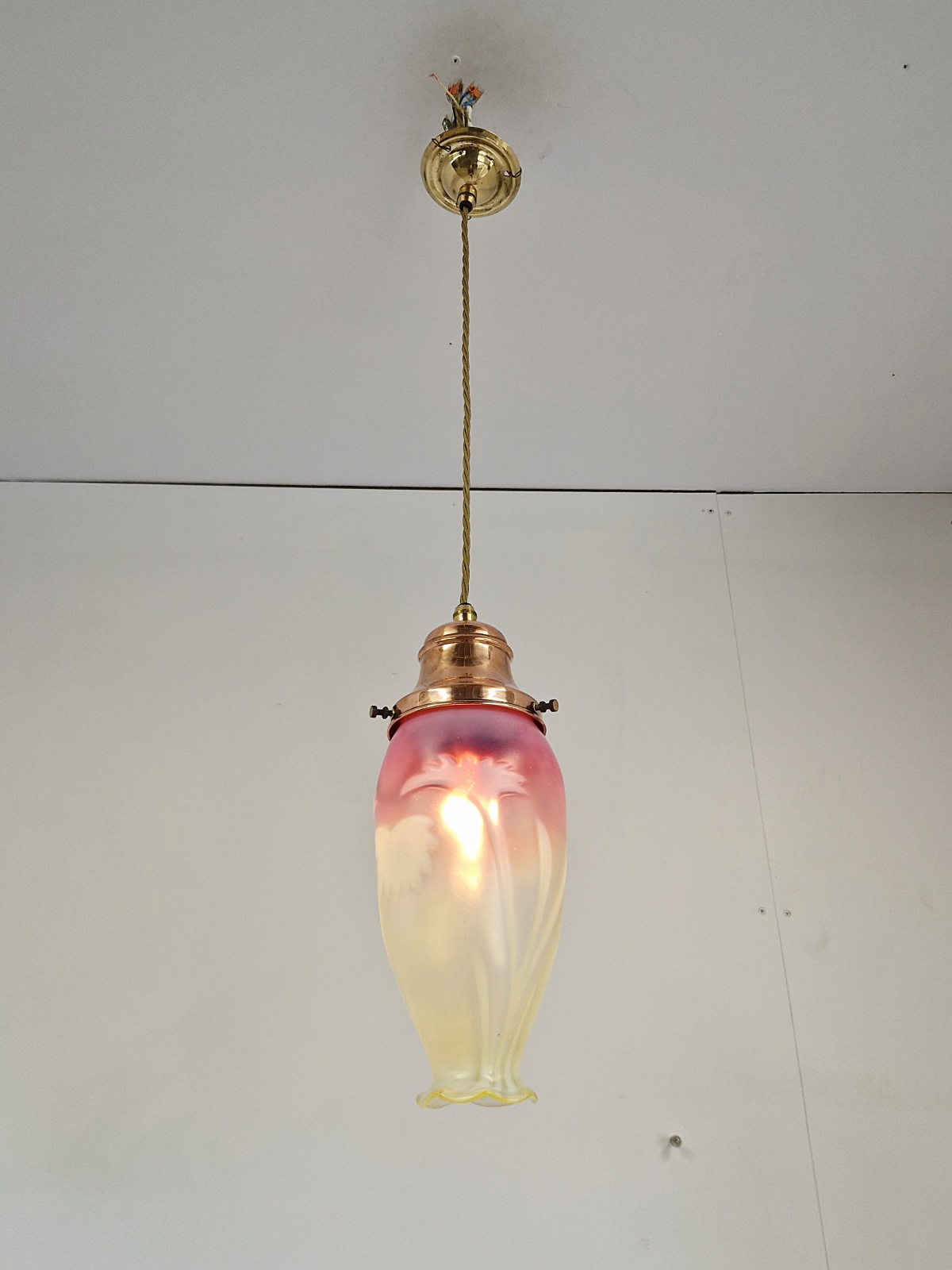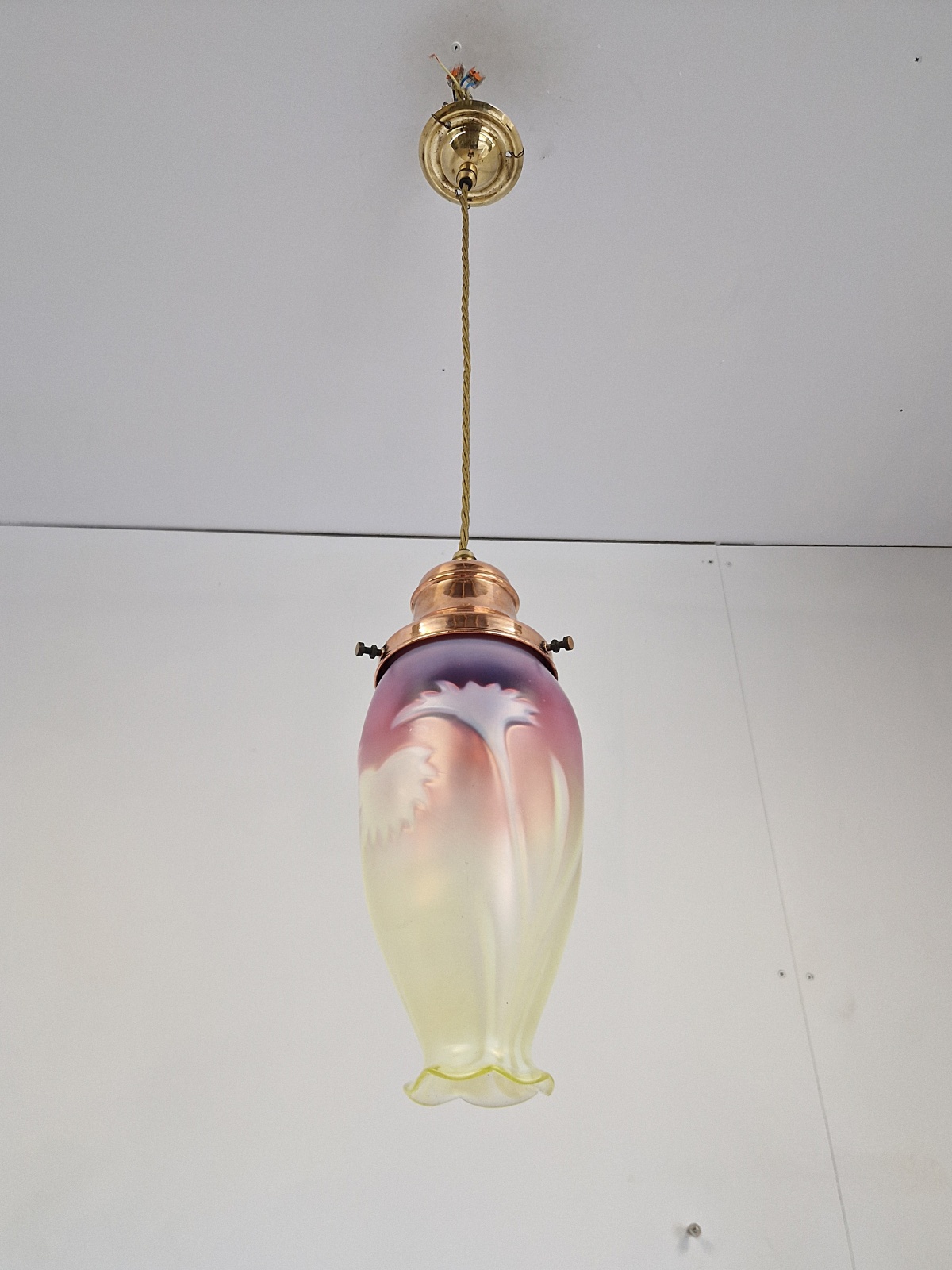 A rare pair of cranberry and vaseline-glass lampshades with unusual floral design attributed to John Walsh Walsh of Birmingham. Suspended with period copper gallery and replacement ceiling rose. England c.1900