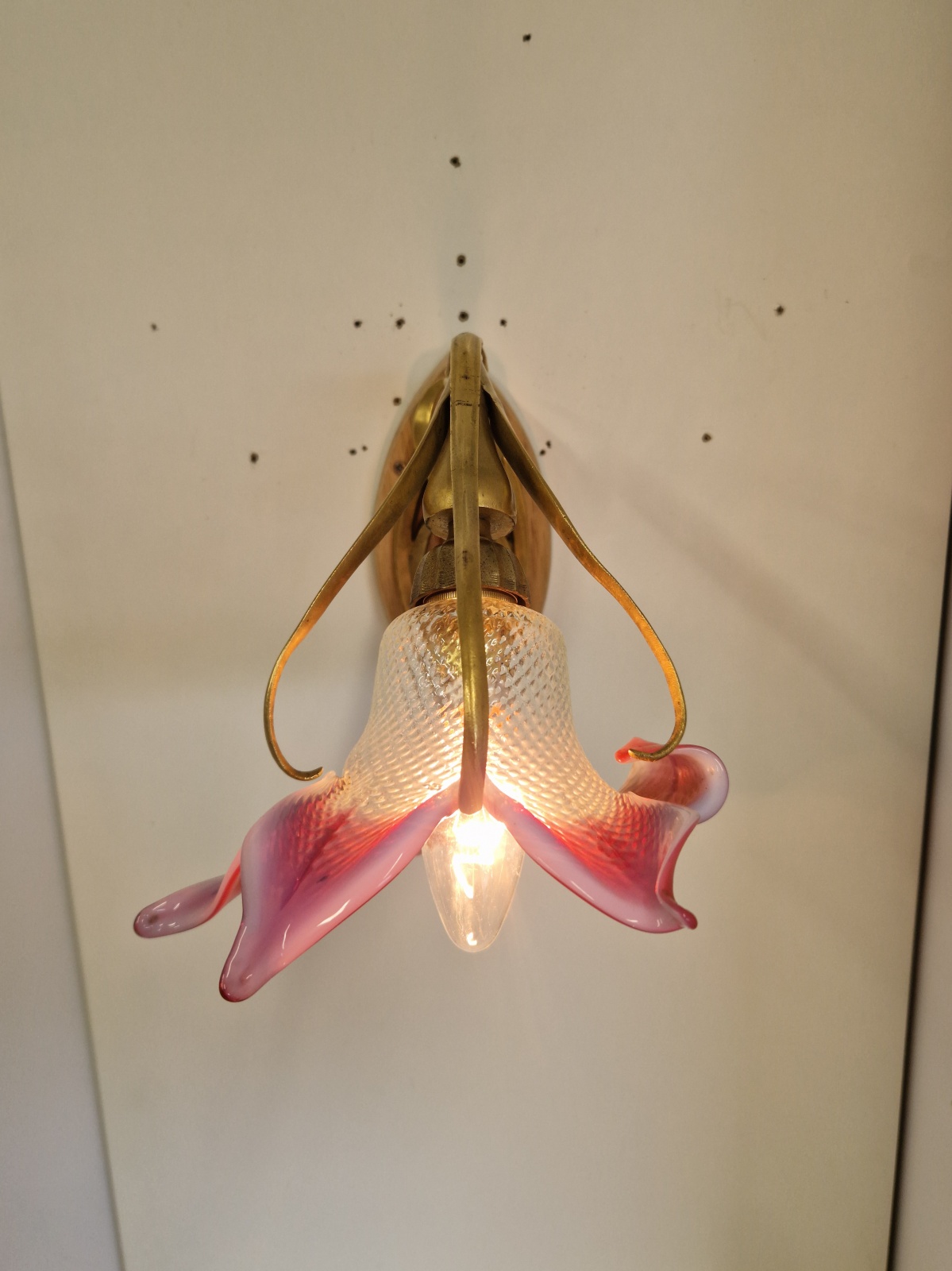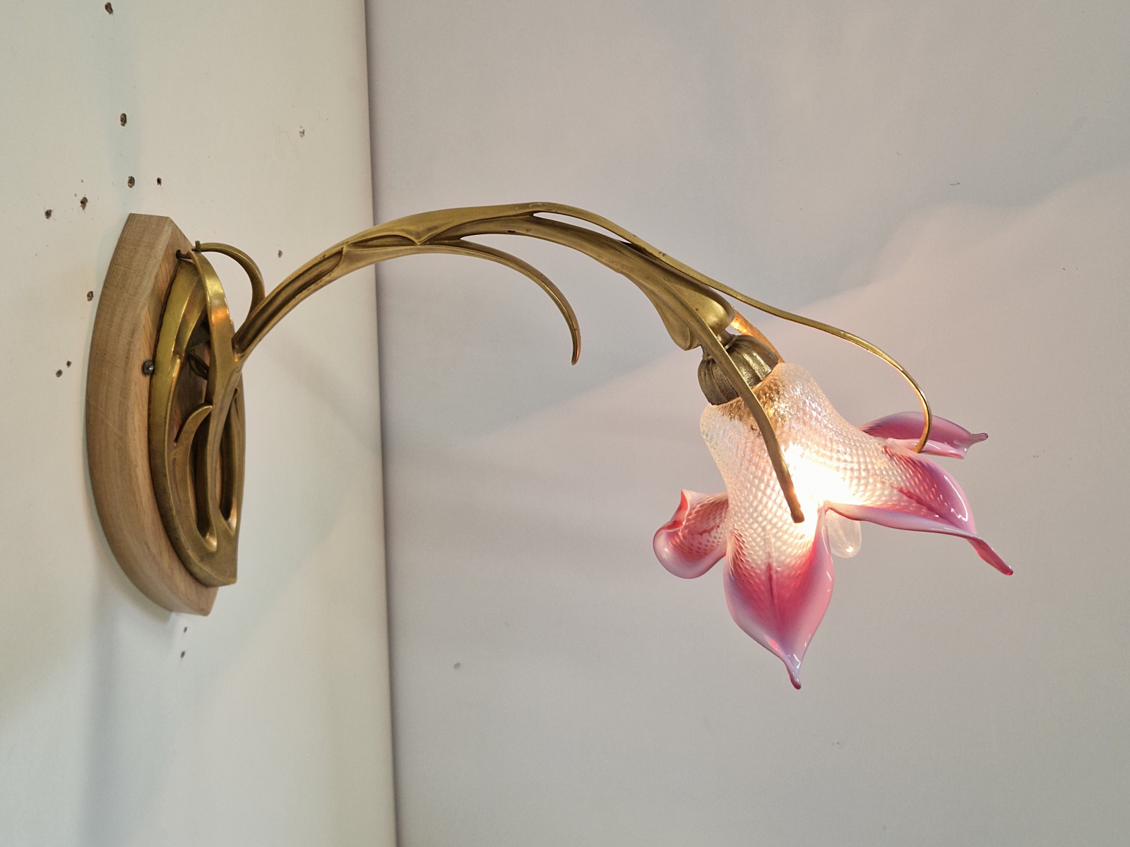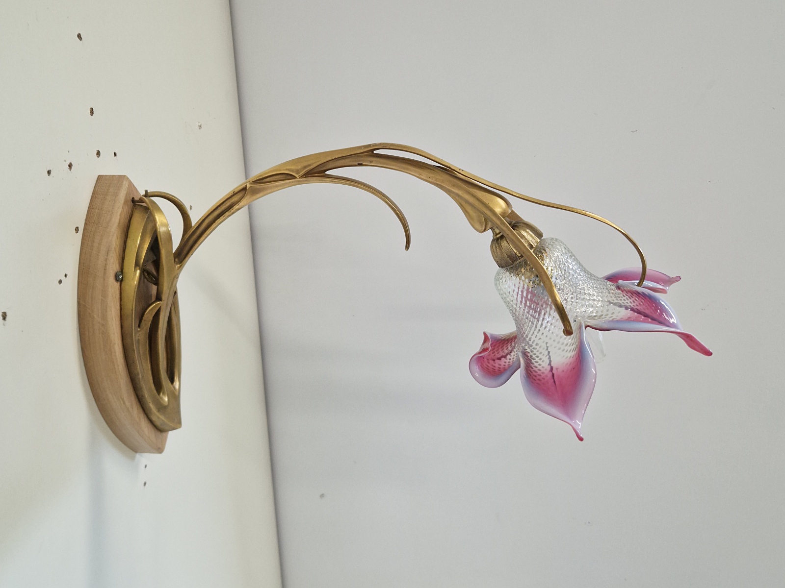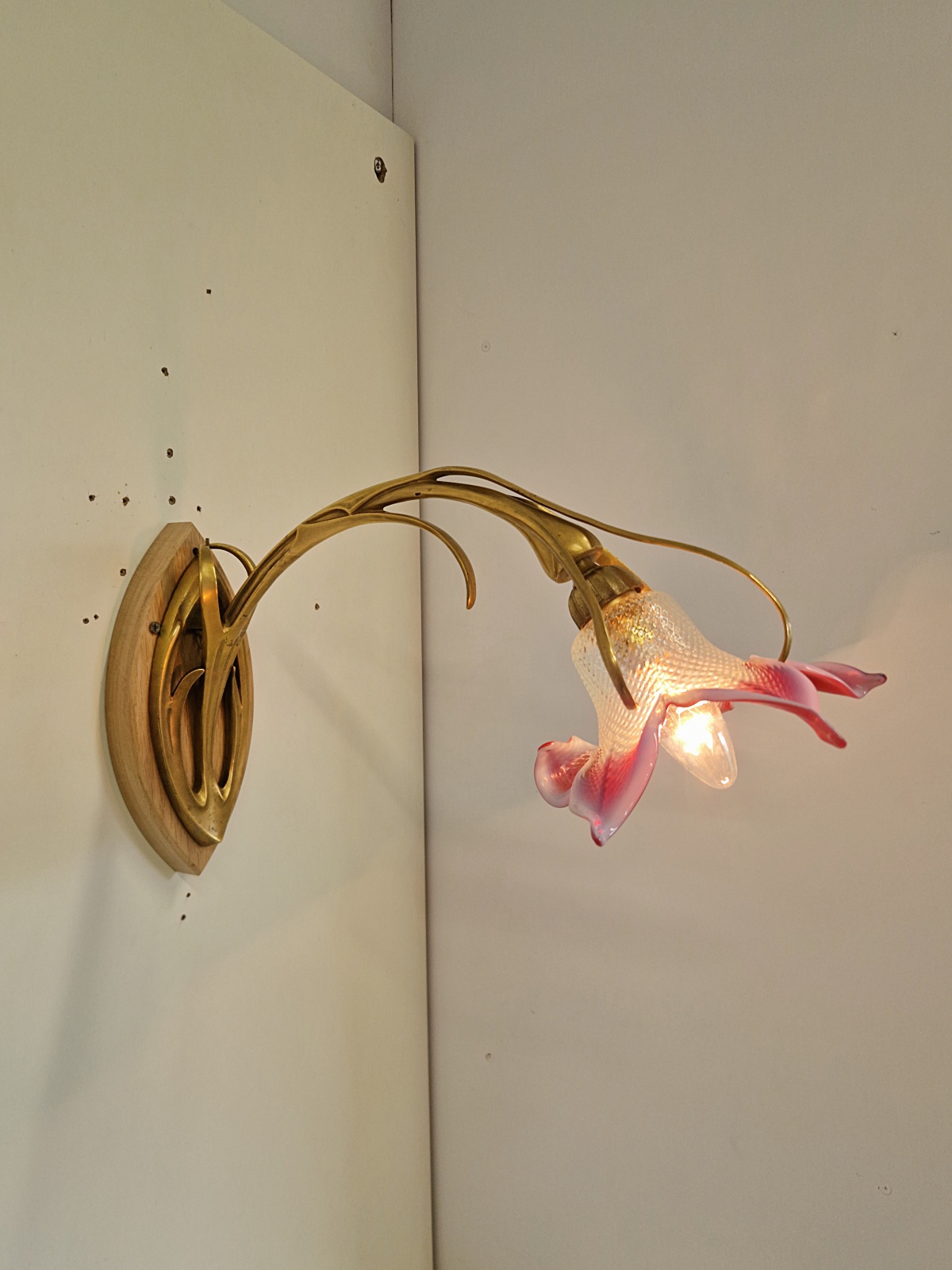 A pair important gilt-bronze wall lights of organic art nouveau form almost certainly designed and executed by Maurice Dufrene for La Société des Artistes Français but apparently unsigned. Both wall lights maintain their original gilding but the patina of each bracket is ever so slightly different to each other. The orignal, delicate and exquistly blown French lily lampshades are of a light blue opalecence to the body with strong pink/cranberry  shading to the tips.   France c.1905