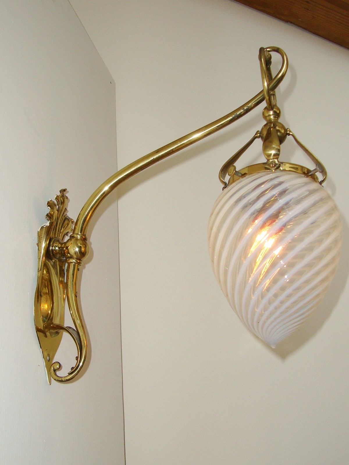 Product Code: JAL0152A pair of brass art nouveau wall lights by The Generel Electric Company (G.E.C) the integral shade carriers each supporting an attractive vaseline glass globular lampshade by James Powell & Sons. England c1905