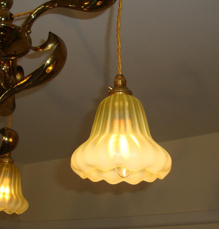 Product Code: JAL0169A pair of art nouveau brass hanging lamps of near identical design attributed to William Whitehouse & Co. each supporting a good quality Vaseline-glass lampshade attributed to James Powell & Sons. England, c.1905.