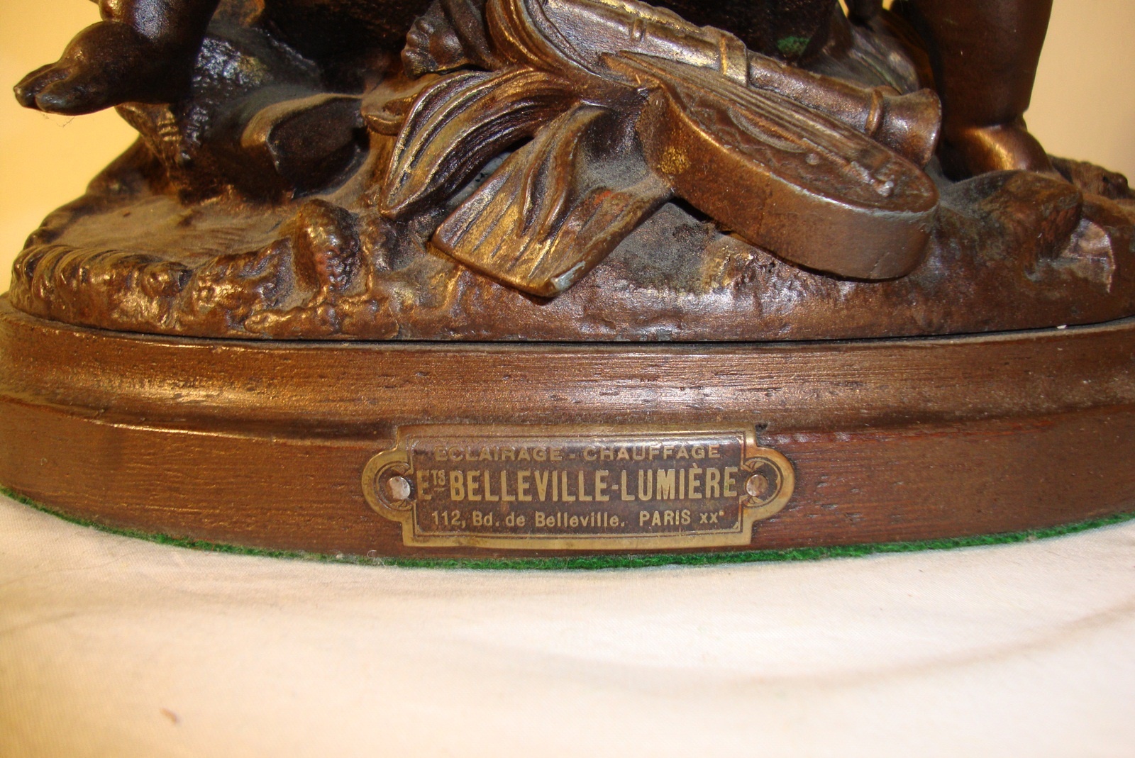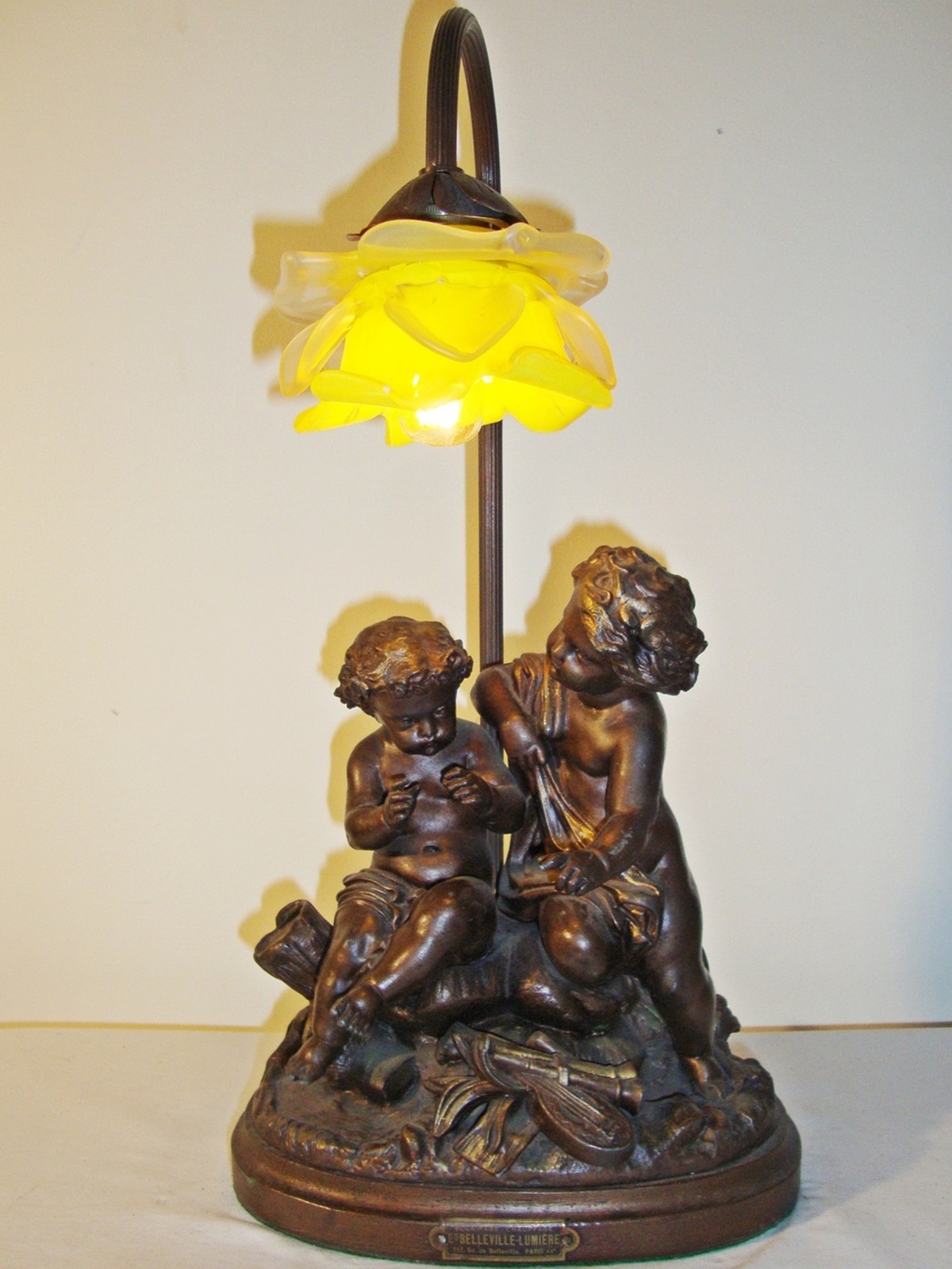 A good bronzed spelter table lamp group designed as two putti in contemplation, illuminated from above with a yellow “rose-petal” lampshade, signed on the applied plaque “Belleville Lumiere”. France c1900