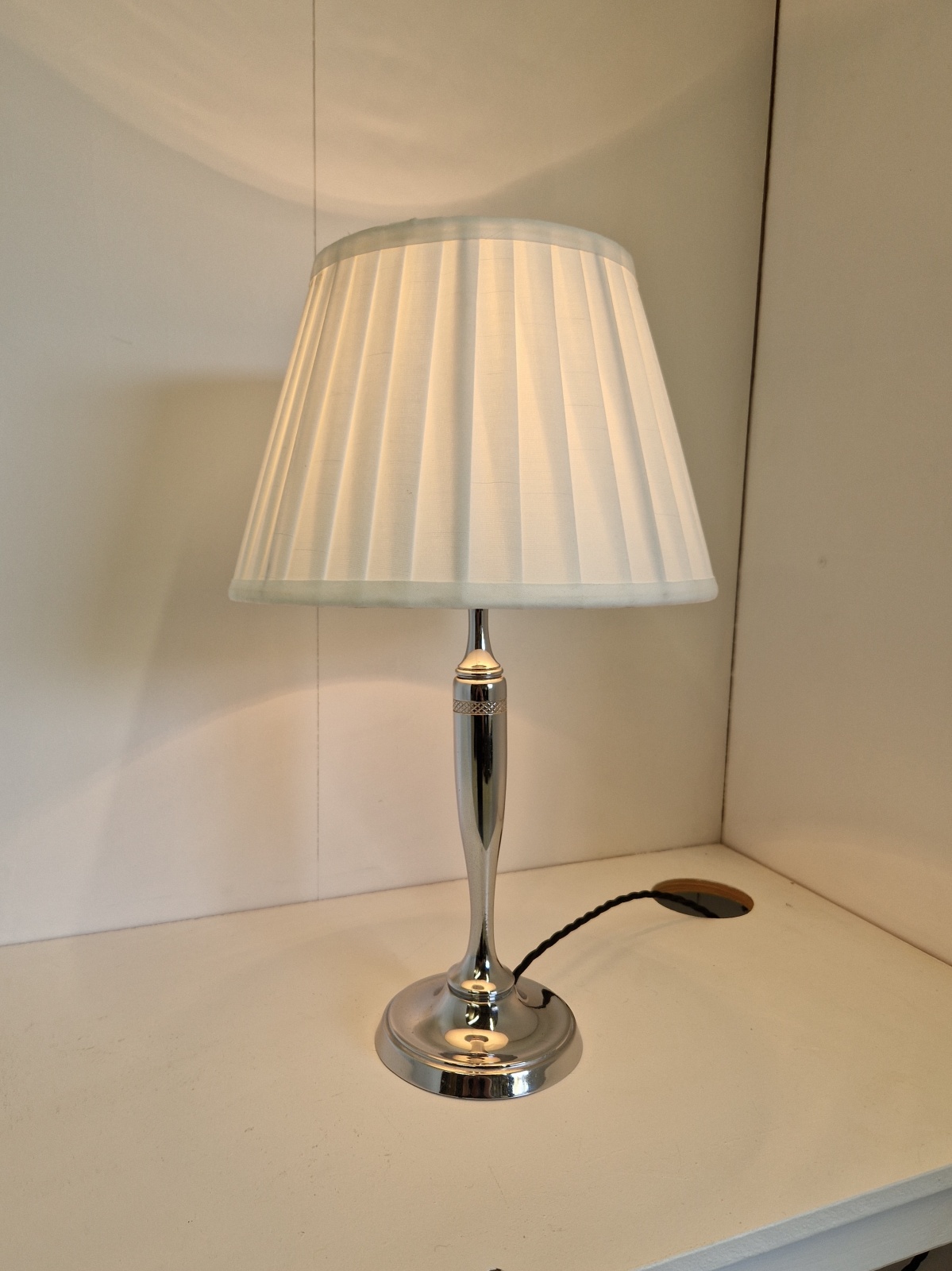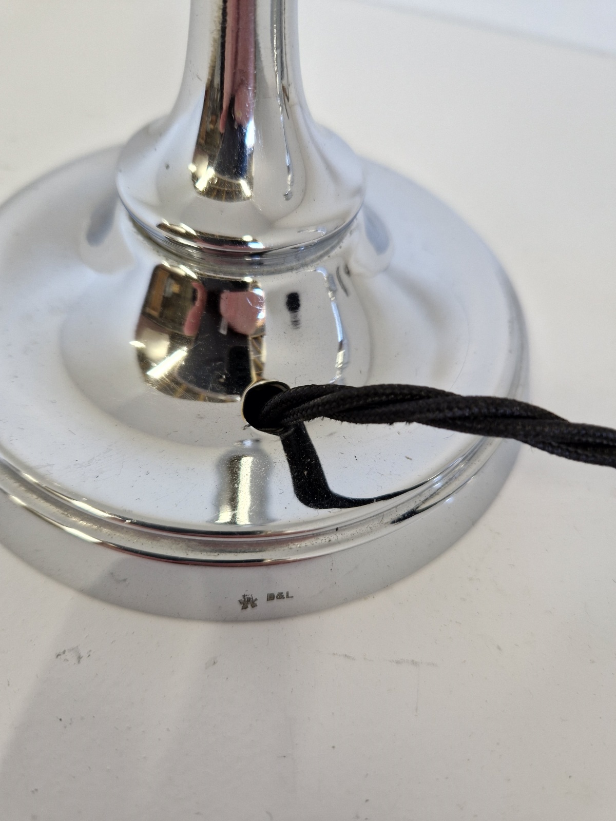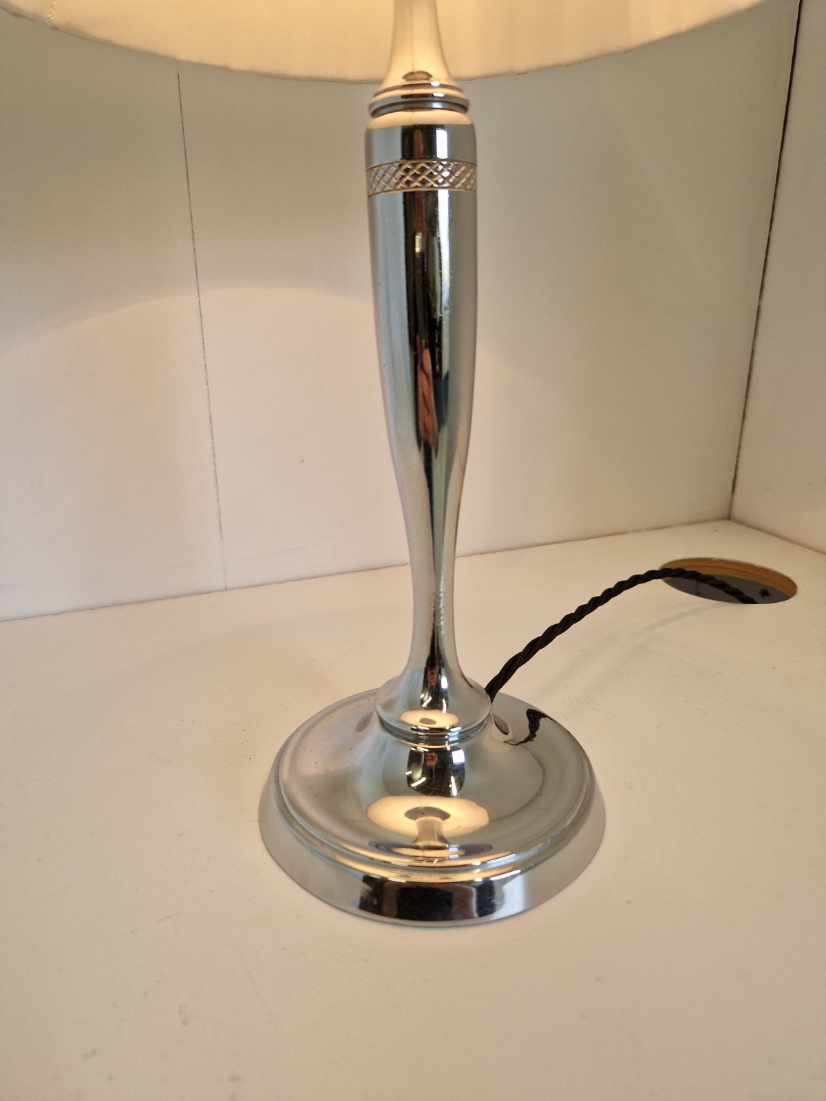 Product Code: LG677A pair of traditional chrome-plated Edwardian table standards signed by Best & Lloyd, Birmingham displayed with modern fabric lampshade (Not Included). England c.1910