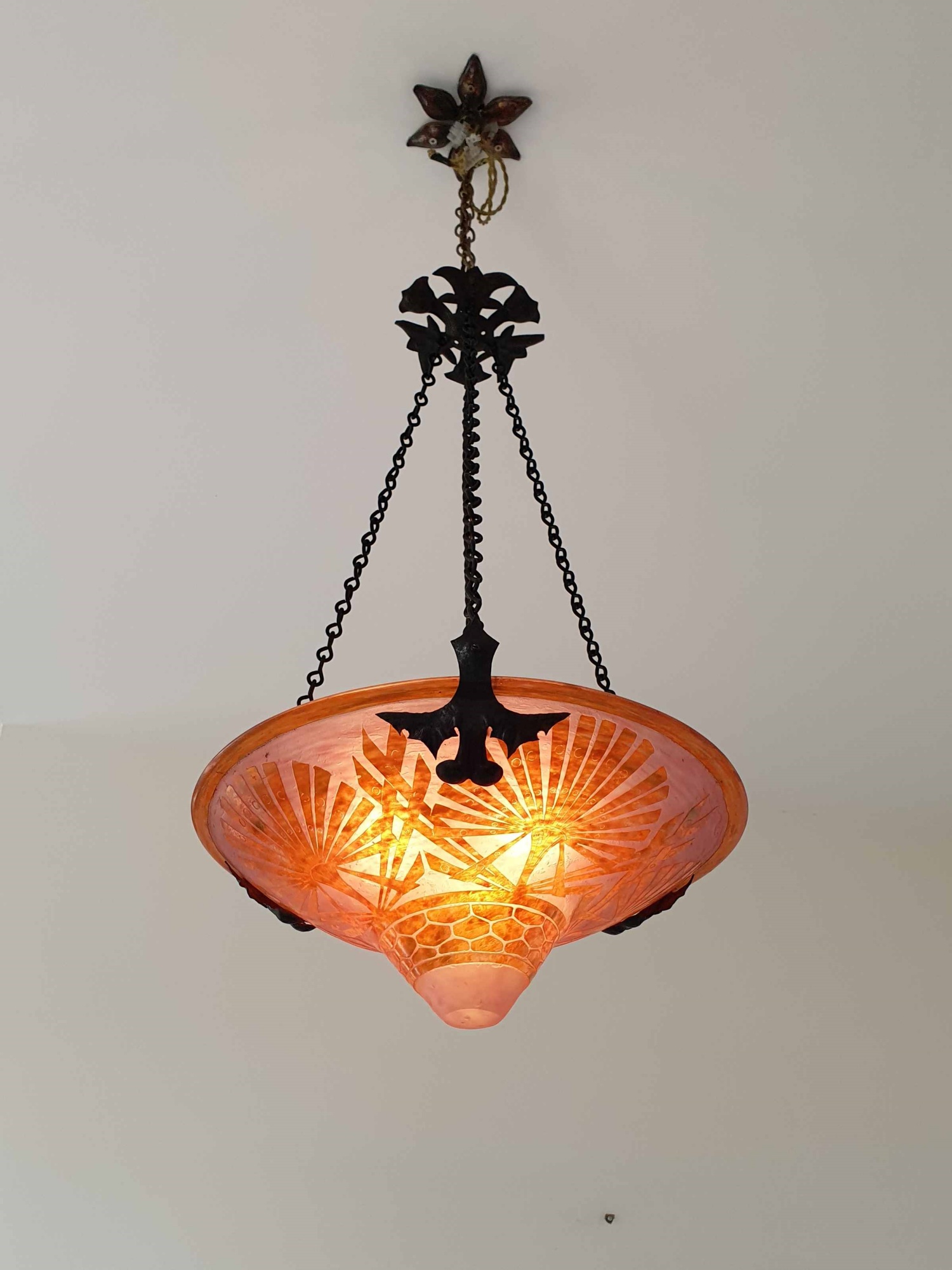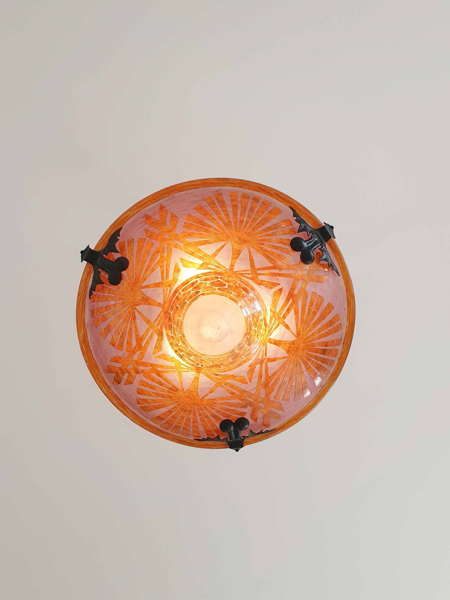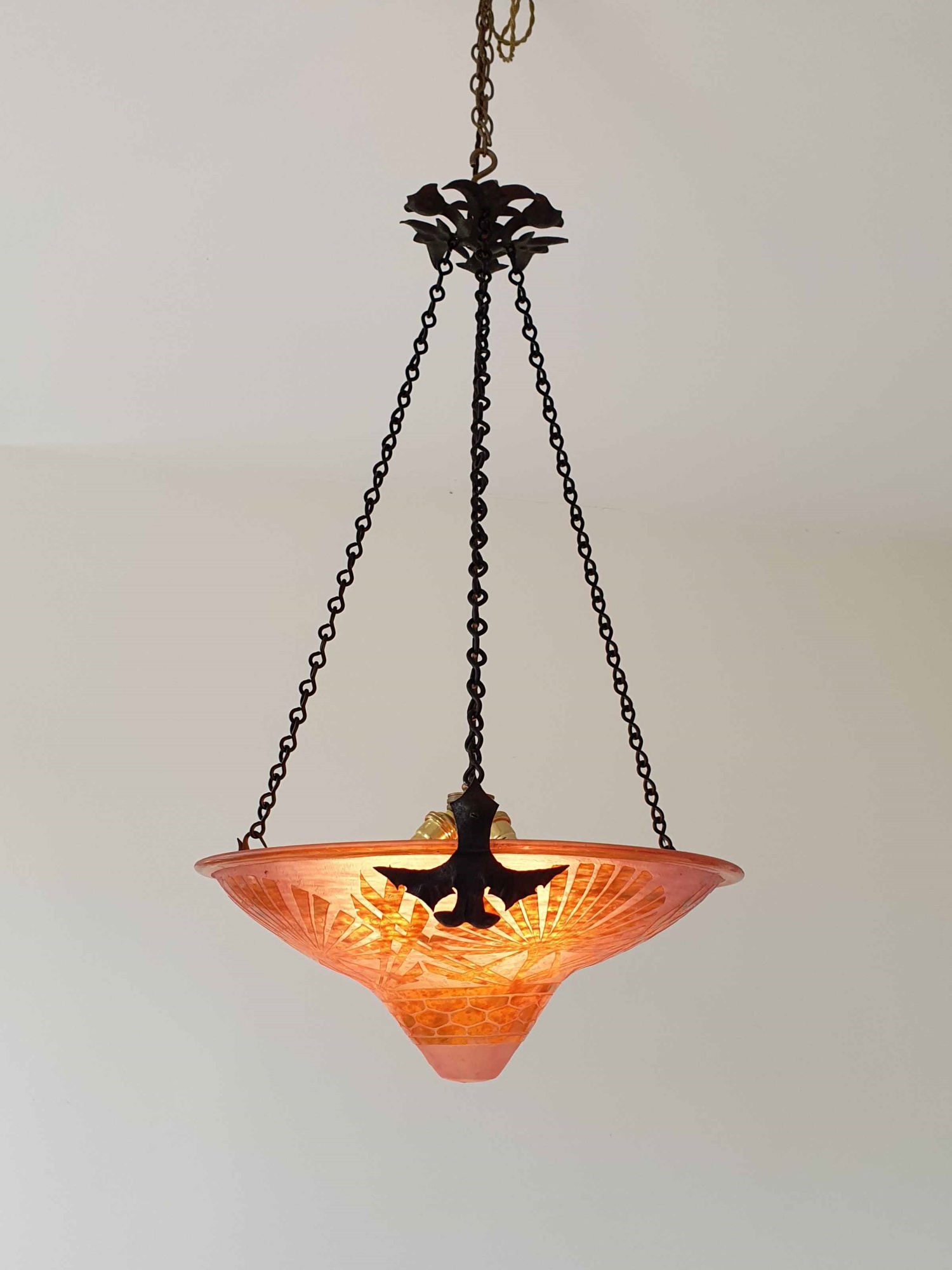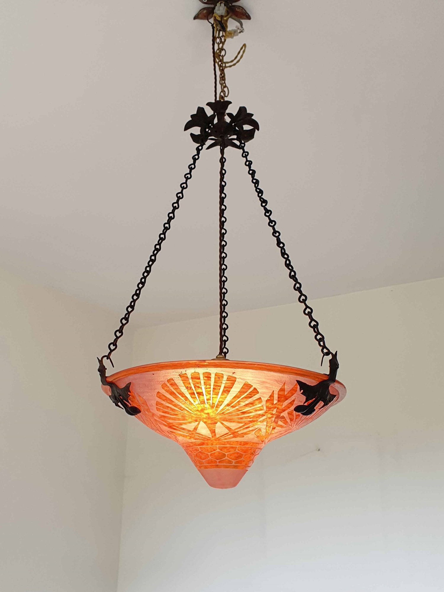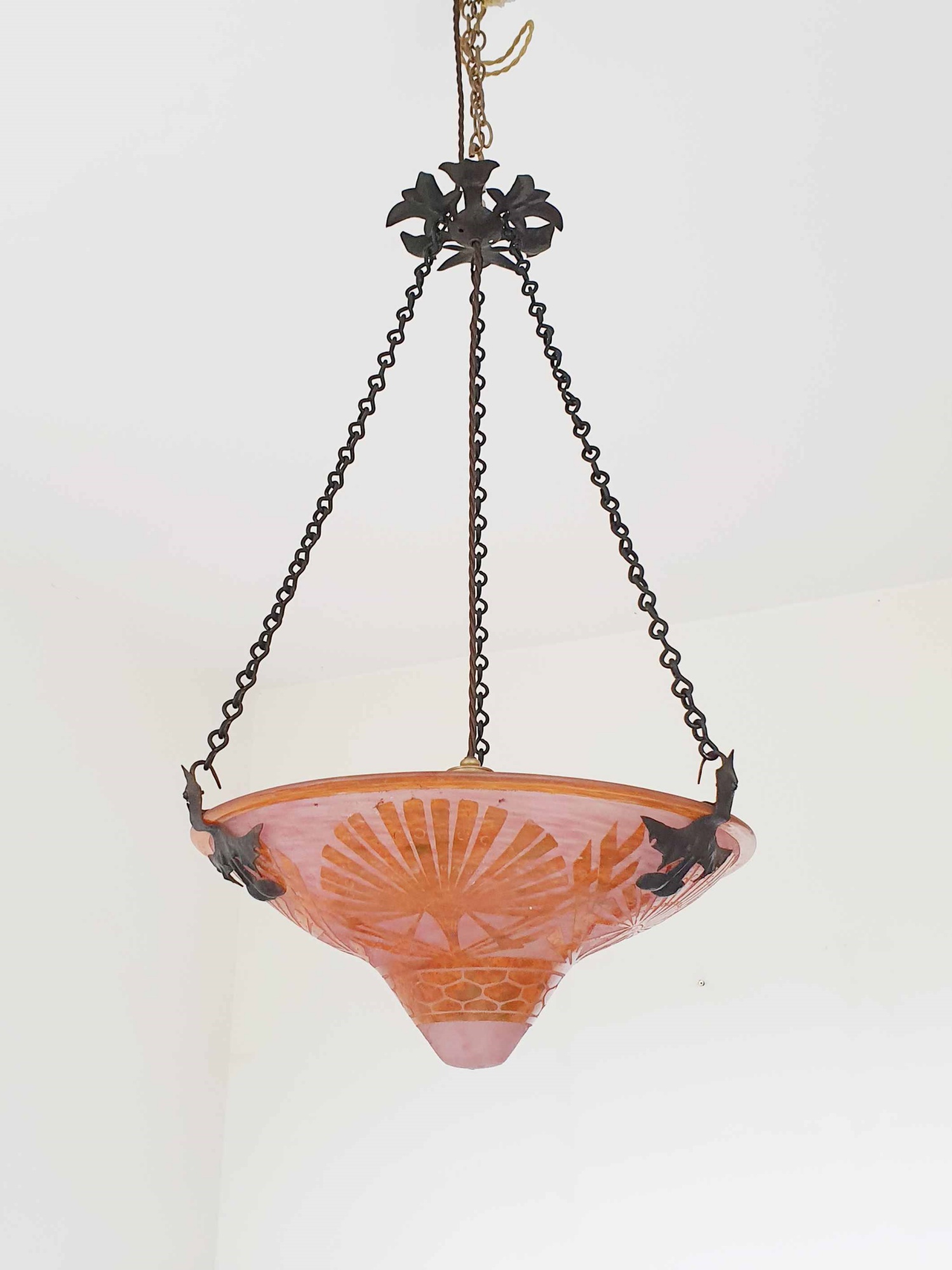 A “Le Verre Francais” cameo-glass plafonnier, designed with stylised orange foliage overlaid on pink, apparently unsigned, with original iron chains and ceiling hook for suspension. France c1922.