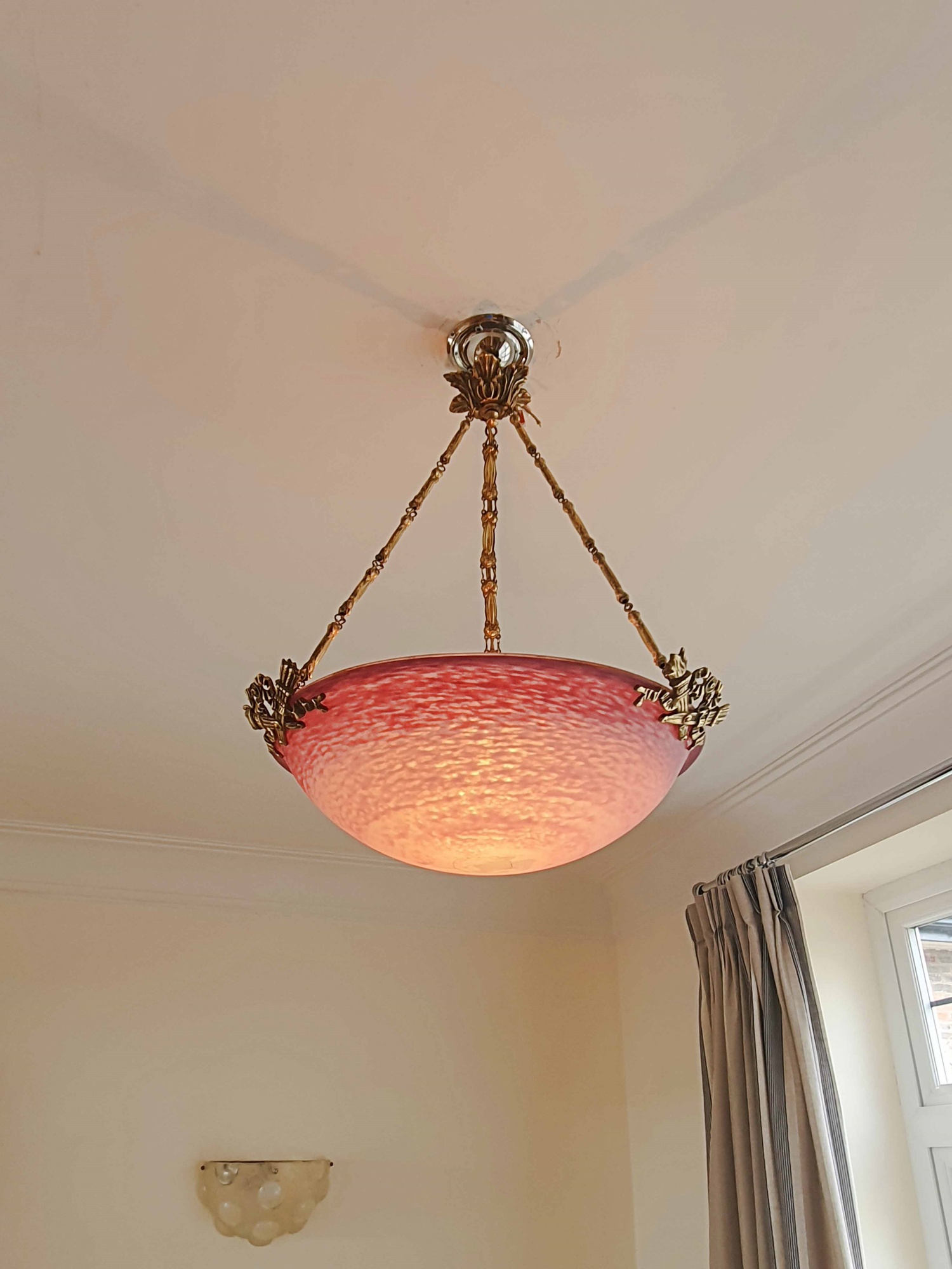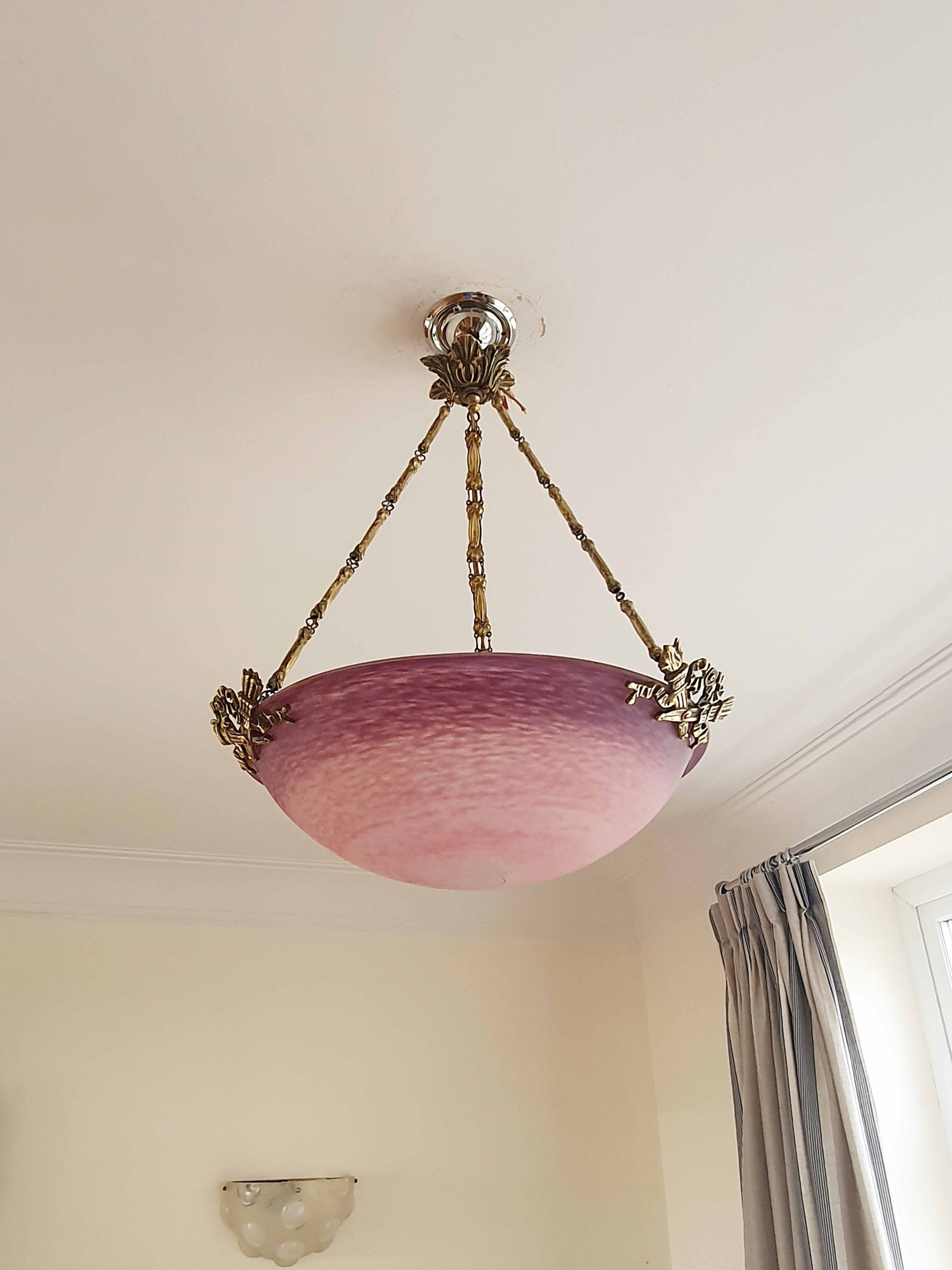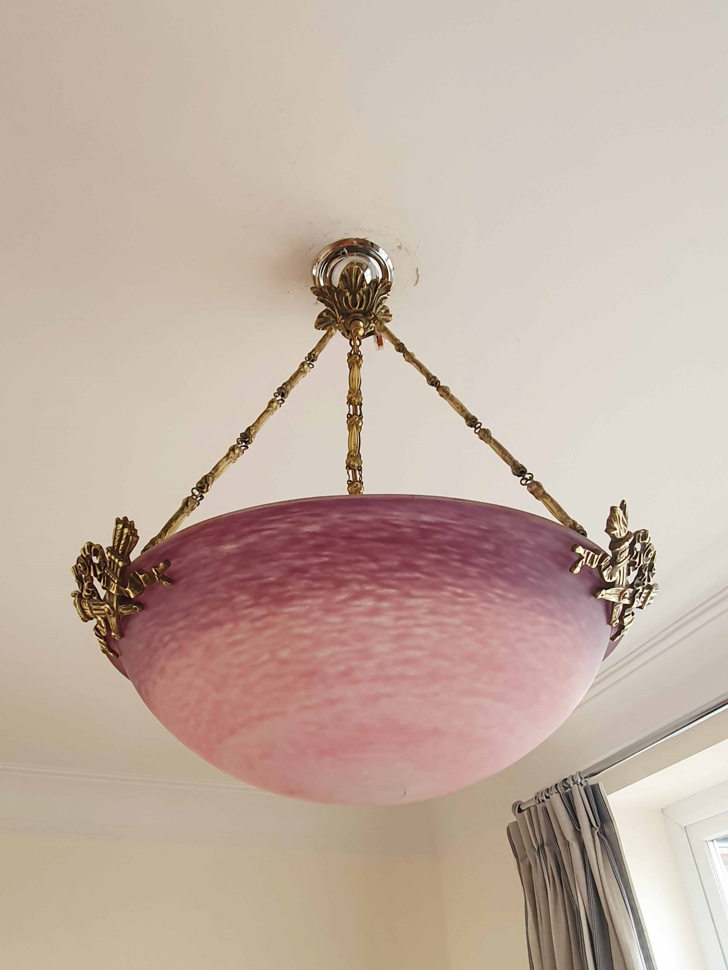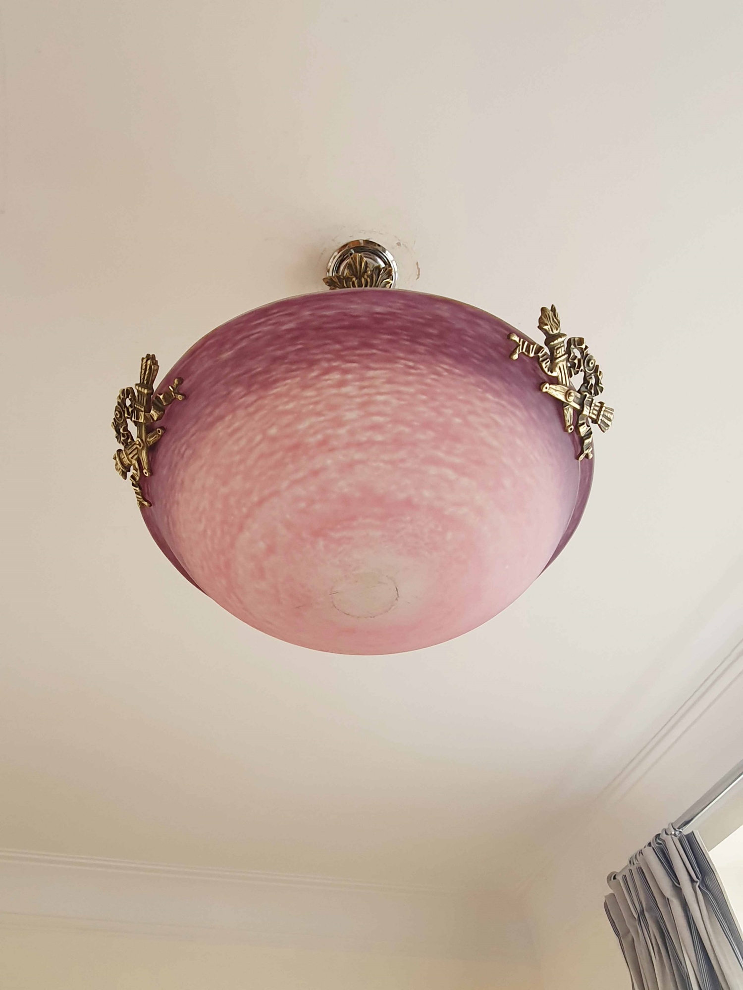 Product Code: JAL0821bA mottled glass “pate-de-verre” plafonnier shaded from pink to violet complimented with its original decorative brass finials, chain and ceiling rose. Signed with engraved mark “Schneider” to the plafonnier. France c1925