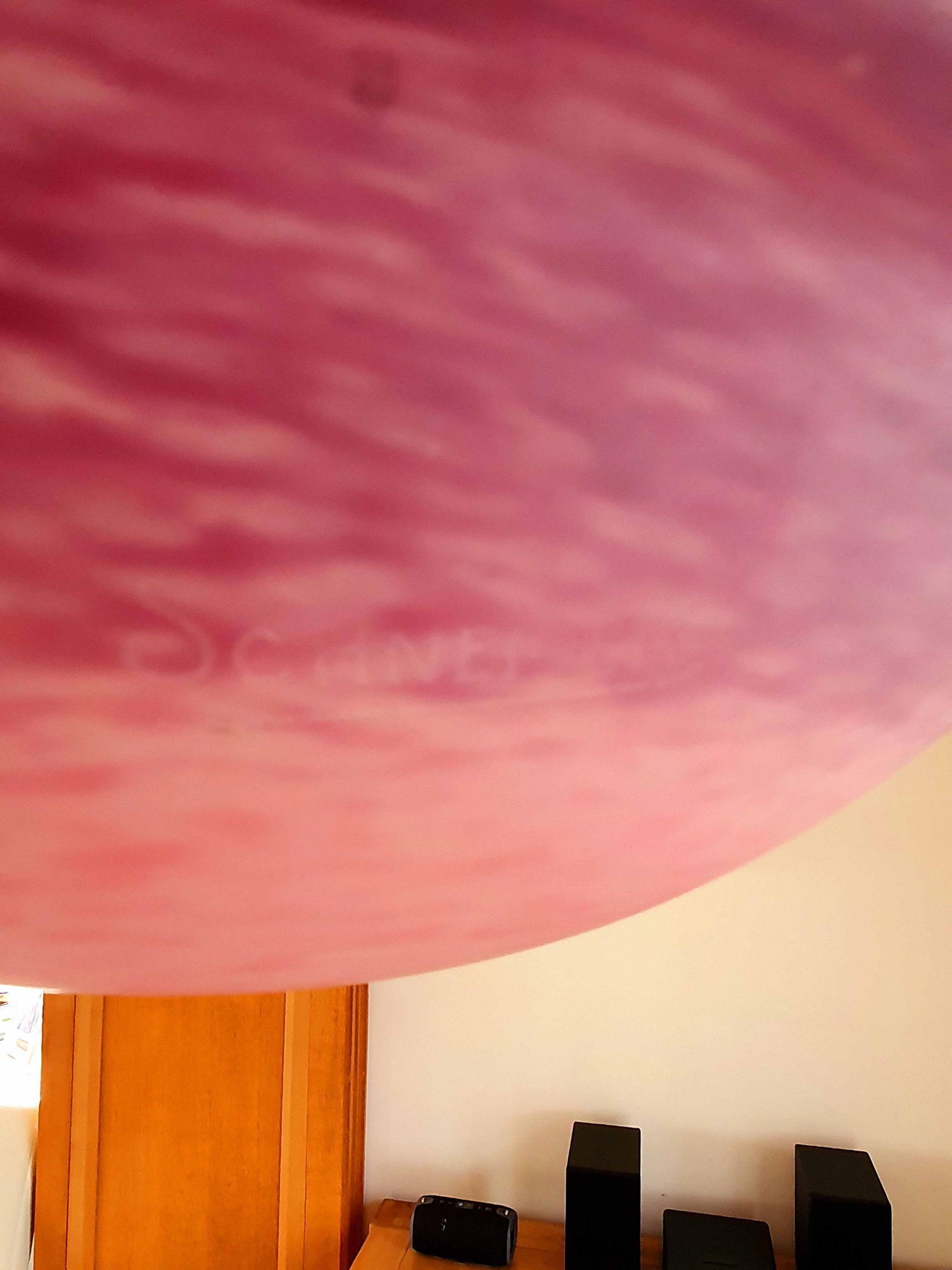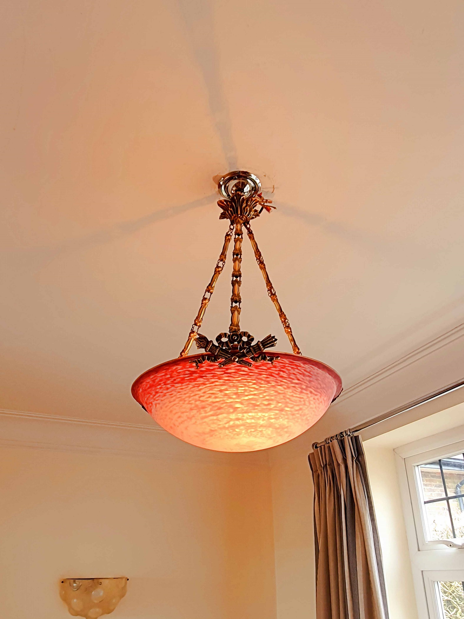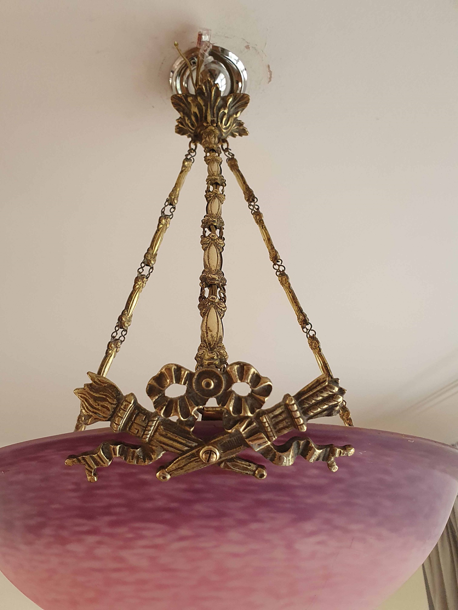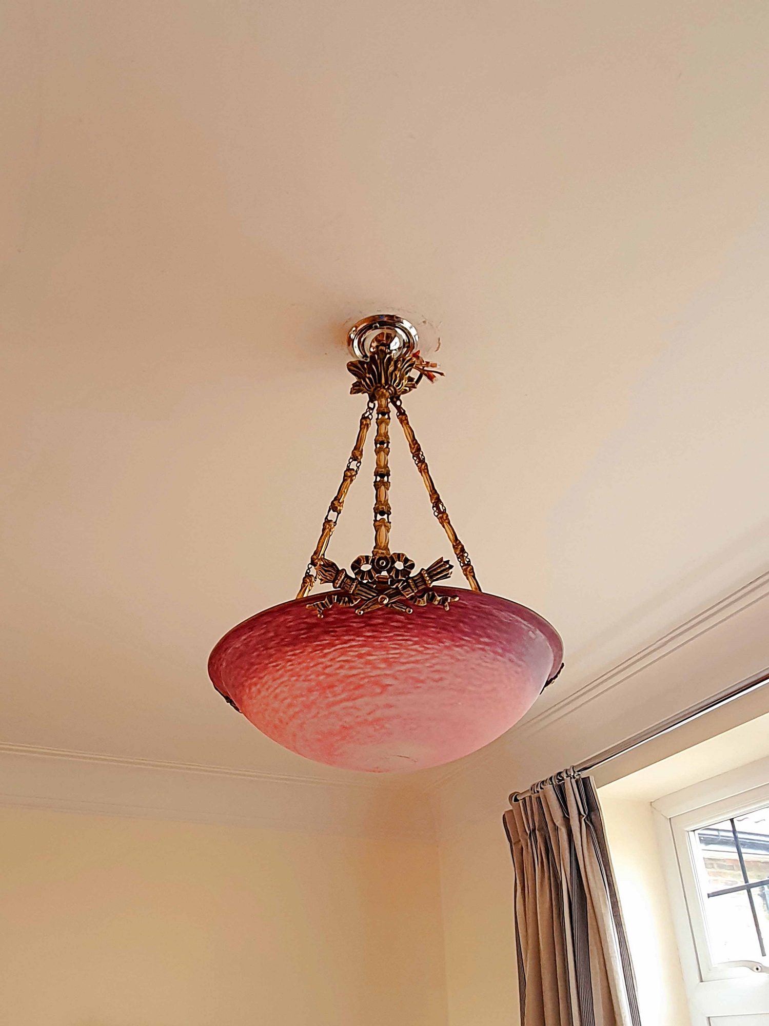 Product Code: JAL0821bA mottled glass “pate-de-verre” plafonnier shaded from pink to violet complimented with its original decorative brass finials, chain and ceiling rose. Signed with engraved mark “Schneider” to the plafonnier. France c1925