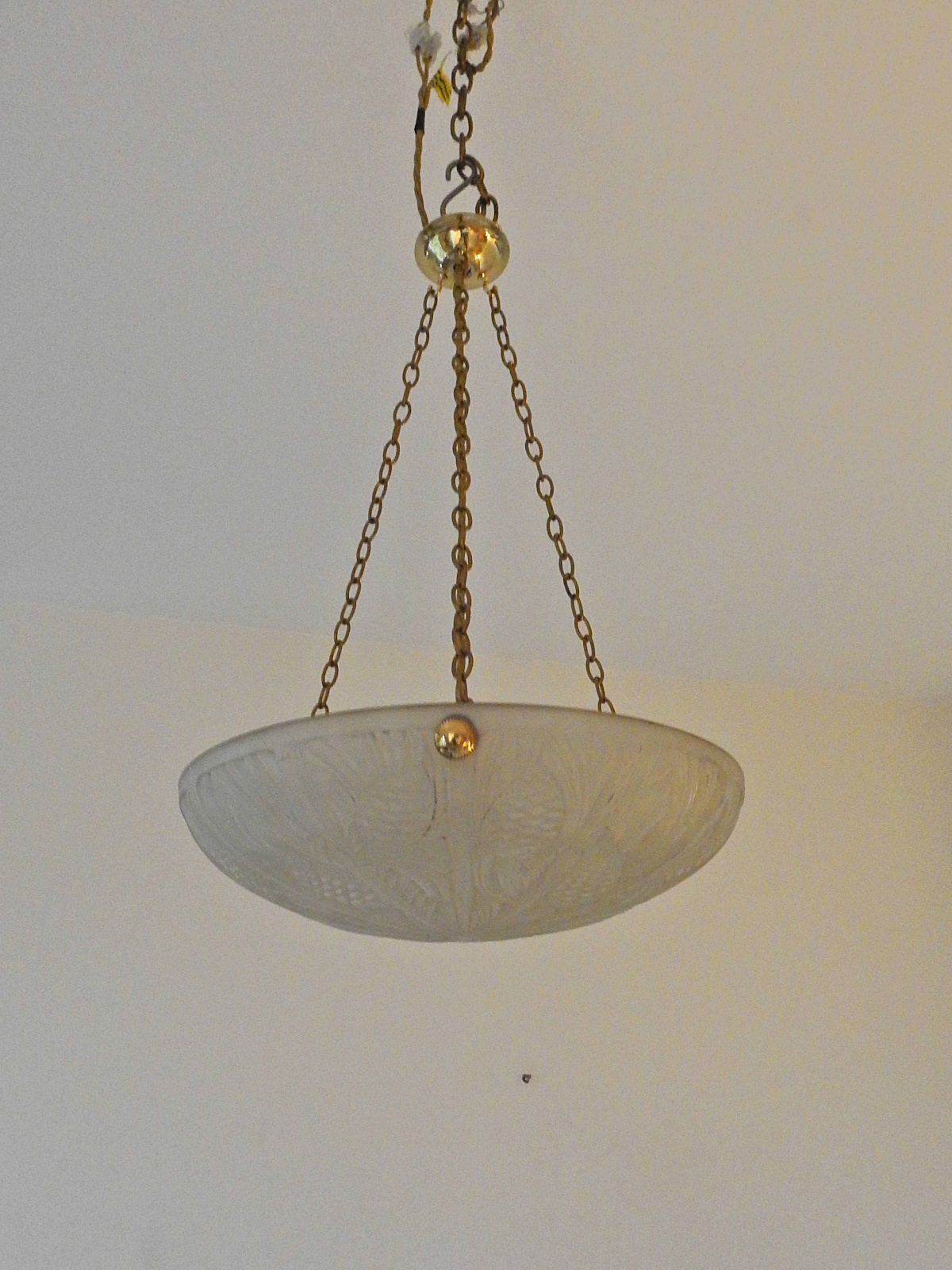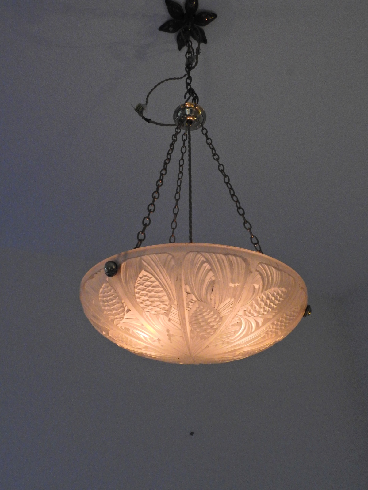 Product Code: LG478A moulded and polished glass plafonnier designed with pine cones and needles and signed Danyl with replacement brass,bronze or nickel fitments for suspension. France c.1930