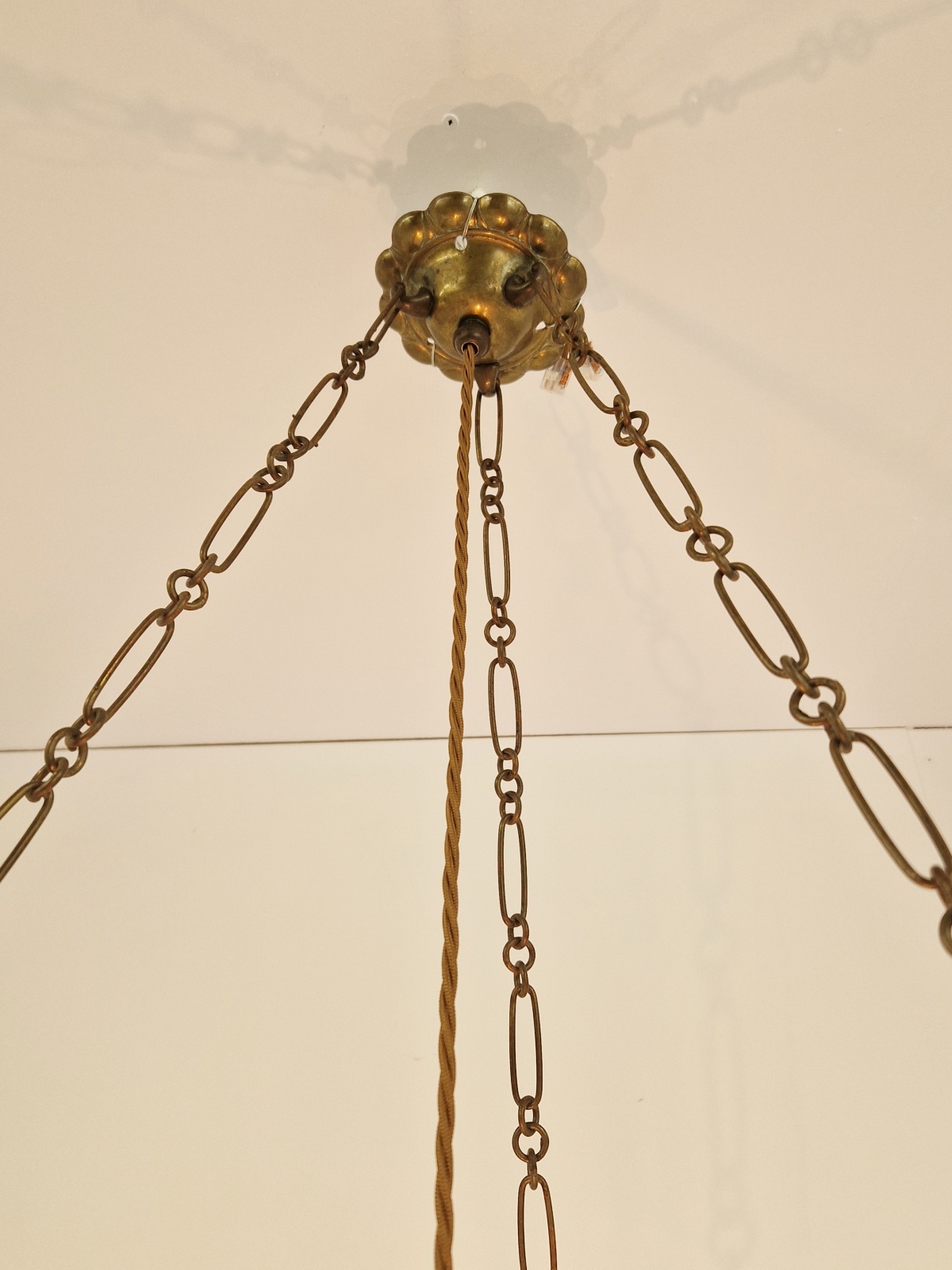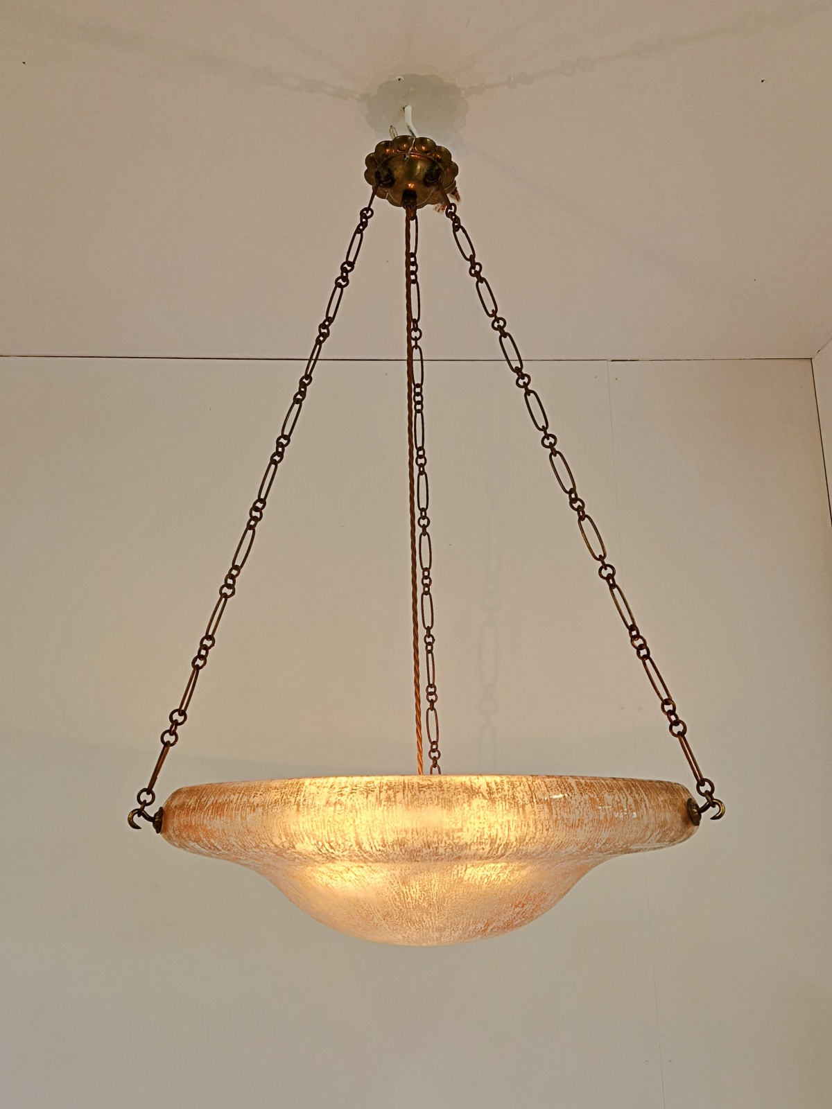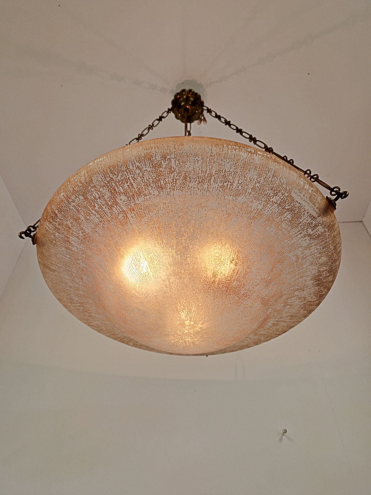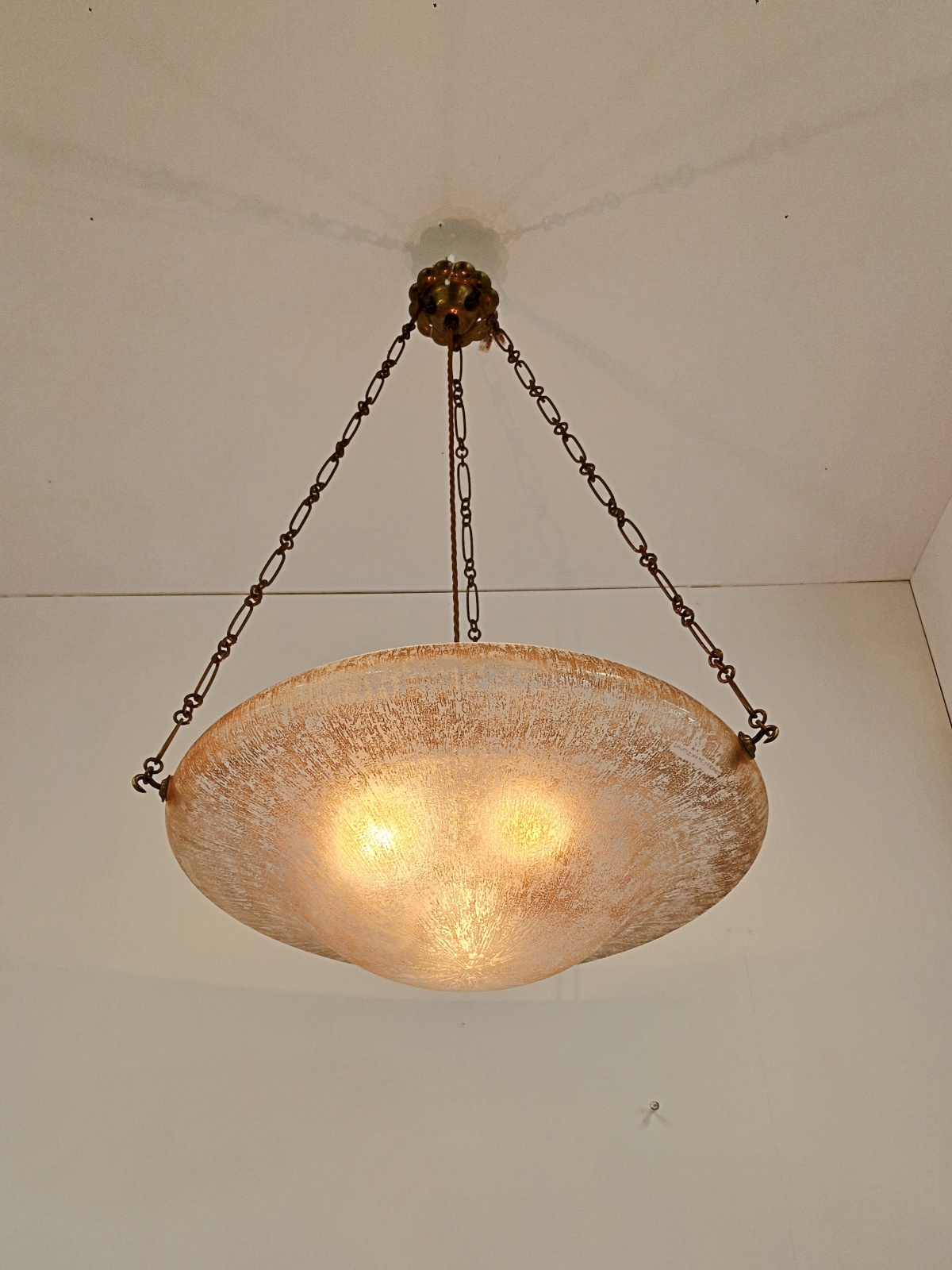 Product Code: LG601An exceptional and rare large art-deco plafonnier. The statement plaffonier designed with a “bark” texture scattered onto the glass and signed Daum Freres, Nancy with the croix de Lorraine. France c.1930