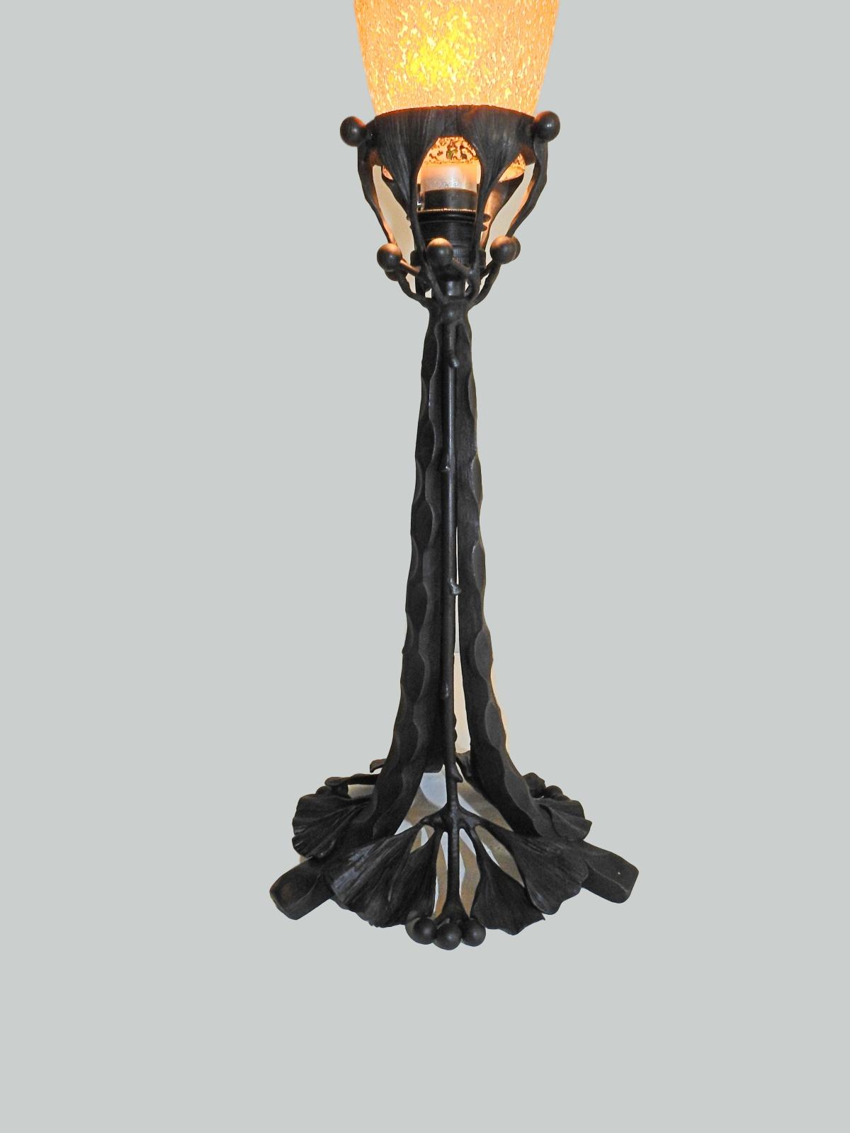 Product Code: JAL1004LG462An attractive wrought-iron table lamp designed with berries and gingko leaves in the style of Edgar Brandt, the bark-textured lampshade in warm tones of caramel and signed “Daum Nancy, France” with Croix de Lorraine.