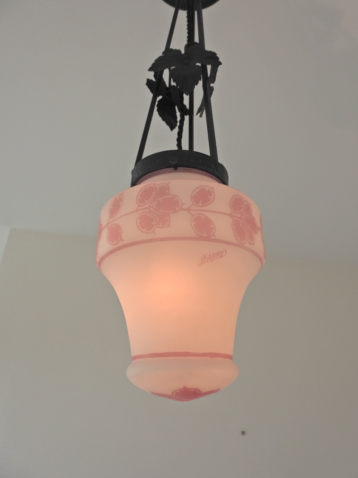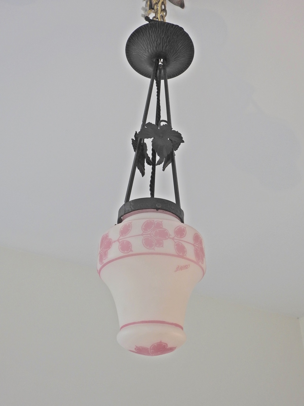 An opaline-glass and wrought-iron lantern, the glass overlaid in pink faux-cameo with a design of stylised monnaie-du-pape and signed “D’Aurys”. France c1930