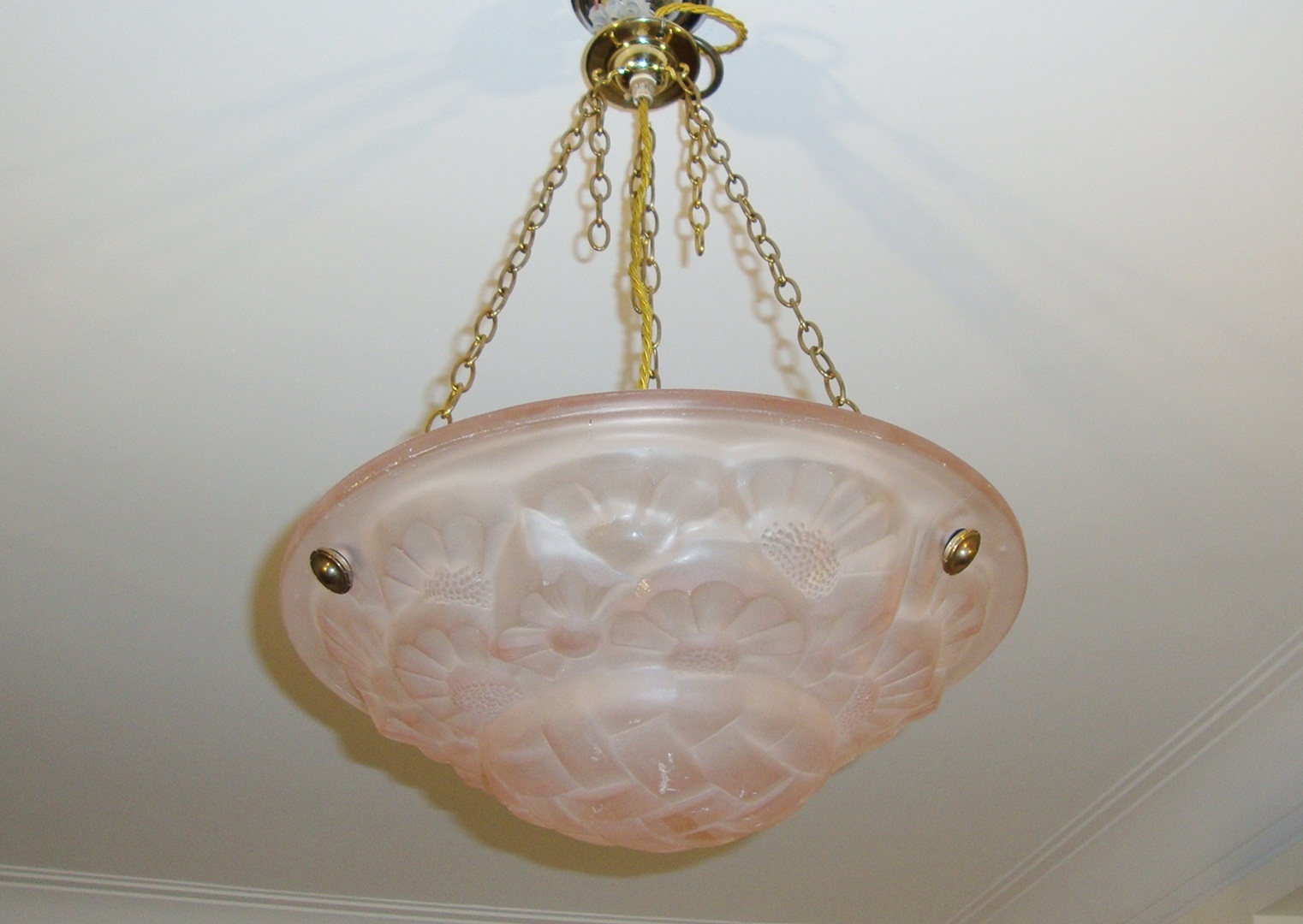 Product Code: JAL0526bAn art deco plafonnier, the moulded pink-coloured glass of indentical design to JAL526a with a moulded mark of “Degue” and replacement fitments for suspension. France c1930
