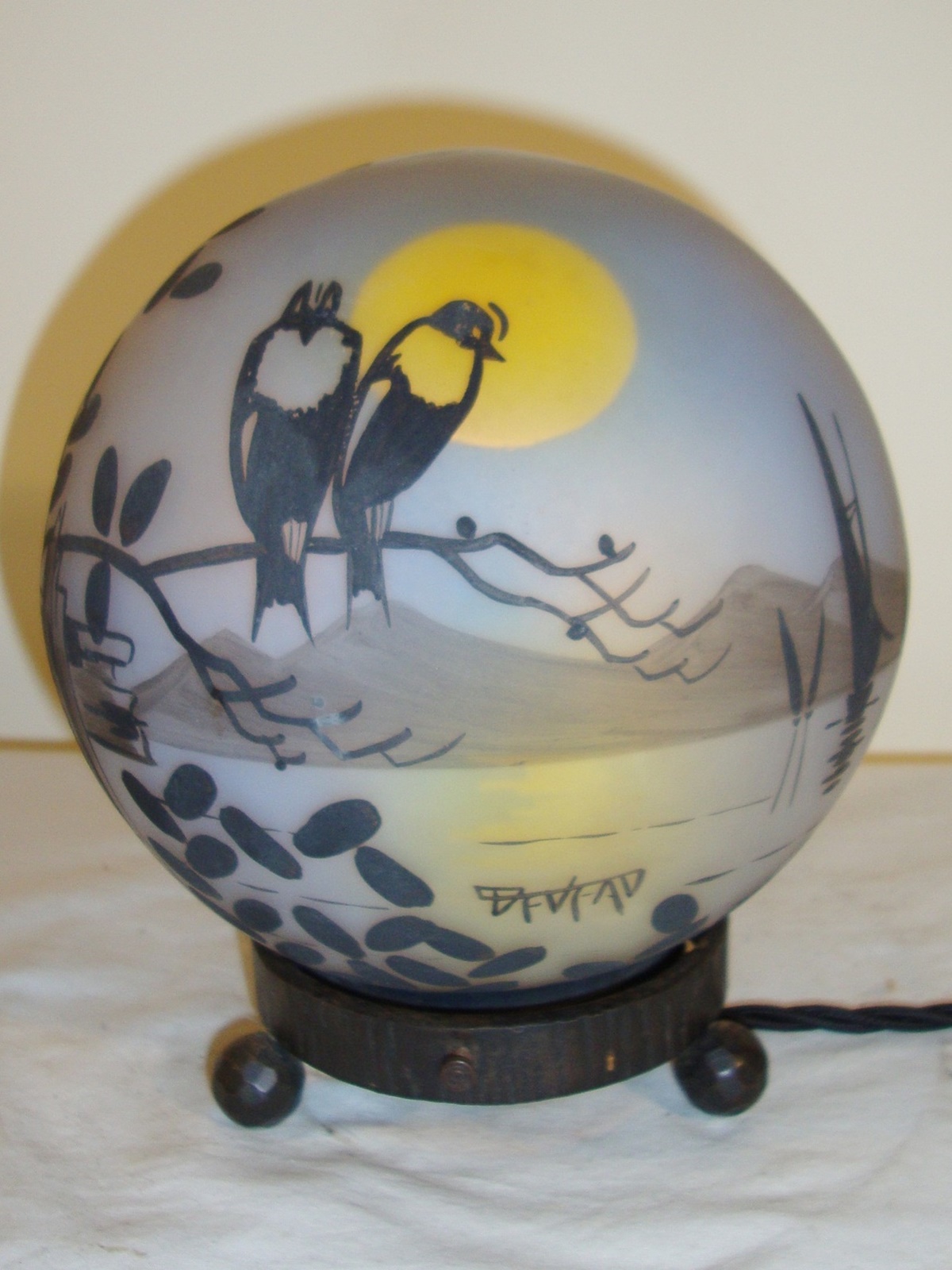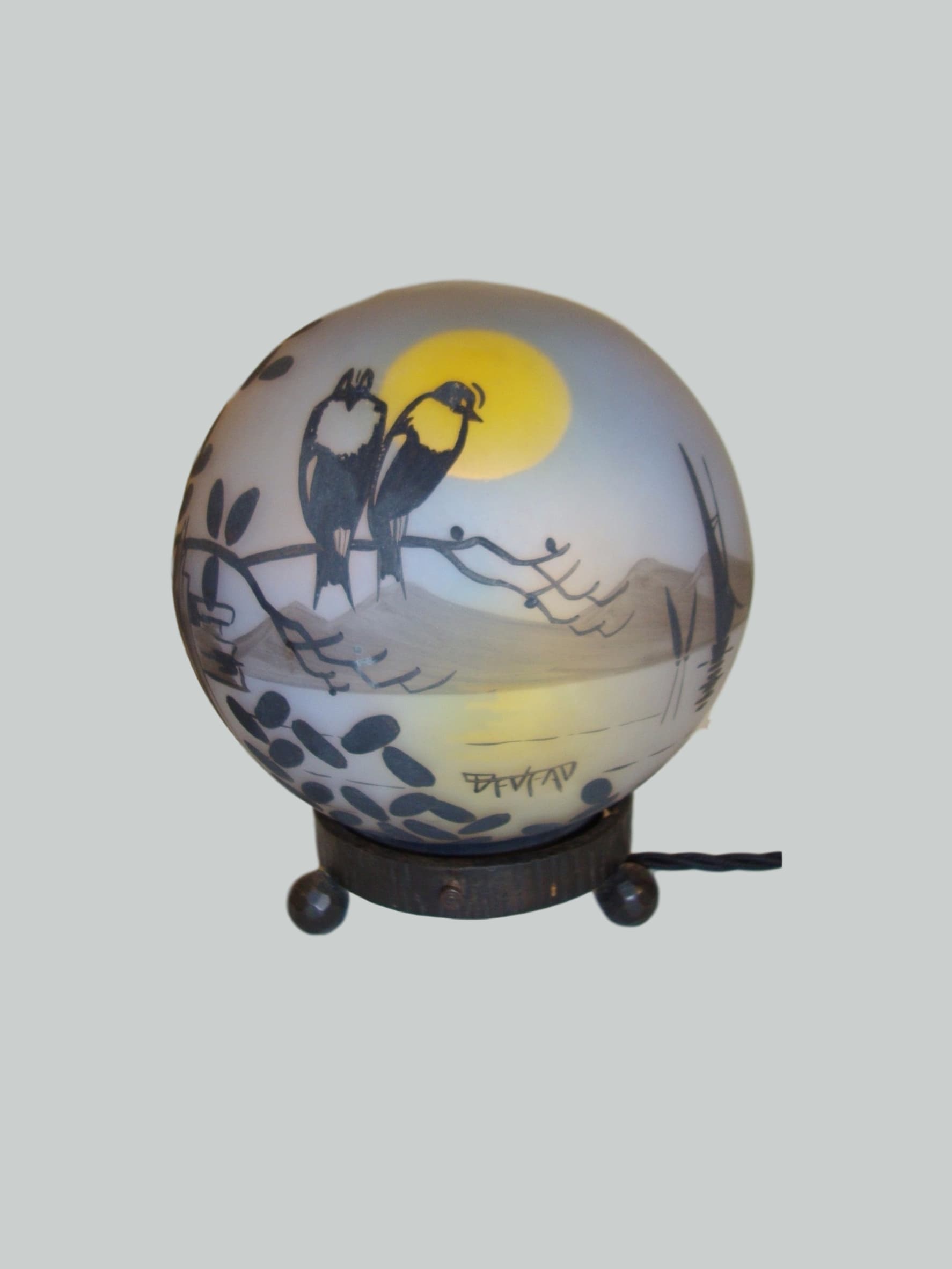 A wrought iron and enamelled glass “globe” night-light designed with a moonlit scene of a lake with owls signed “Deveau”. France c1925 (see TP4 for a smaller but similar example)
