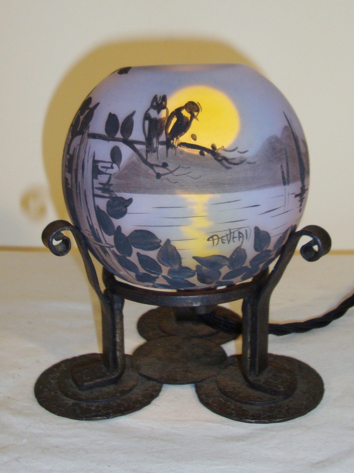 An attractive wrought iron and enamelled glass “parfumier” designed with a moonlit nocturnal scene of a lake with owls and signed “Deveau”. France c1925