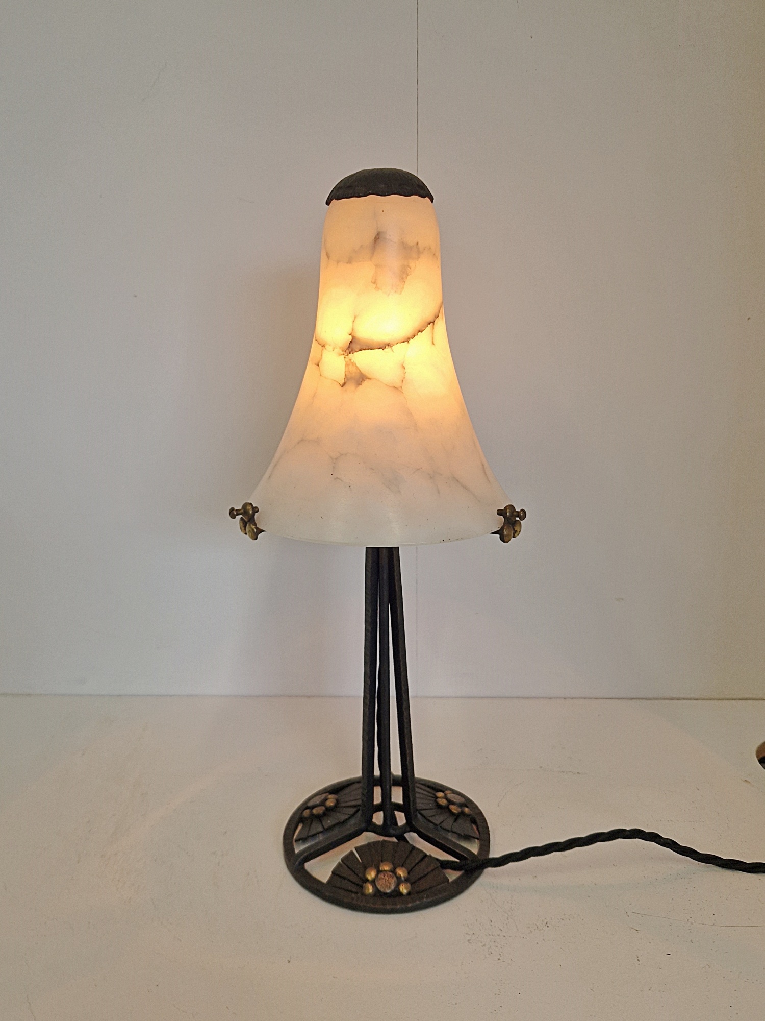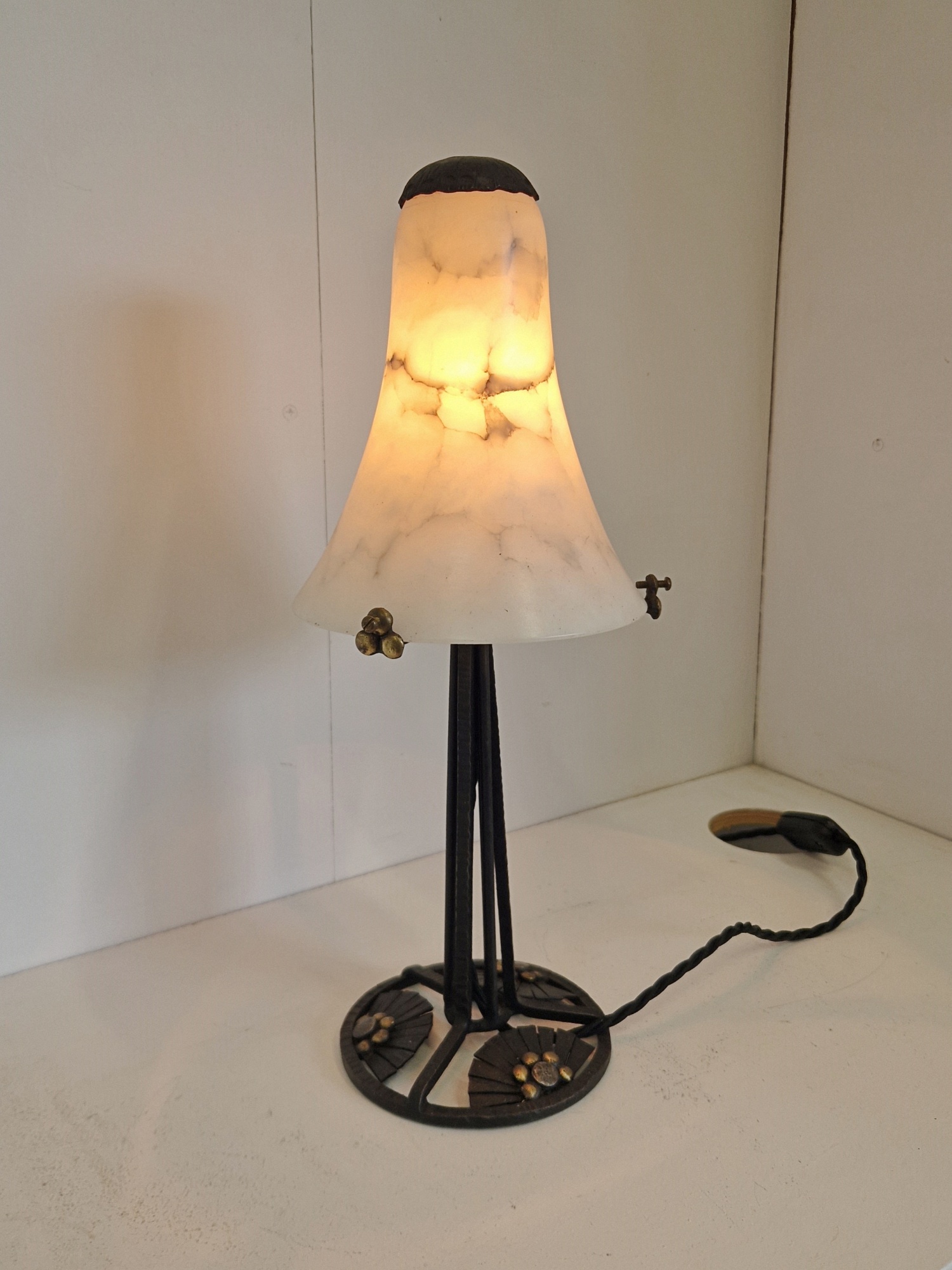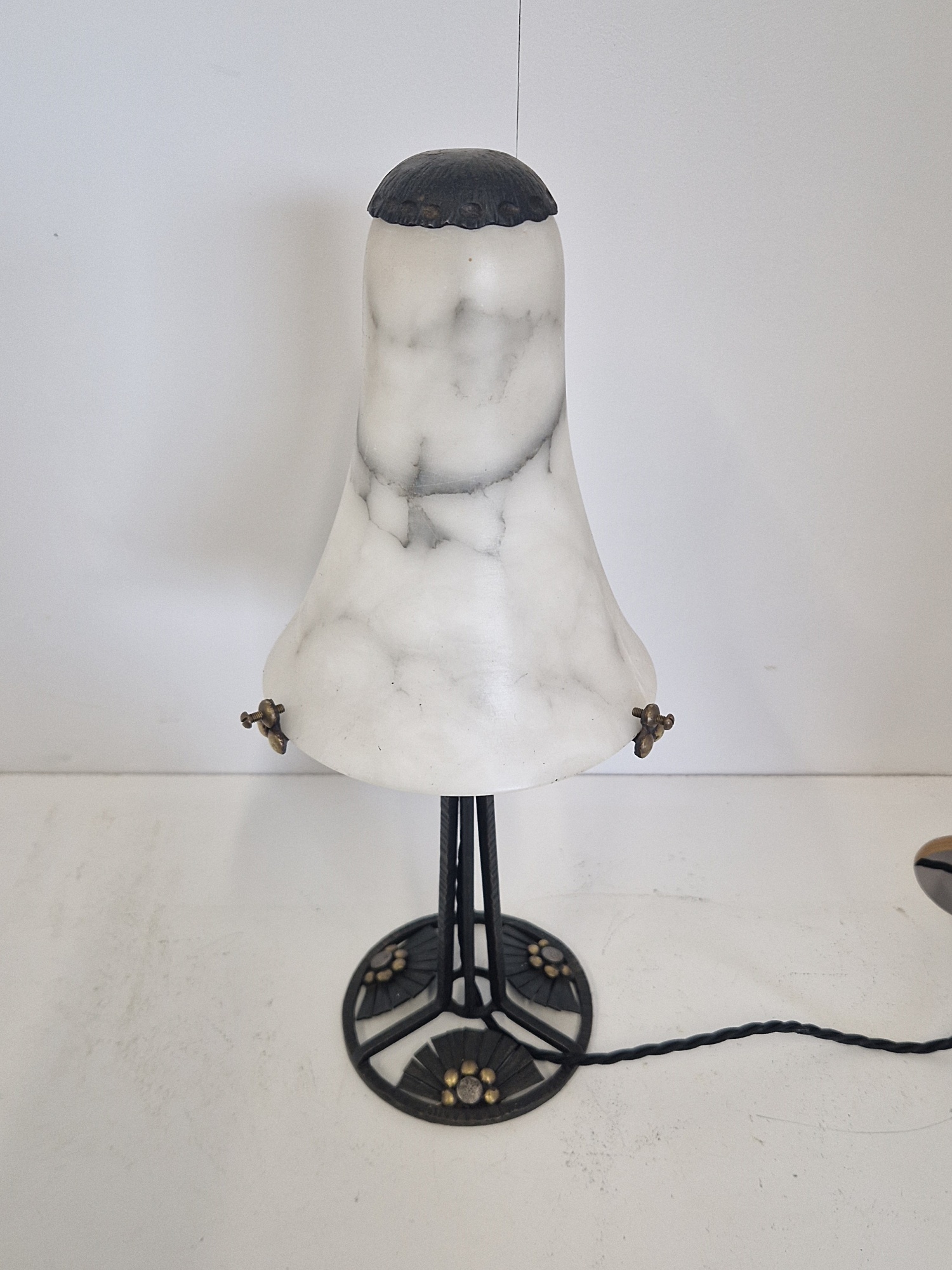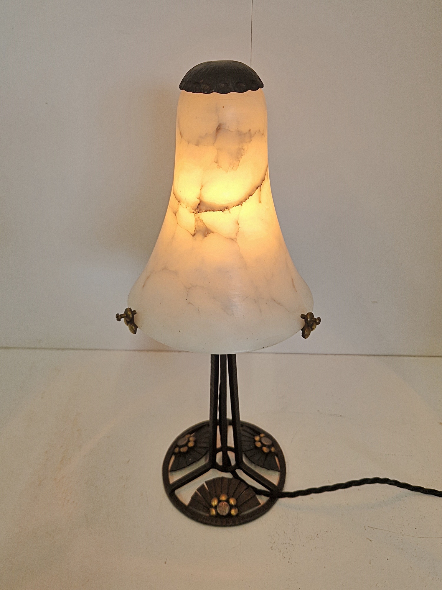 Product Code: JAL534bPDV01aA good quality wrought-iron table lamp in abstract pattern with distinctive dots synonymous with the designs of the French blacksmith E.Dubois. The base supporting a good quality alabaster lampshade. The light is apparently unsigned. France c1925