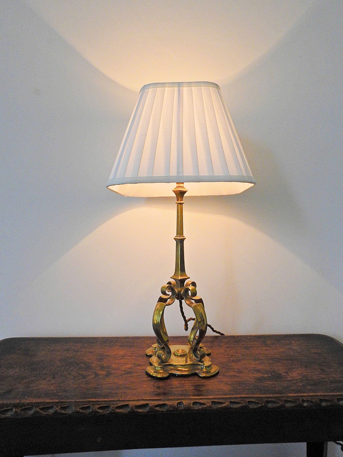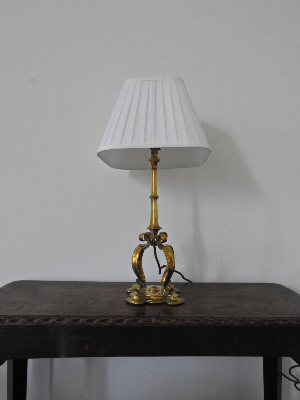 A cast brass Edwardian table lamp designed with quatrefoil base, supporting a reproduction fabric lampshade. England, c.1910.