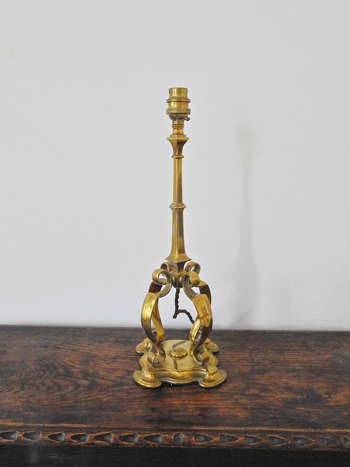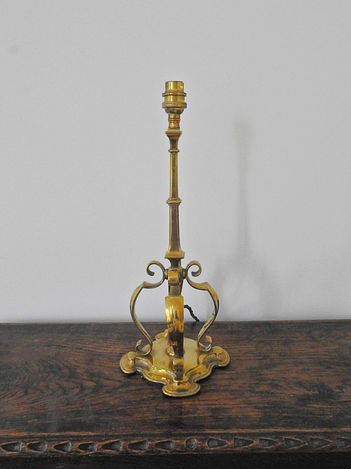A cast brass Edwardian table lamp designed with quatrefoil base, supporting a reproduction fabric lampshade. England, c.1910.