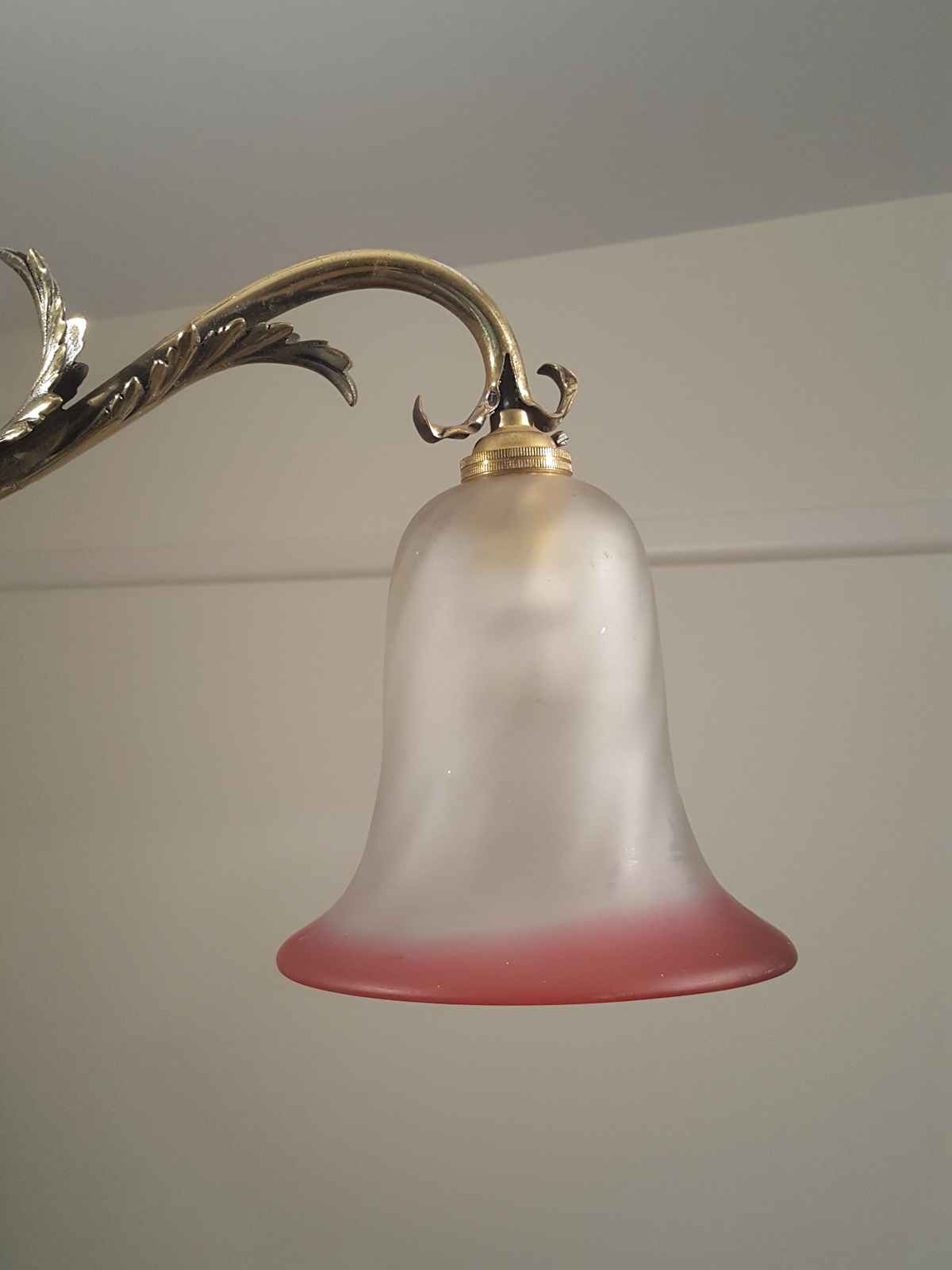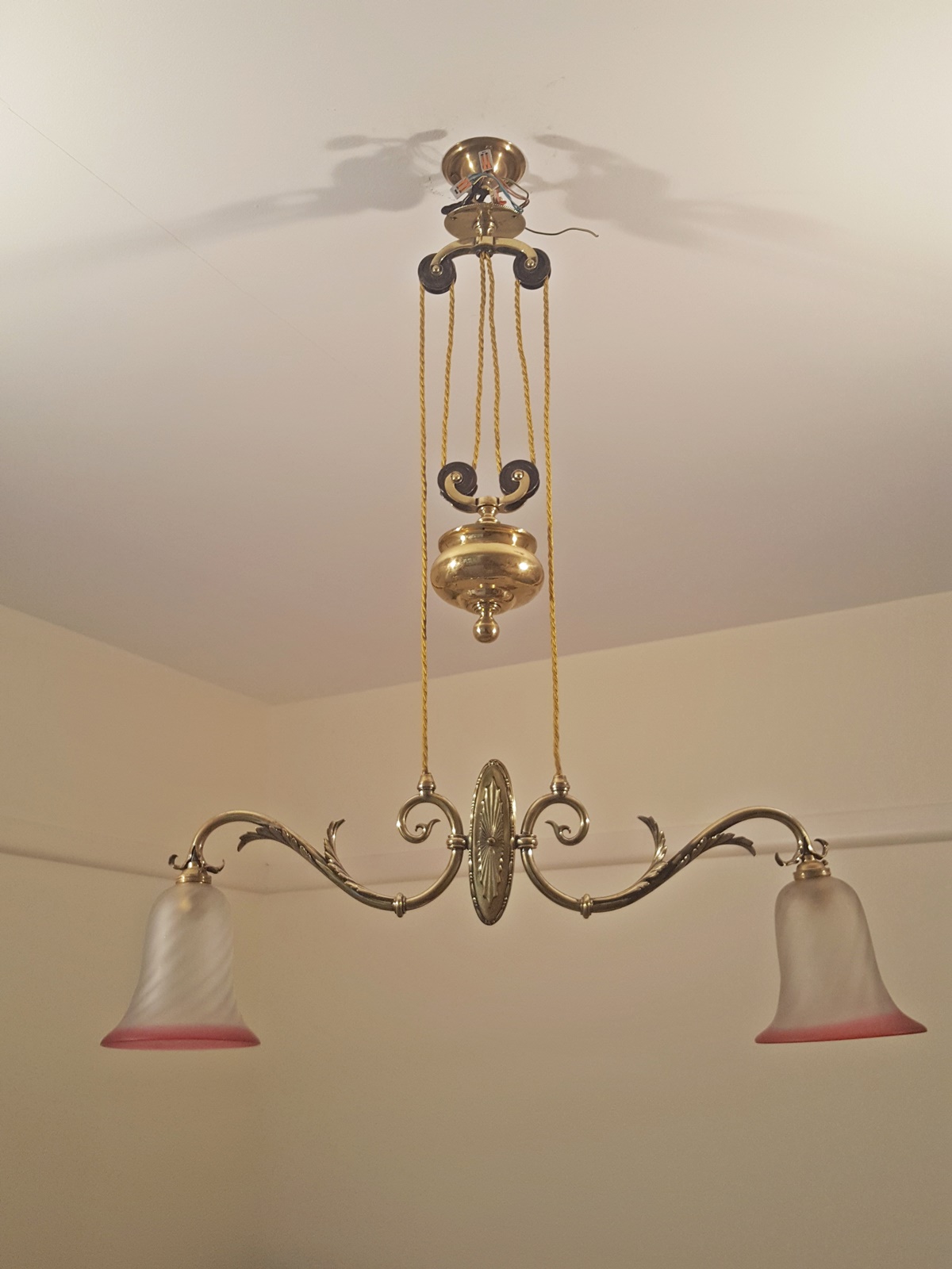 Product Code: JAL0192An Edwardian “rise and fall” two branch hanging lamp signed by The General Electric Company, each arm supporting a cranberry satin-glass lampshade. England c1905