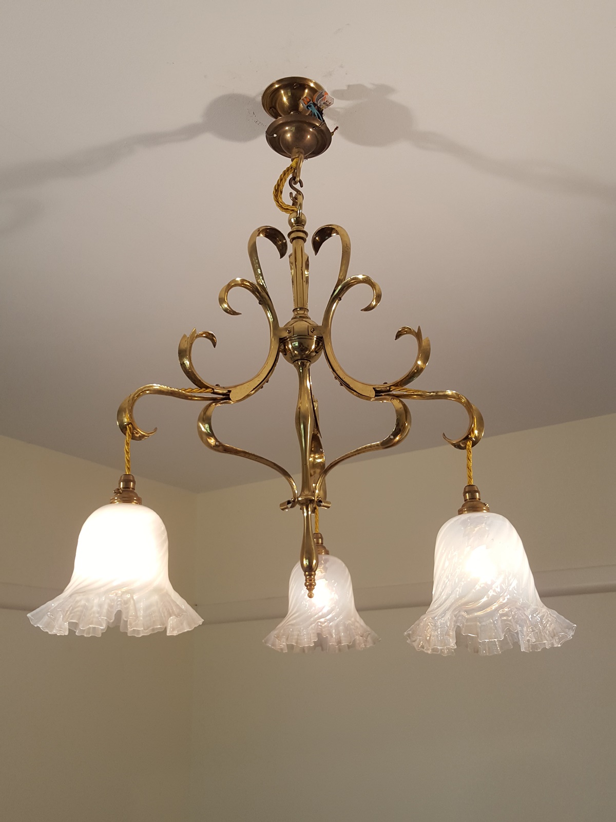 A cast and stamped brass art nouveau three-branch hanging lamp, each arm supporting pendant a vaseline glass lampshade. England c1905