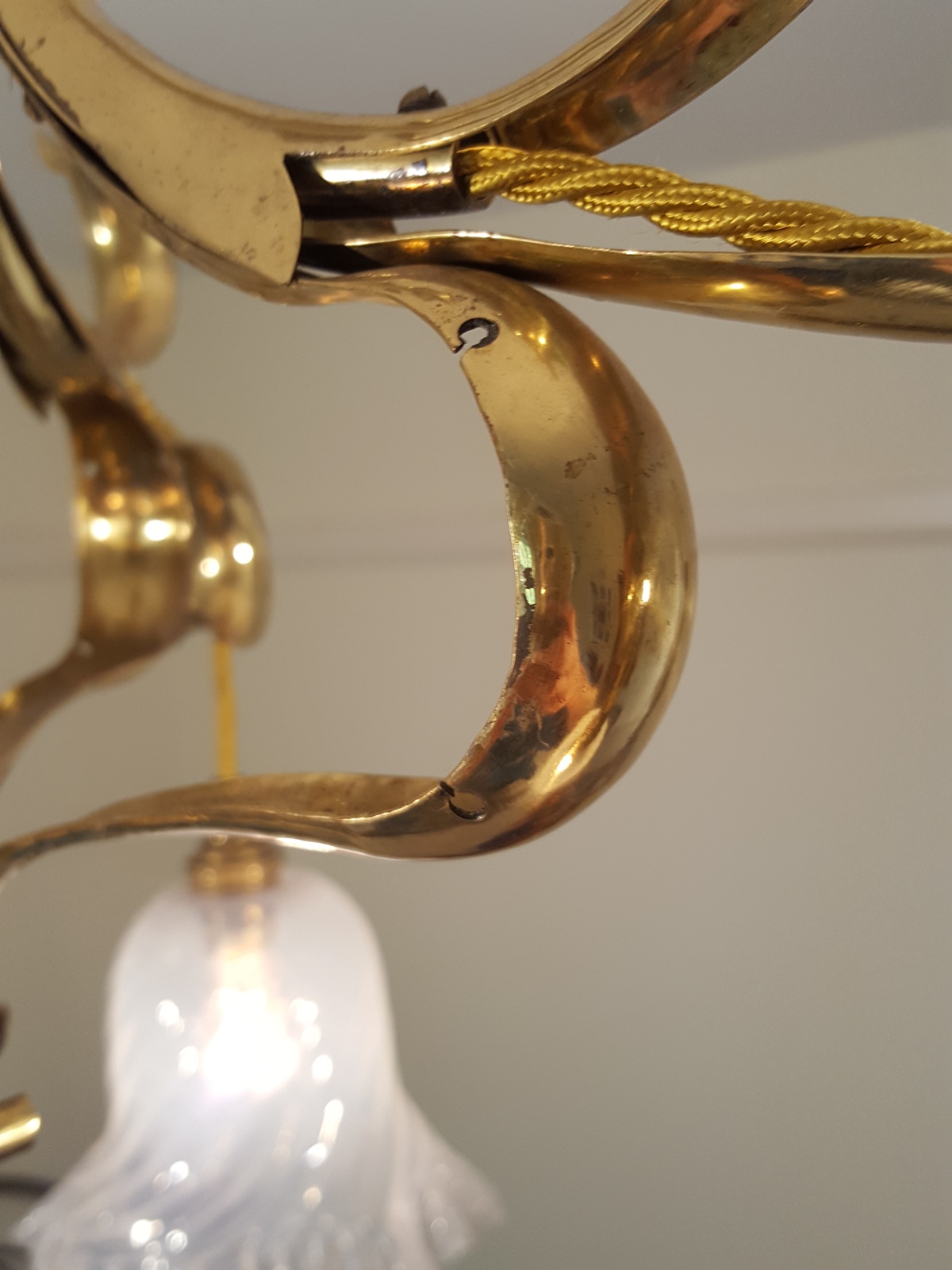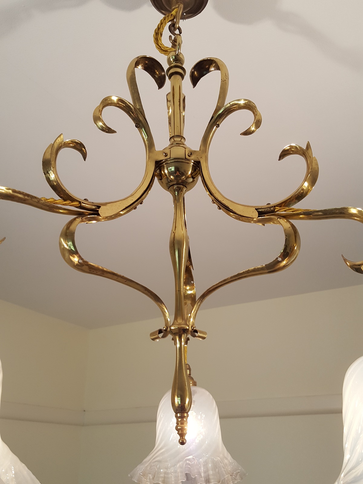 A brass art nouveau three-branch hanging lamp by The Generel Electric Company, each arm supporting pendant a vaseline-glass lampshade. England, c.1905.(As Found: small drill holes to each arm – see photograph).