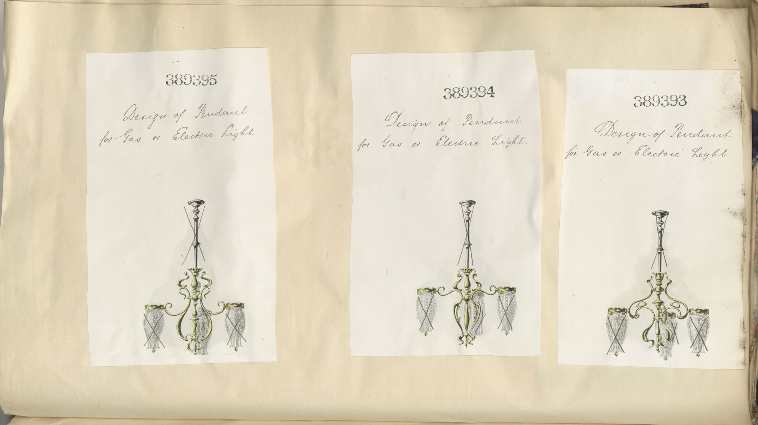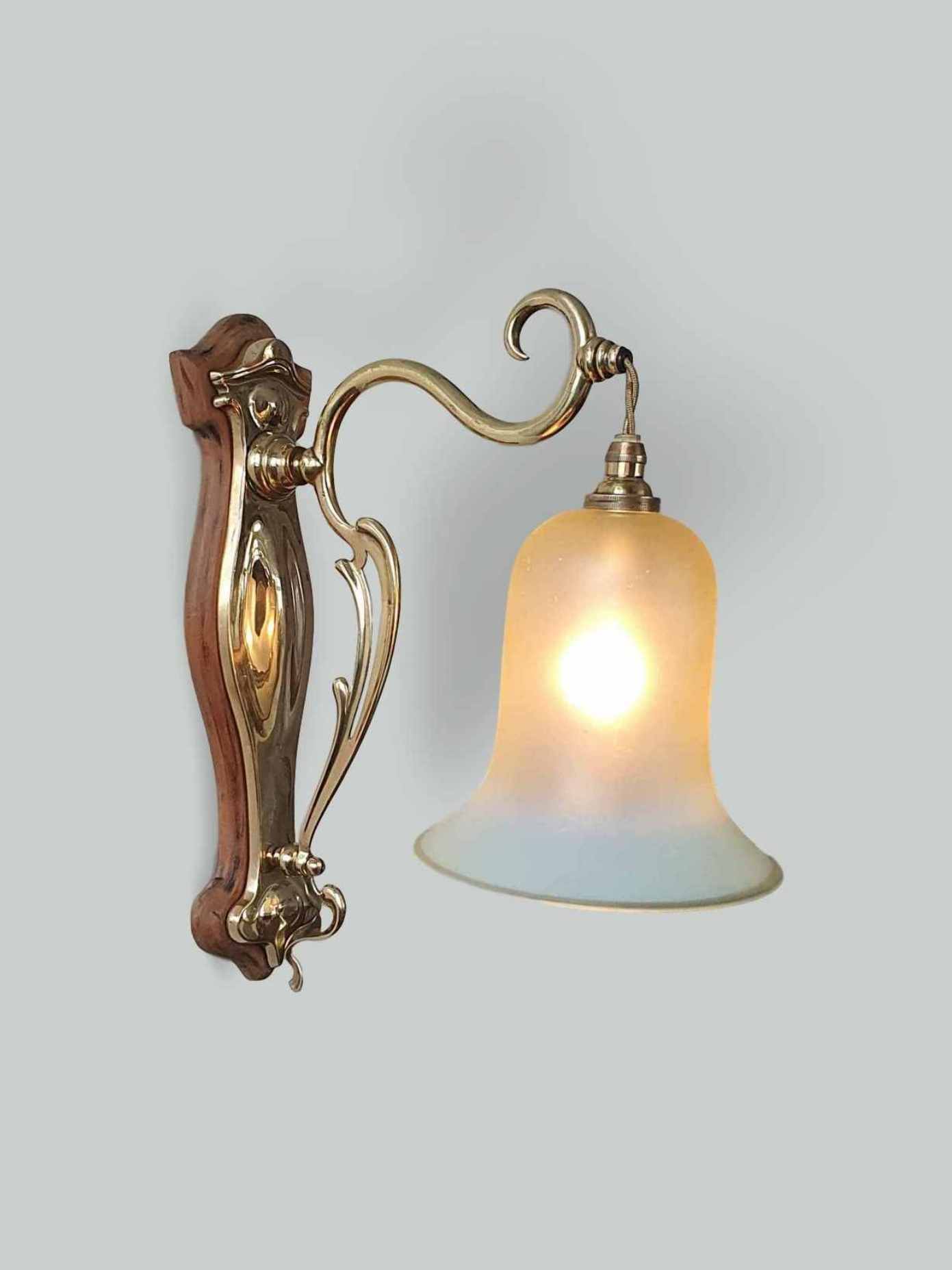 Product Code: JAL0100A very rare pair of cast-brass art nouveau wall lights with Trade Mark and R.d mark 389394 for William Whitehouse & Company, Birmingham, each supplied with the original wood patress and supporting pendant a very good quality vaseline-glass lampshade of Stourbridge. England 1902