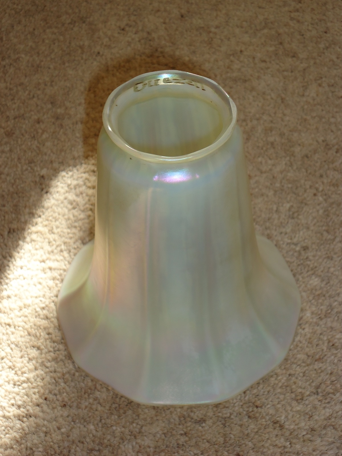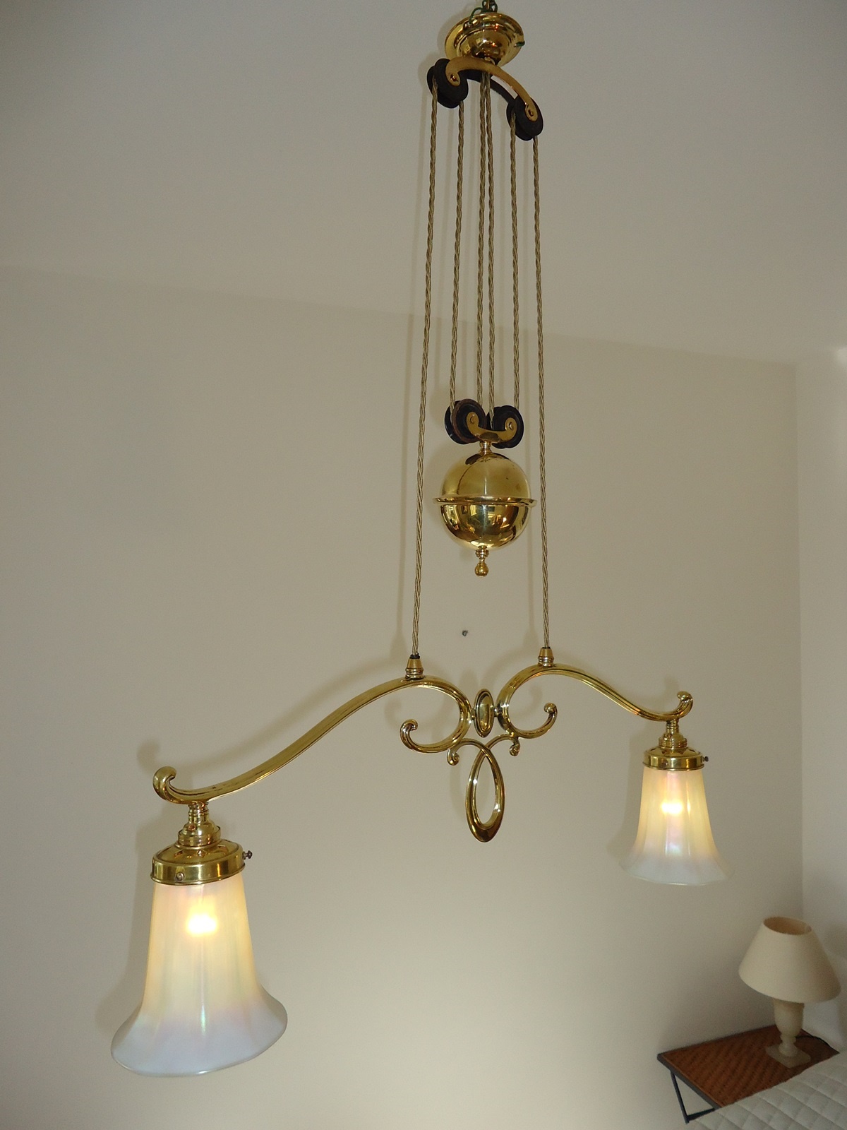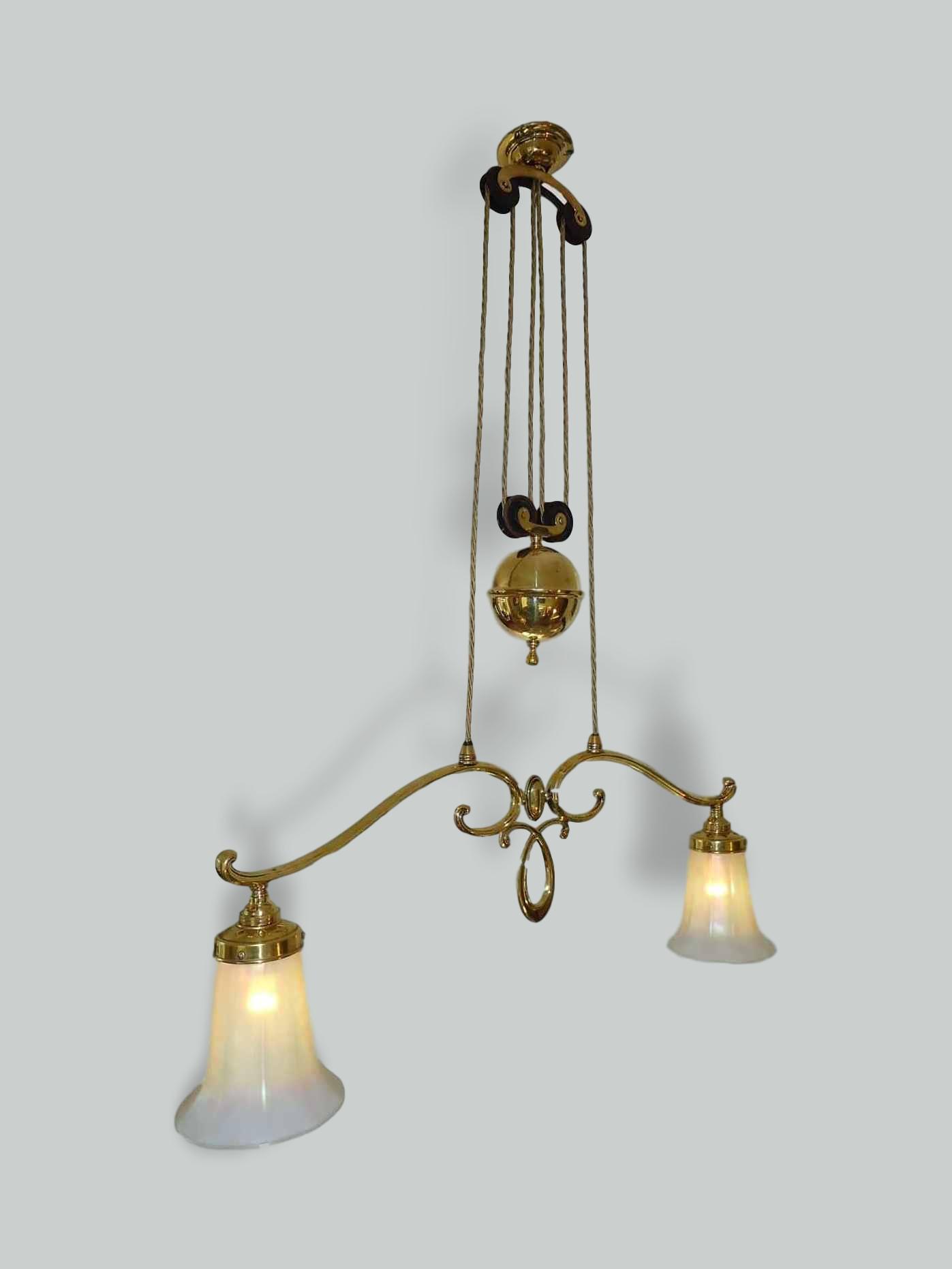 Product Code: LG295AM012A pair of English cast-brass “rise and fall” pendants by The General Electric Company England c.1920, each with a pair of very attractive pearlescent lampshades impressed “Quezal”. The latter: U.S.A. c.1910.