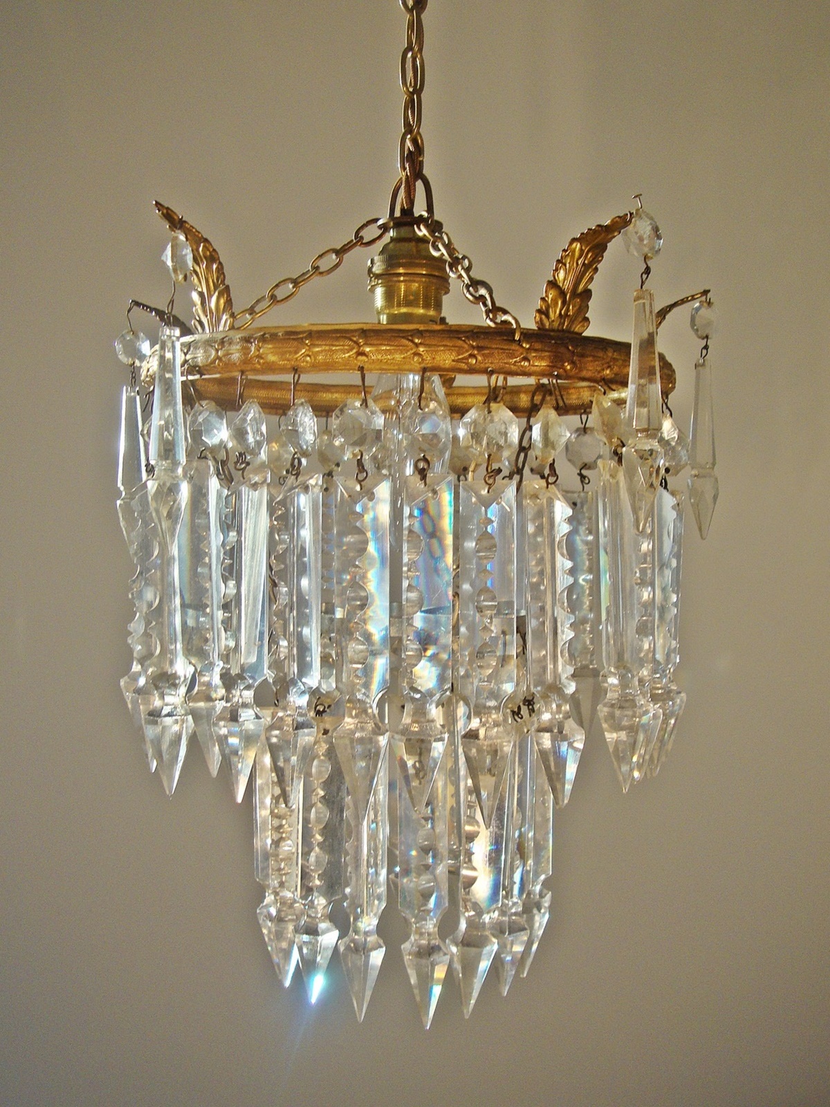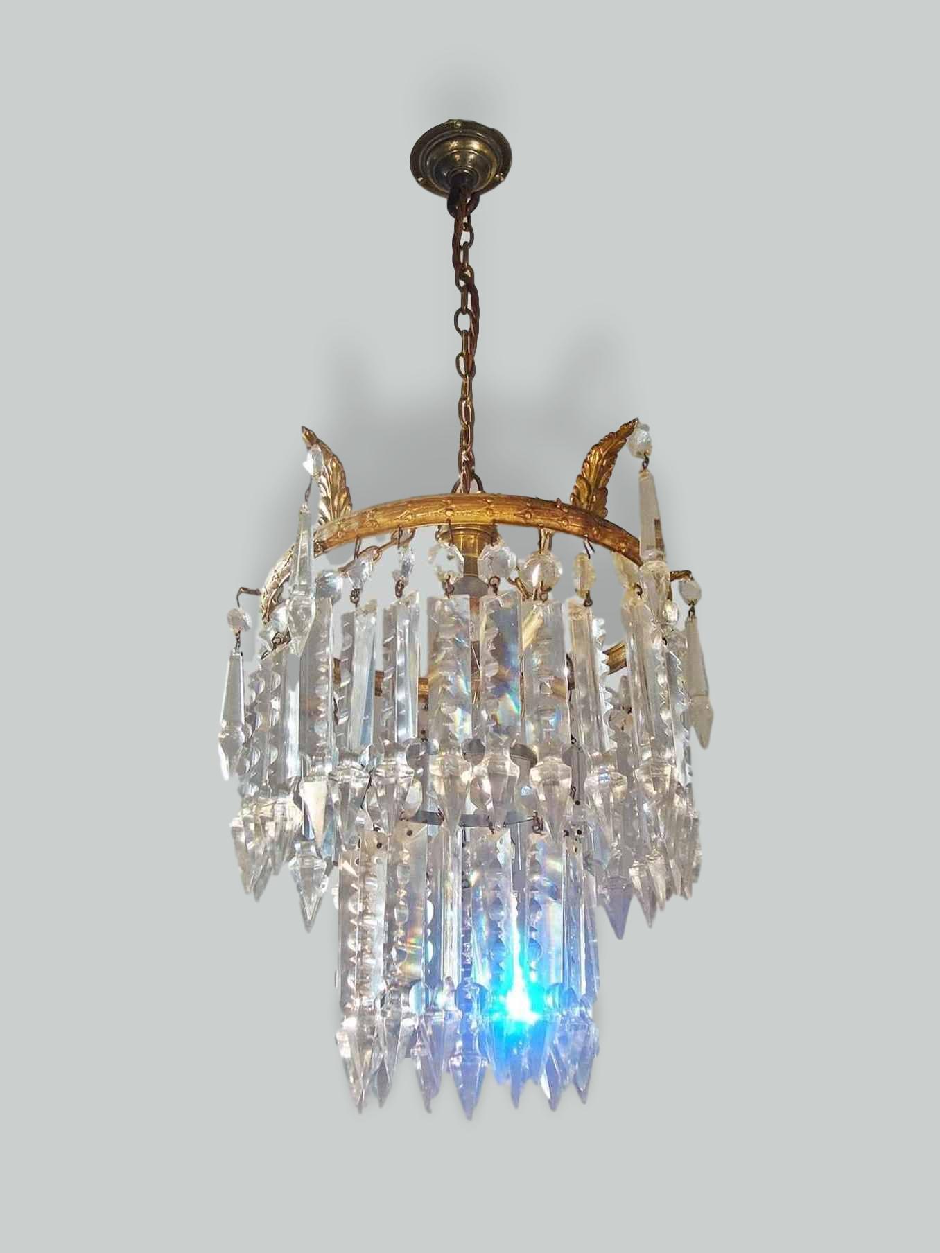 A good quality cut-glass lustre set with rows of faceted spears; England, early c. 20th. Ht. inc. chain 53cm/21ins; ht. of lustre 30/12; diam. 25.5/10.