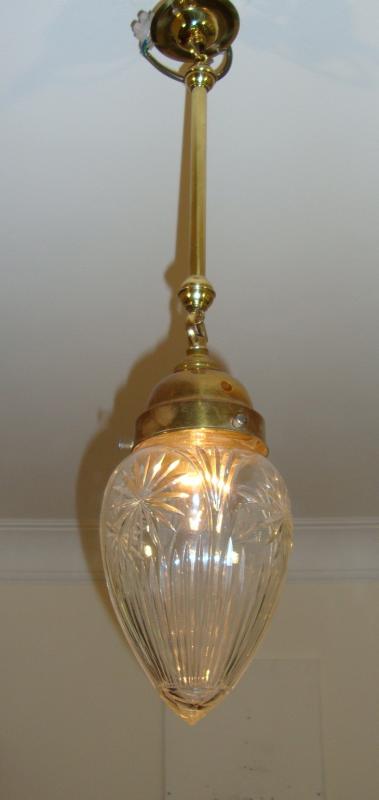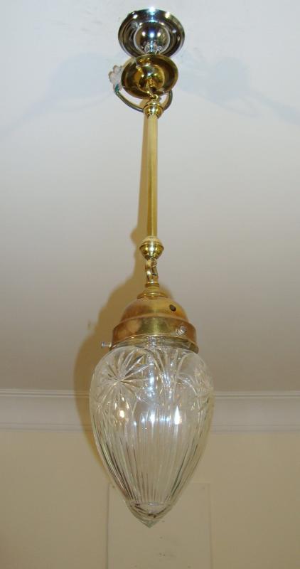 A cut-glass “pineapple” lampshade with antique brass gallery and rod for suspension. England c1910