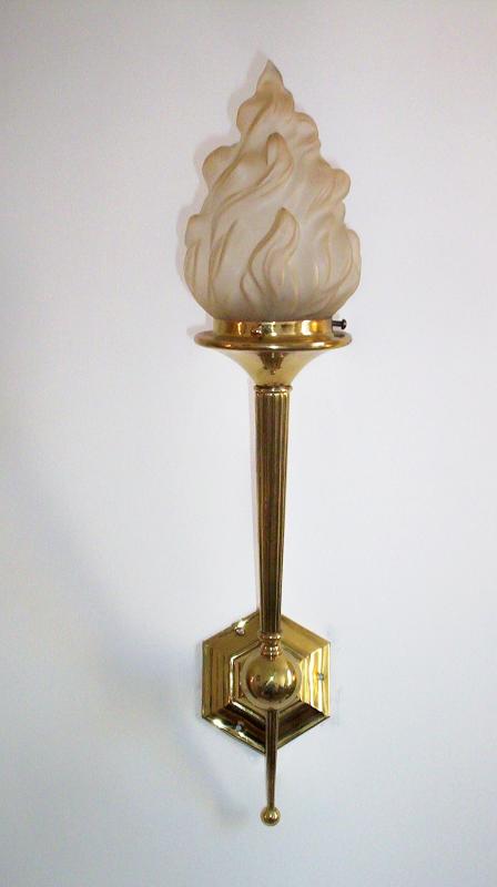 Product Code: LG049A set of three brass torchere wall lights, each supporting a frosted-glass “flambeau” lampshade in the style of J & W.B.Smith Ltd, London & Glasgow and The General Electric Company. c.1925