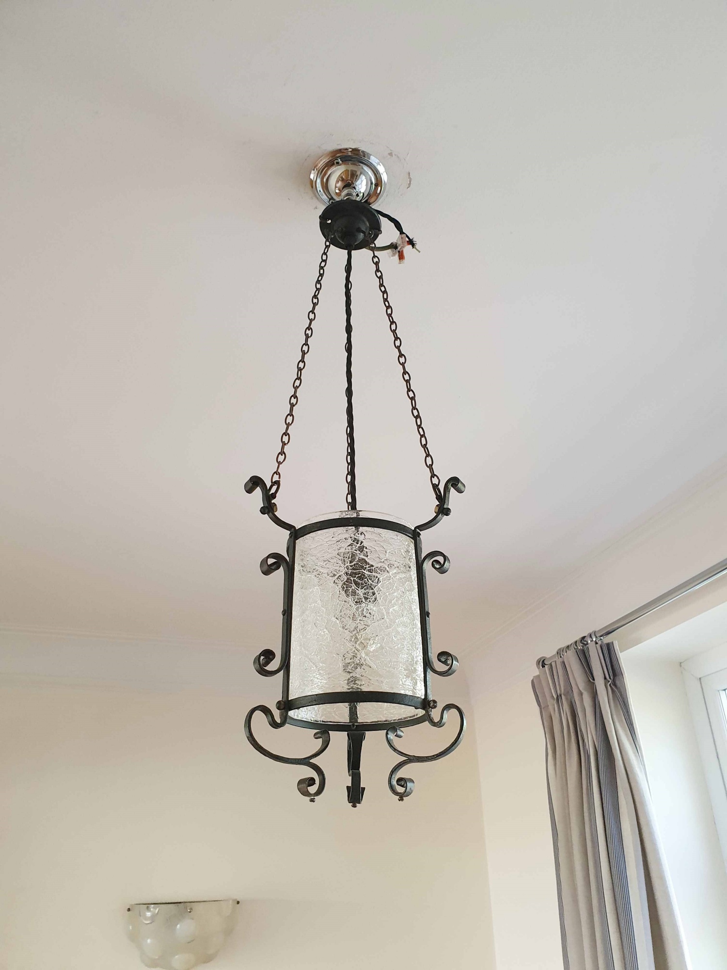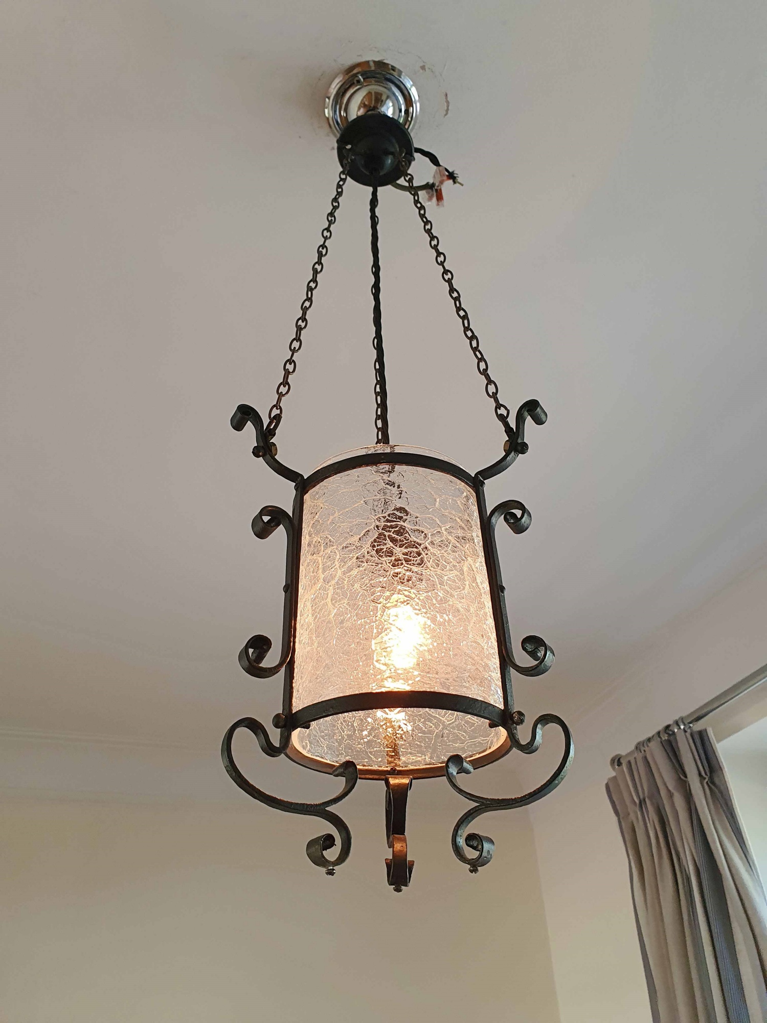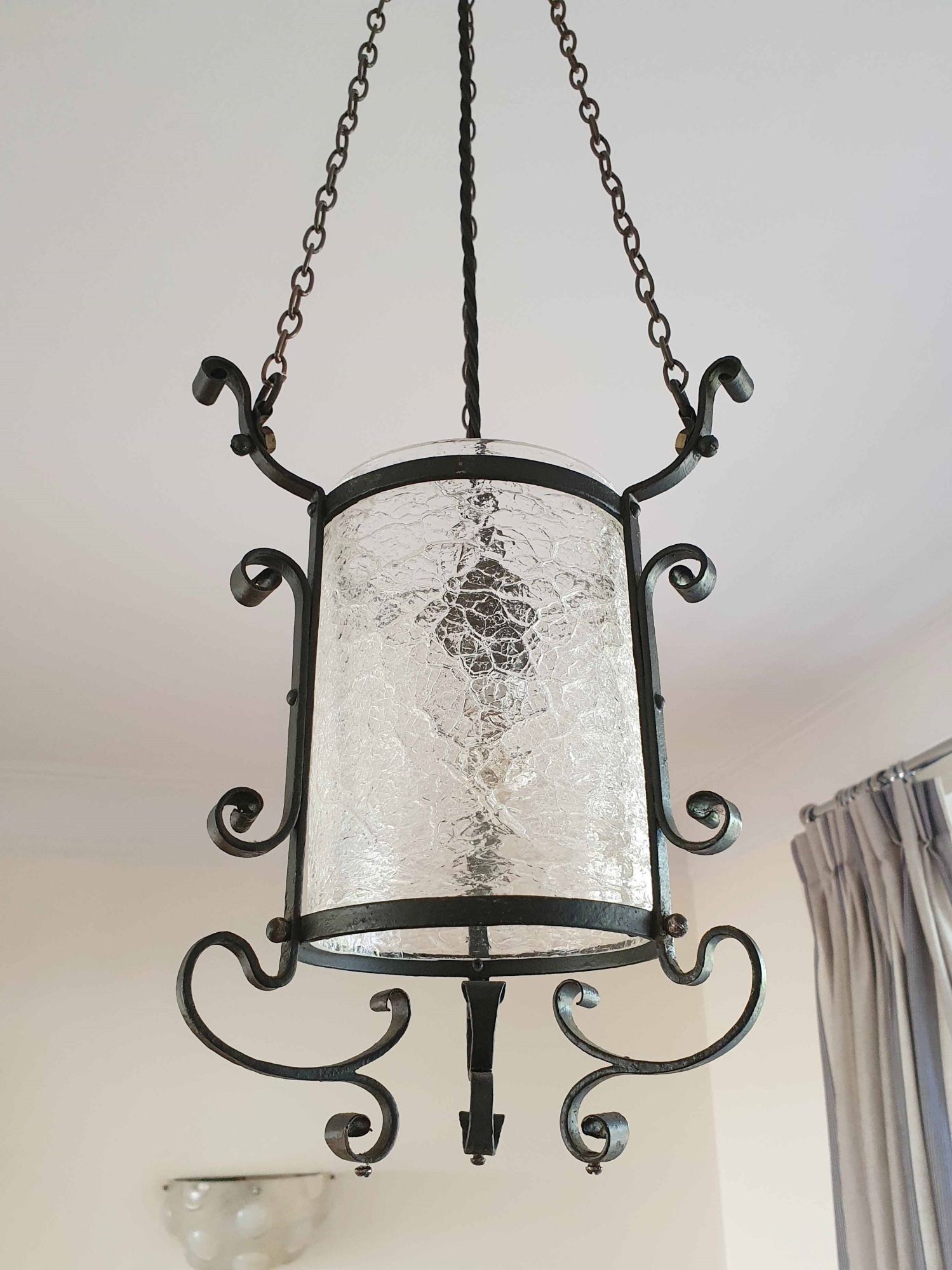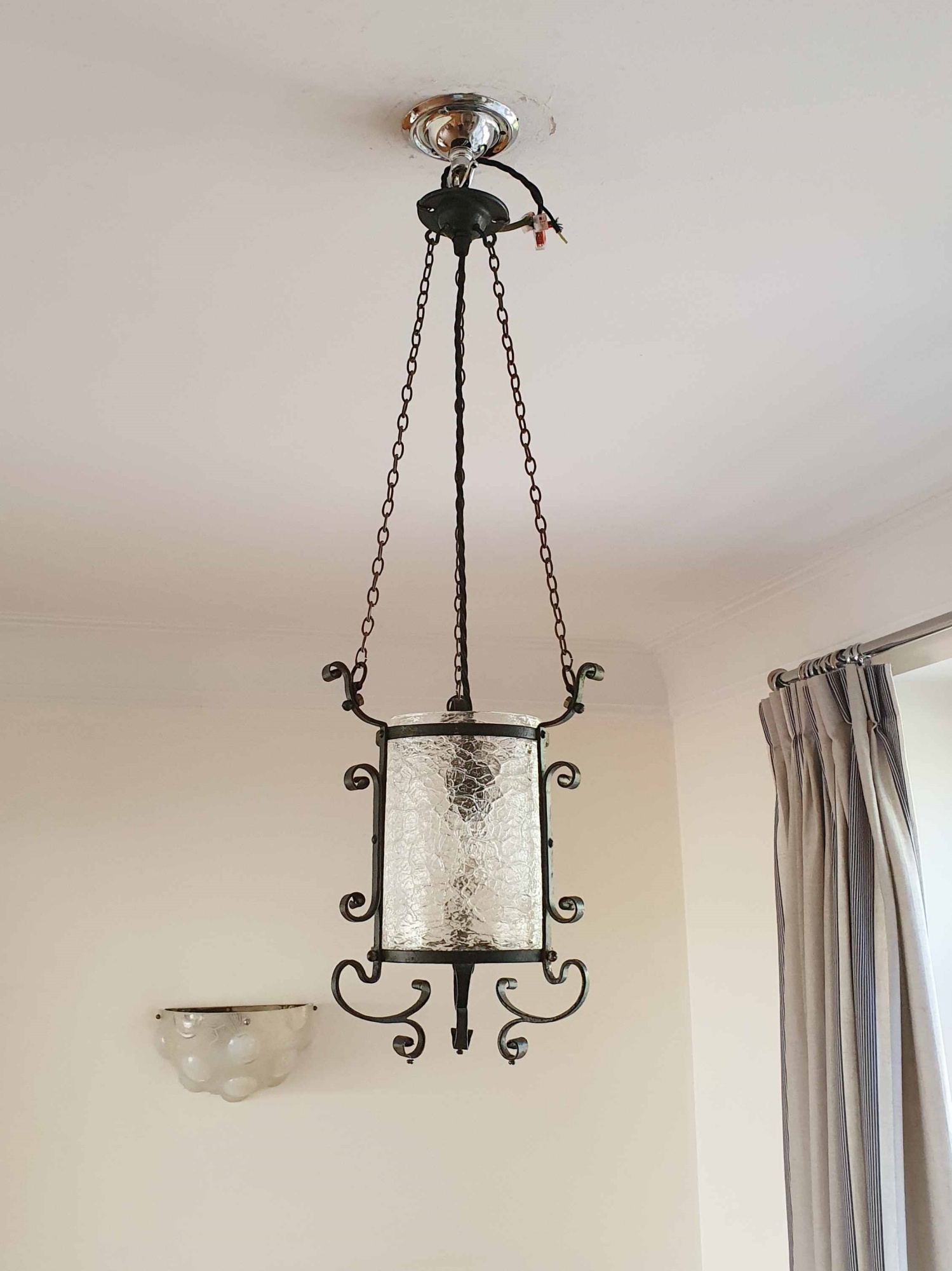 Product Code: JAL0338A classic wrought-iron arts and crafts porch or hall lantern with original crackle-ware glass insert. England c.1900