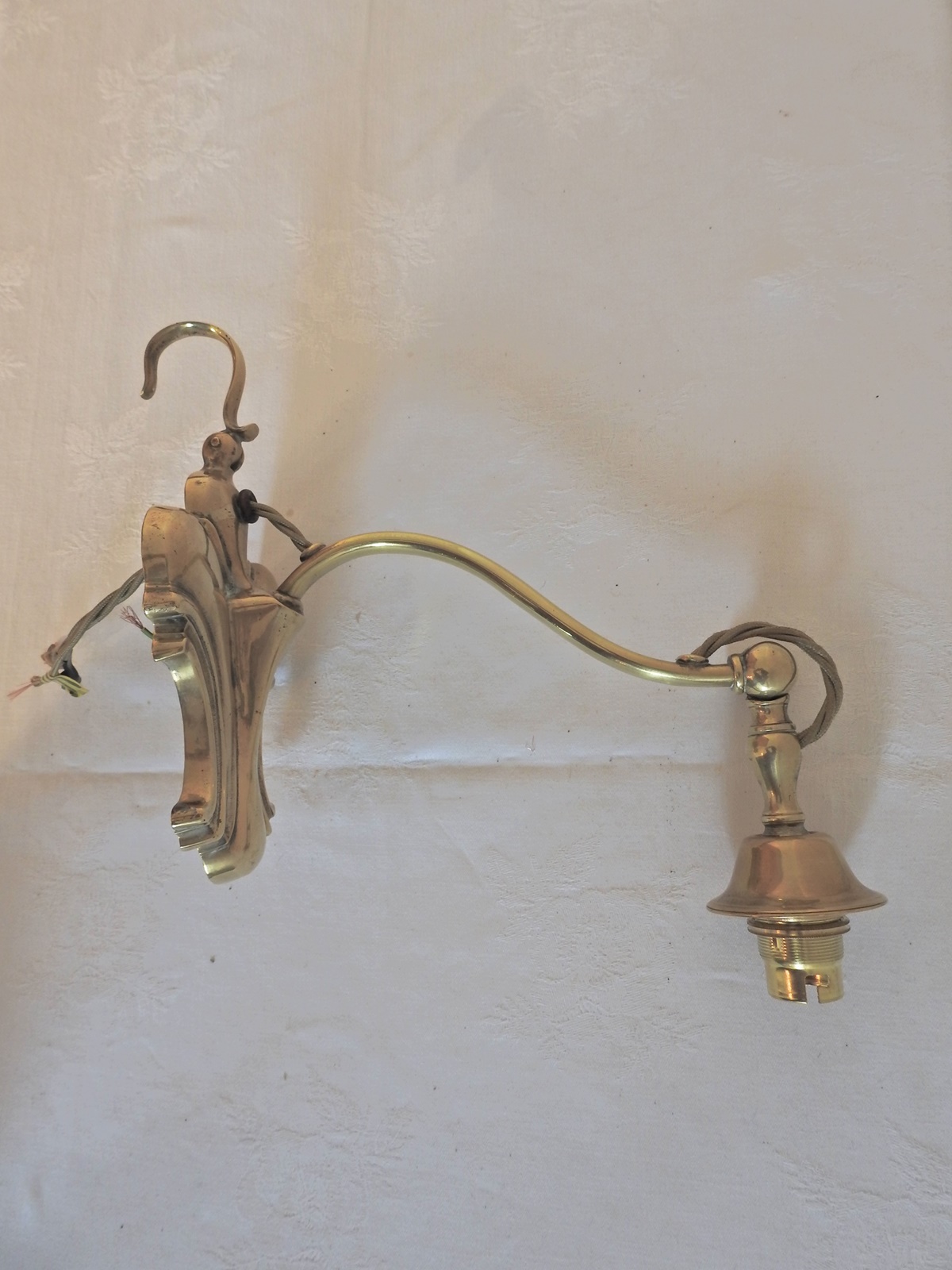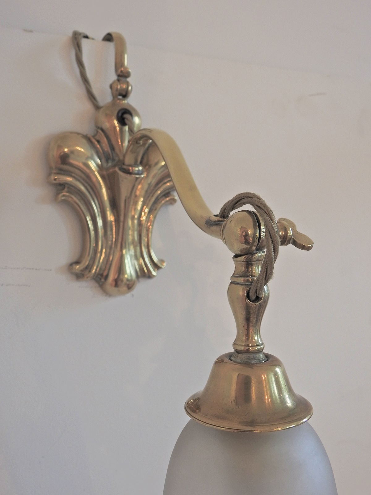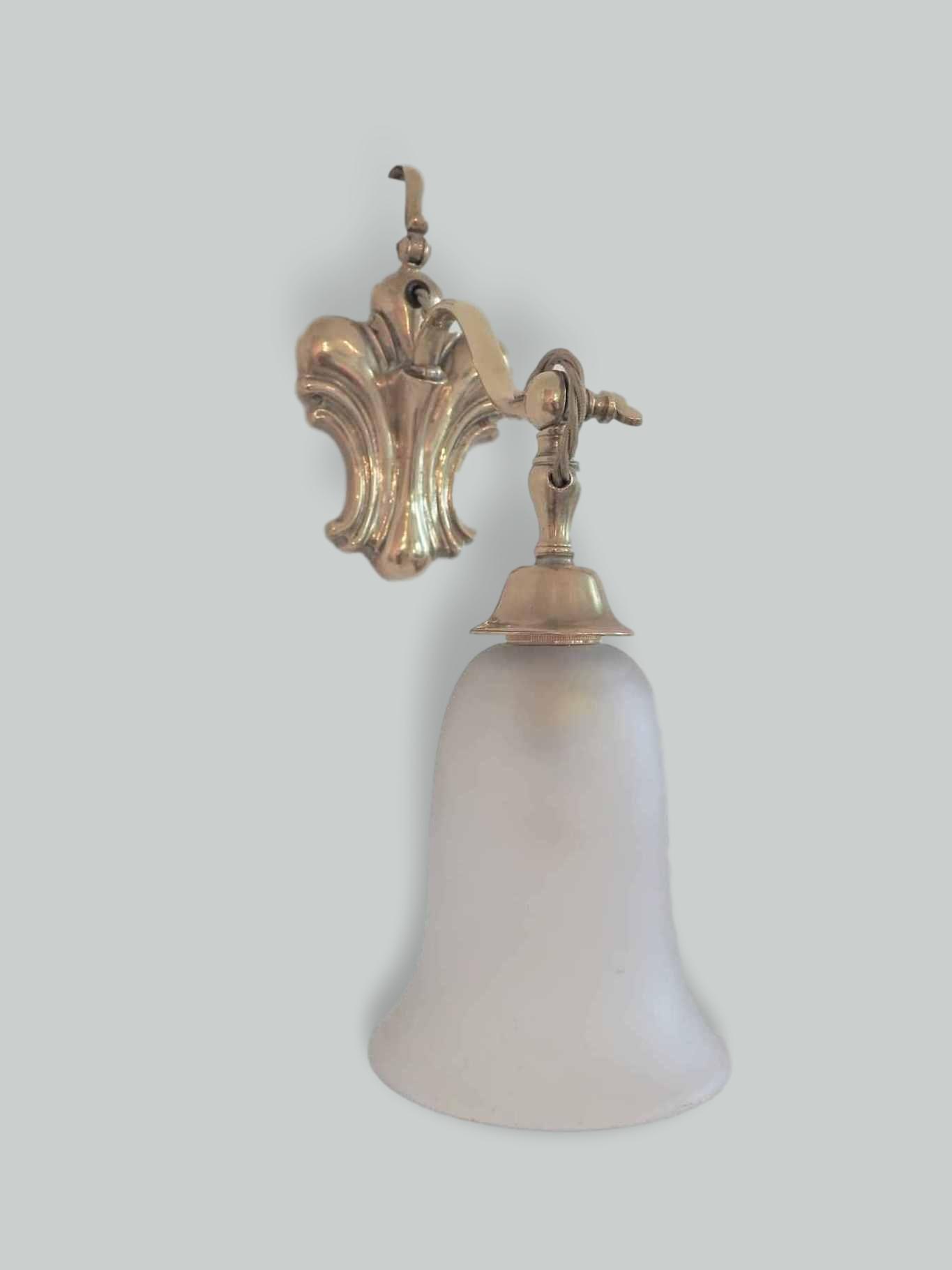 A pair of rare cast-brass wall lights with original bedstead hooks with frosted-glass bell lampshades. England, c.1905.