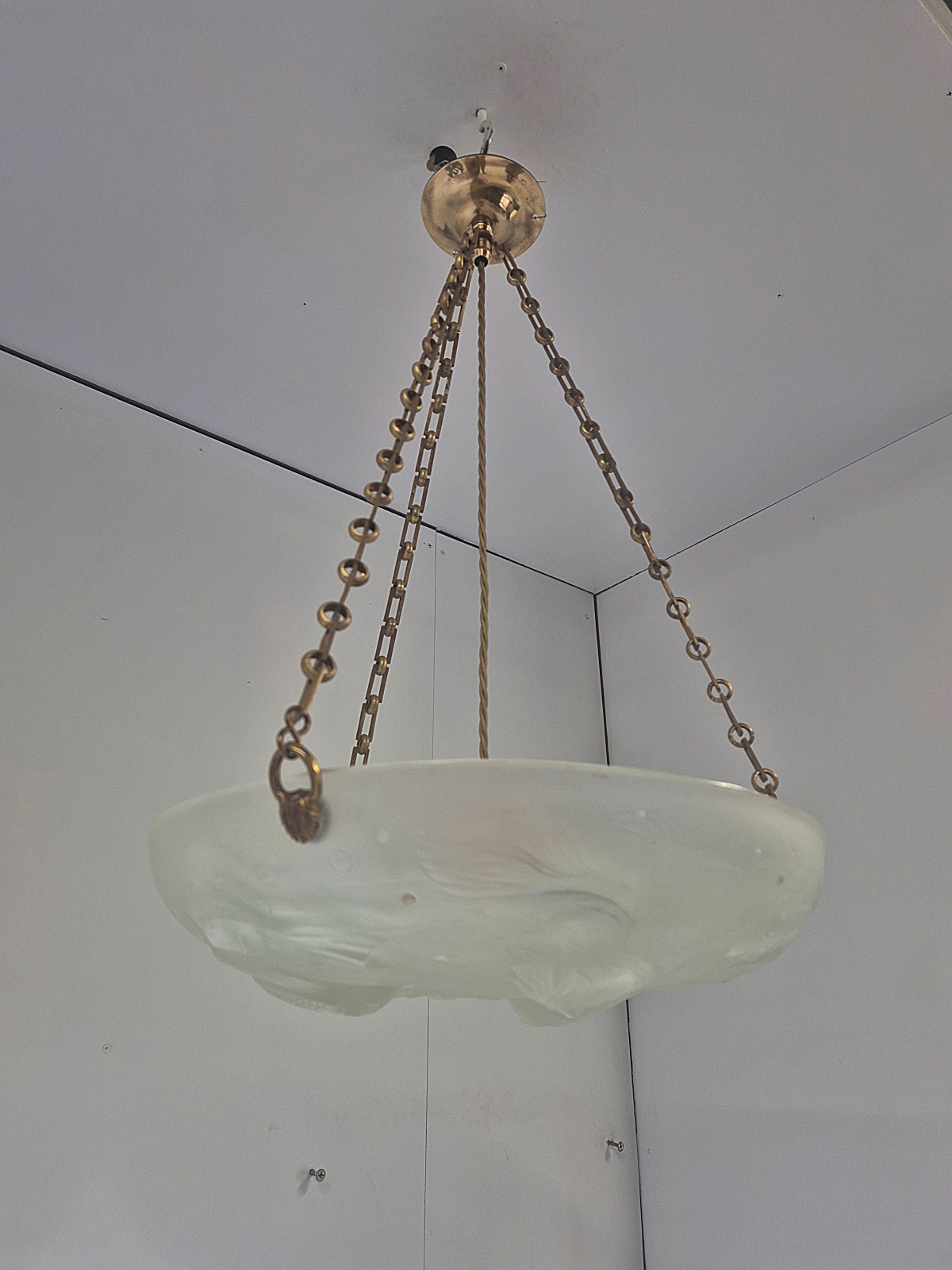 Product Code: LG647A pair of mildly opalescent art deco glass plafonniers designed with carp-like fish and designed by the famous French glass-maker Ernst-Marius Sabino. Original sea-shell bowl hooks with replacement chain and ceiling rose for suspension. Engraved signature “Sabino, Paris, France”. France, c1925.