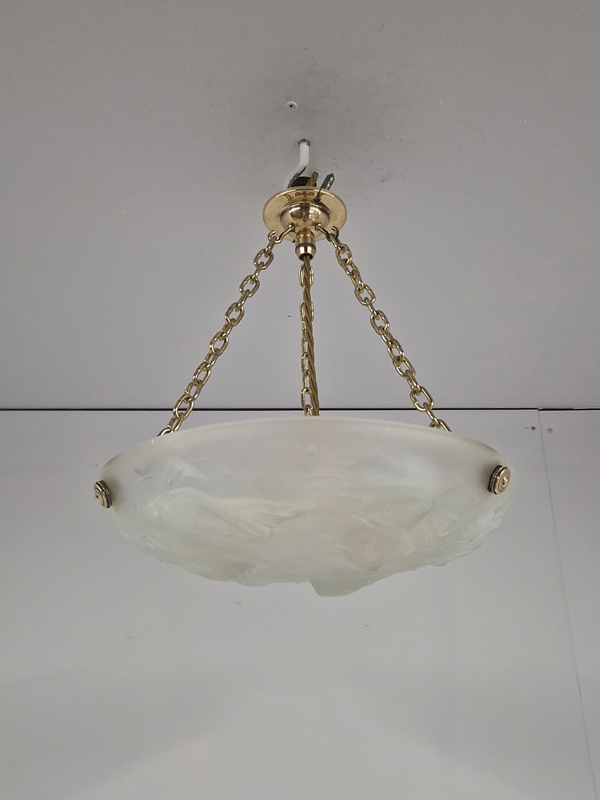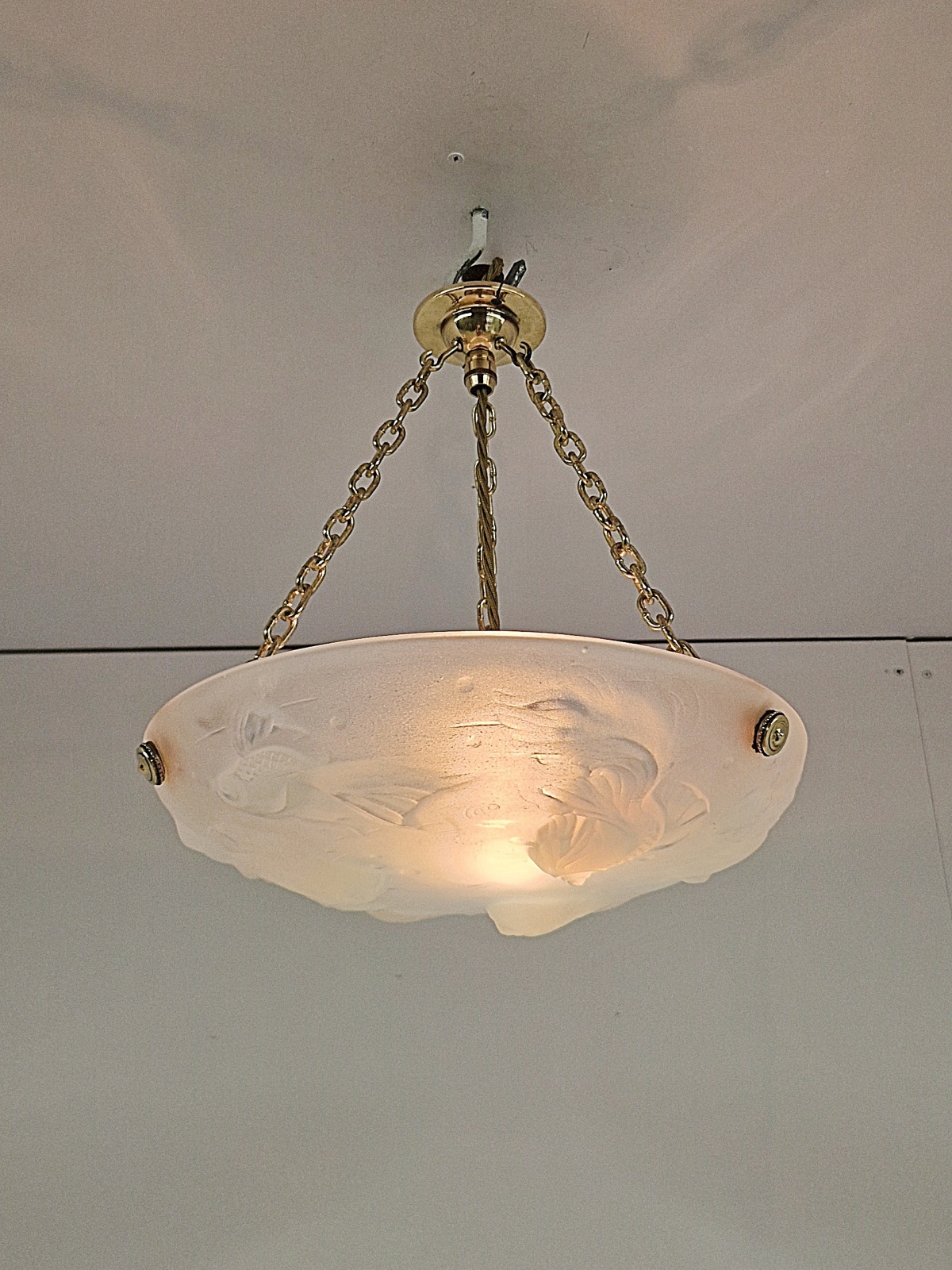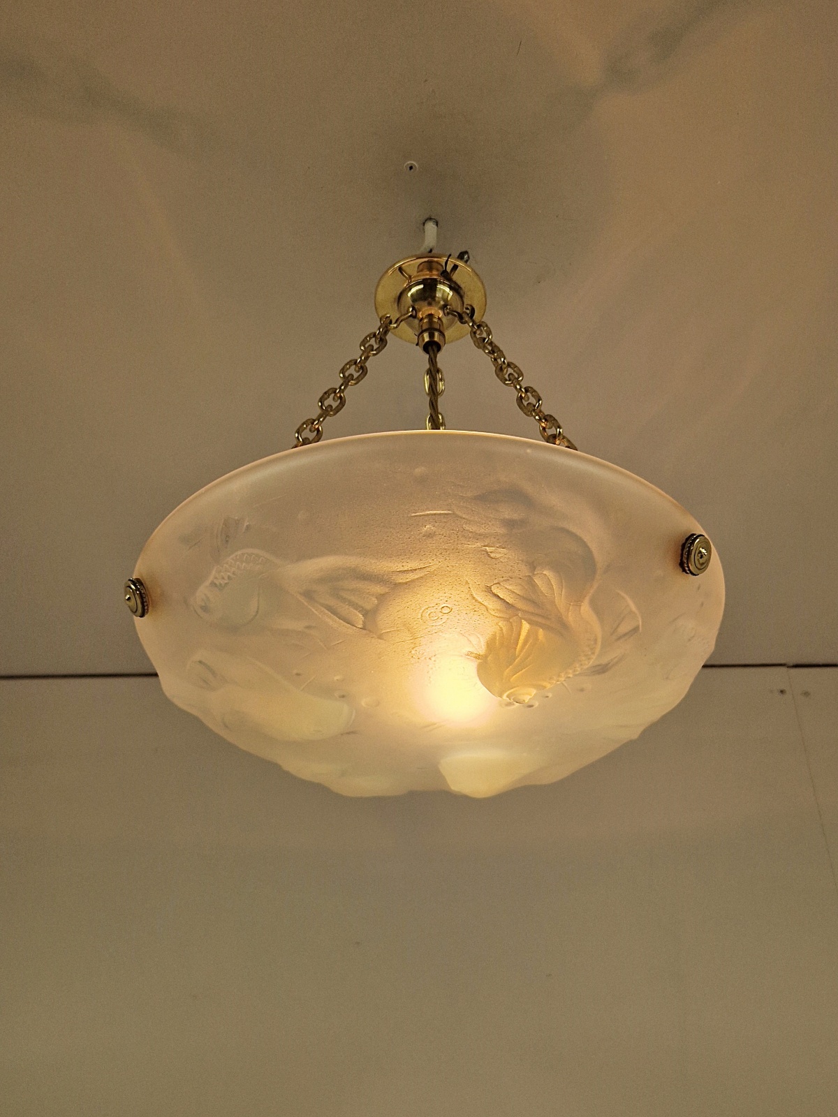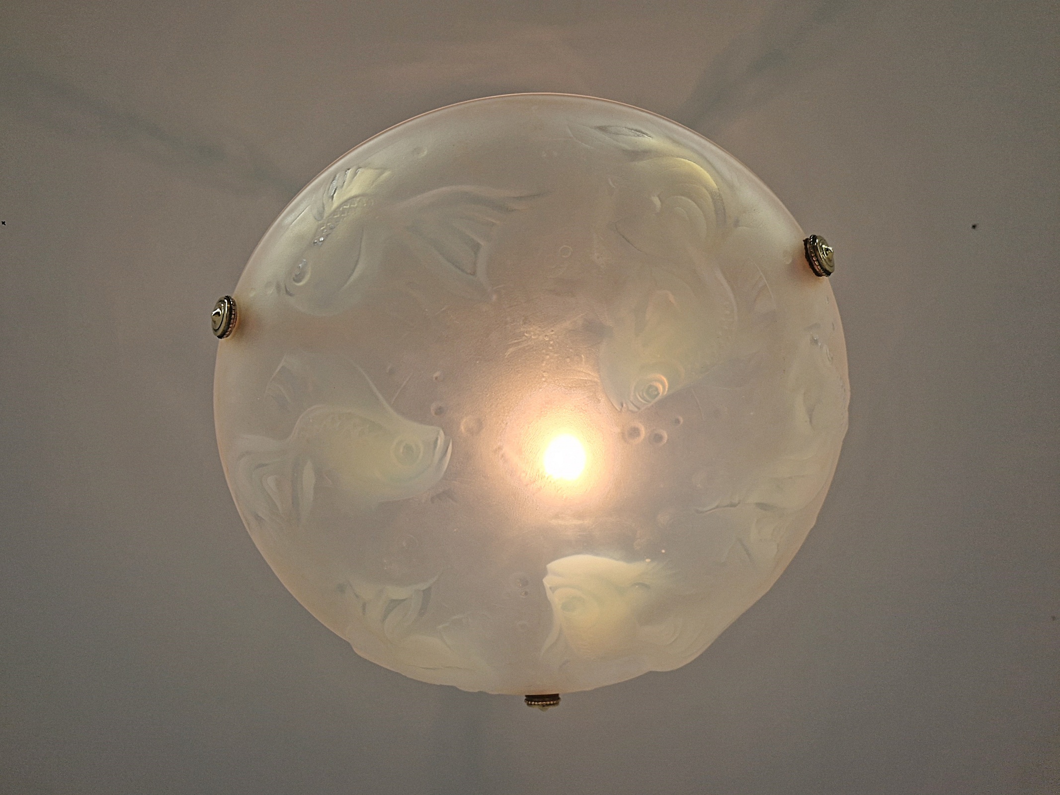 Product Code: LG773A small opalescent glass plafonnier designed with carp-like fish designed by Ernst-Marius Sabino. Replacement brass fitments for suspension and script engraved signature “Sabino, Paris, France”. France, c1925.