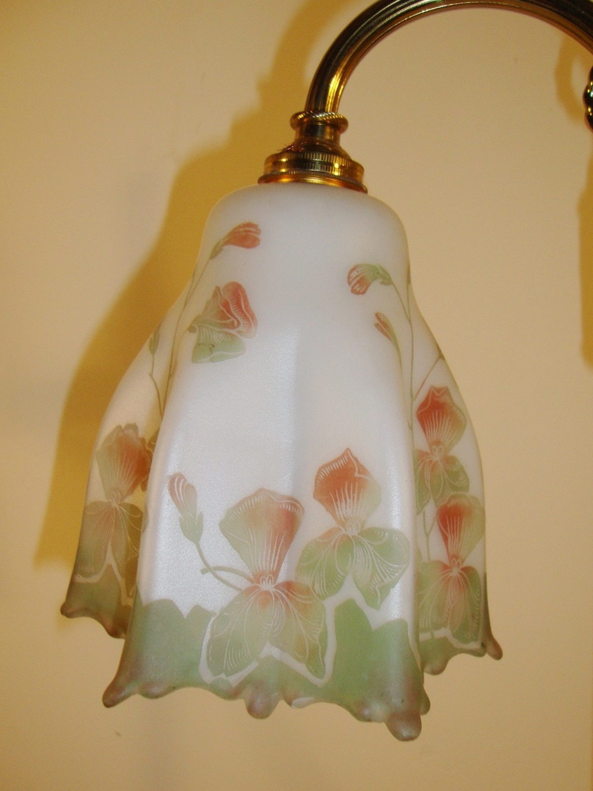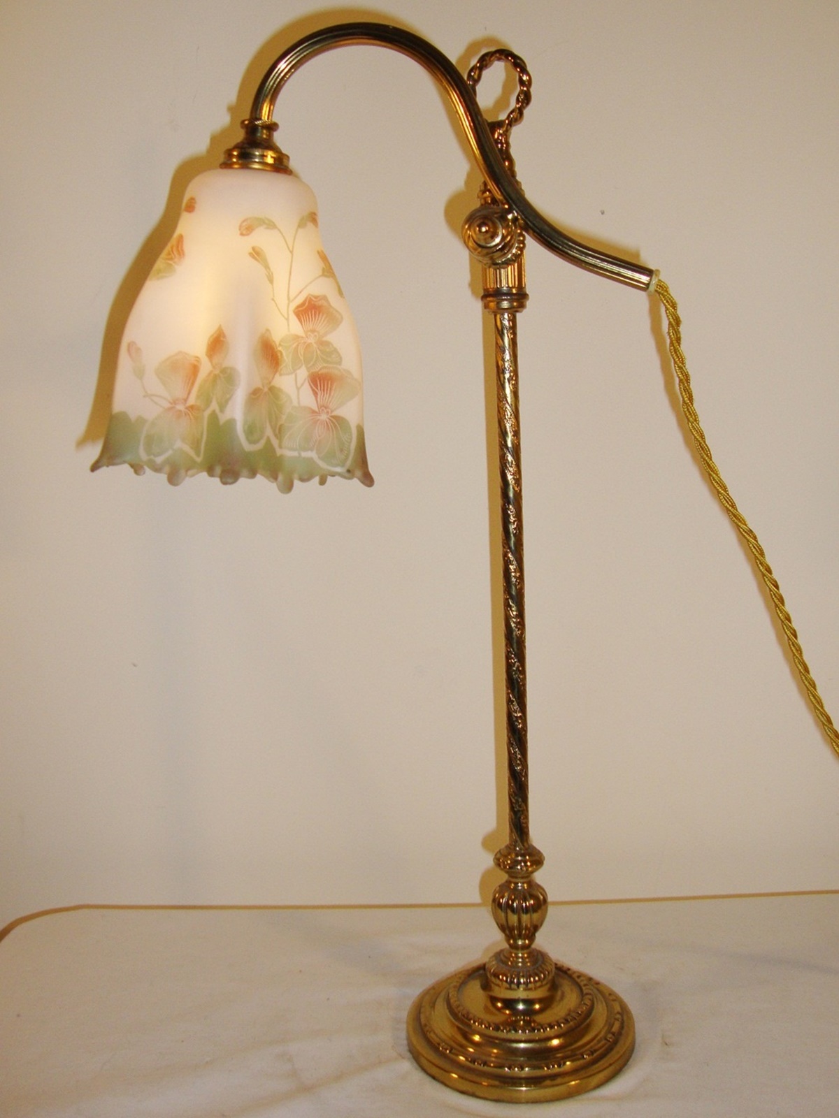 An exceptional French cast brass “pump” lamp, with an adjustable arm supporting an attractive faux-cameo opaline and coloured-glass lampshade designed with clover. France, early c20th