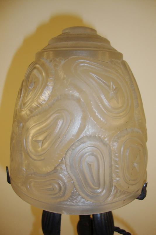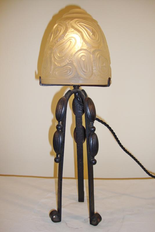 An art deco wrought iron table lamp, the trefoil base supporting a “mushroom” shaped lampshade of abstract design. France c1925