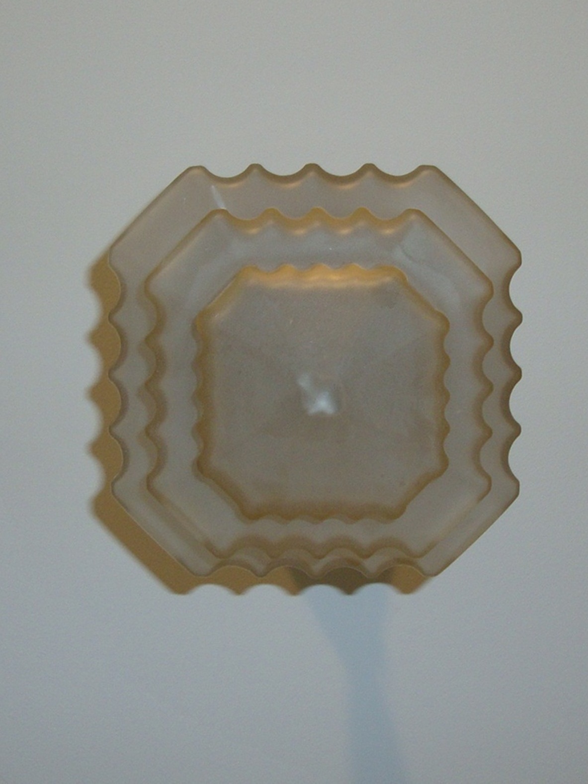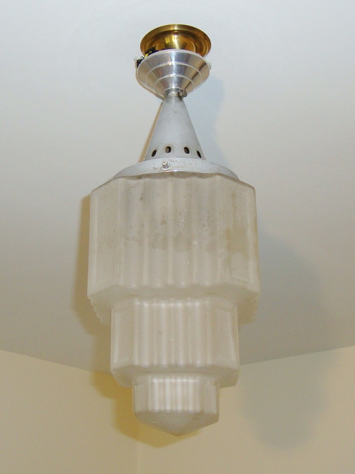 An art deco lantern, the frosted glass of stepped geometric form and supported by the original chrome gallery for suspension. France c1930