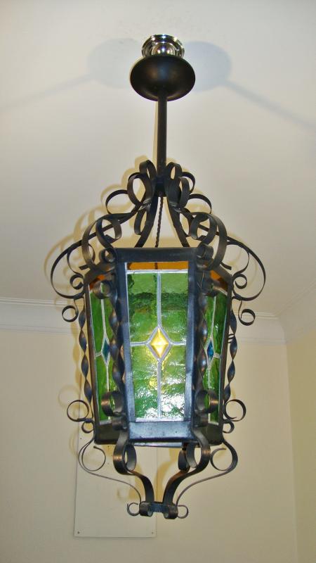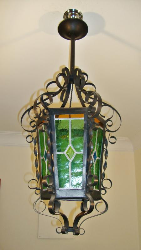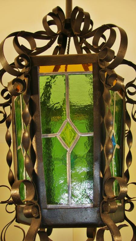 A Neo-gothic style wrought-iron and green leaded-glass lantern. France, early c.20th.