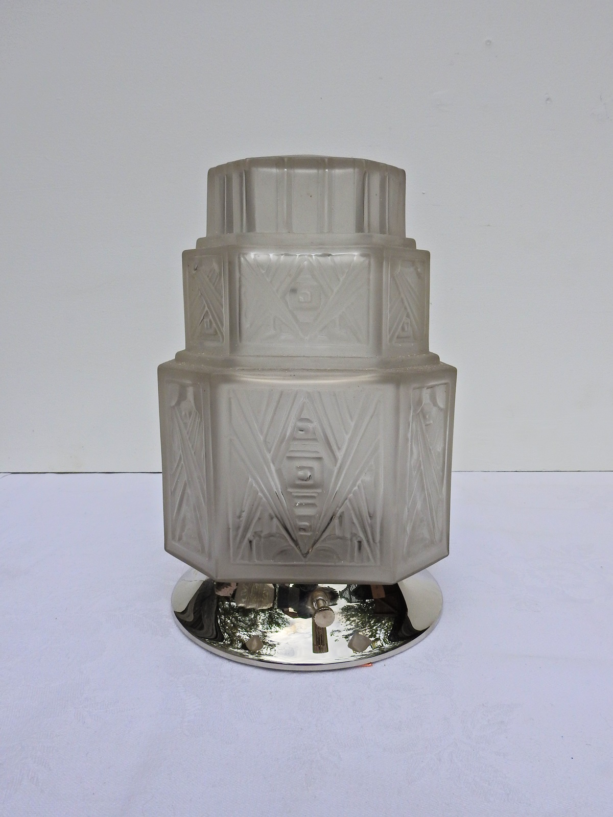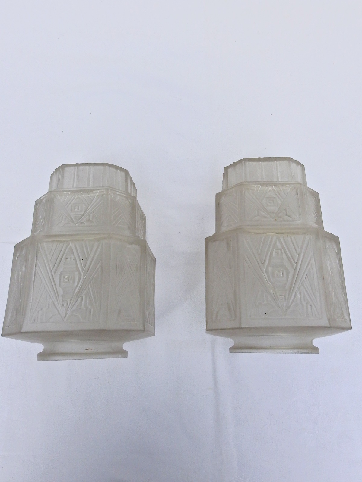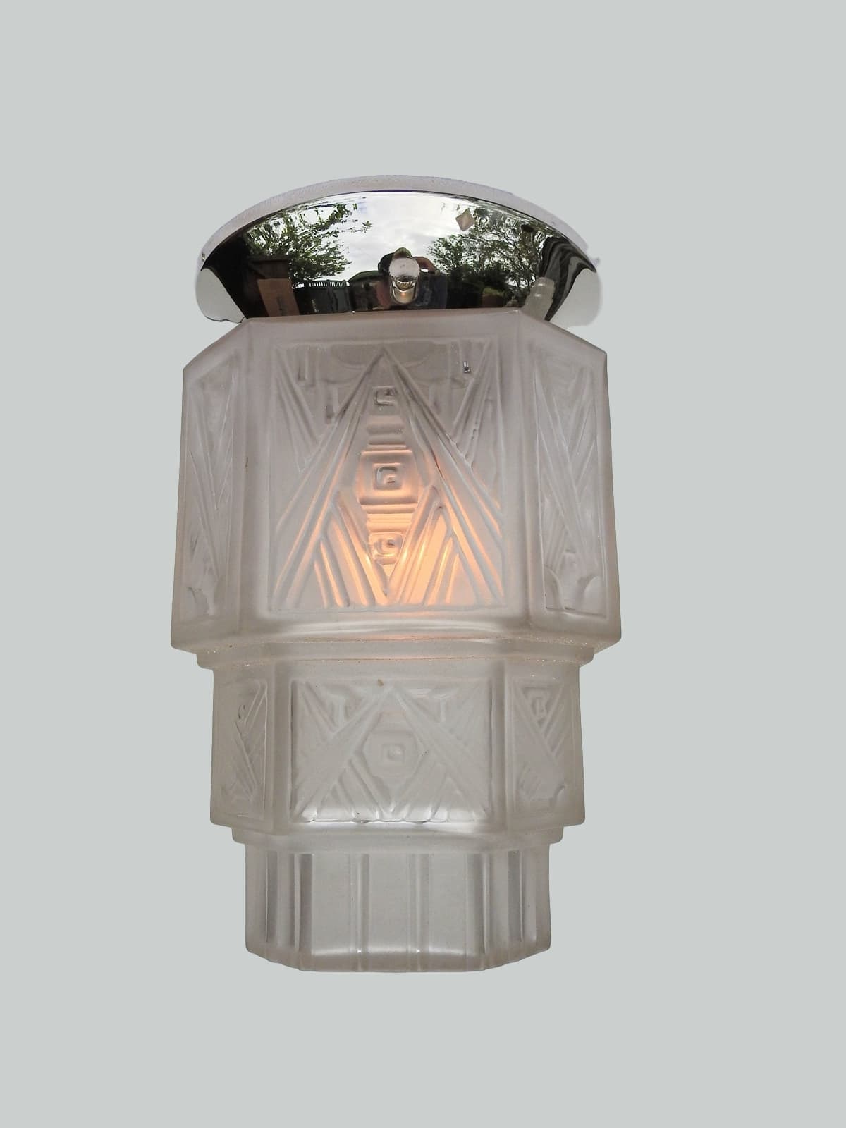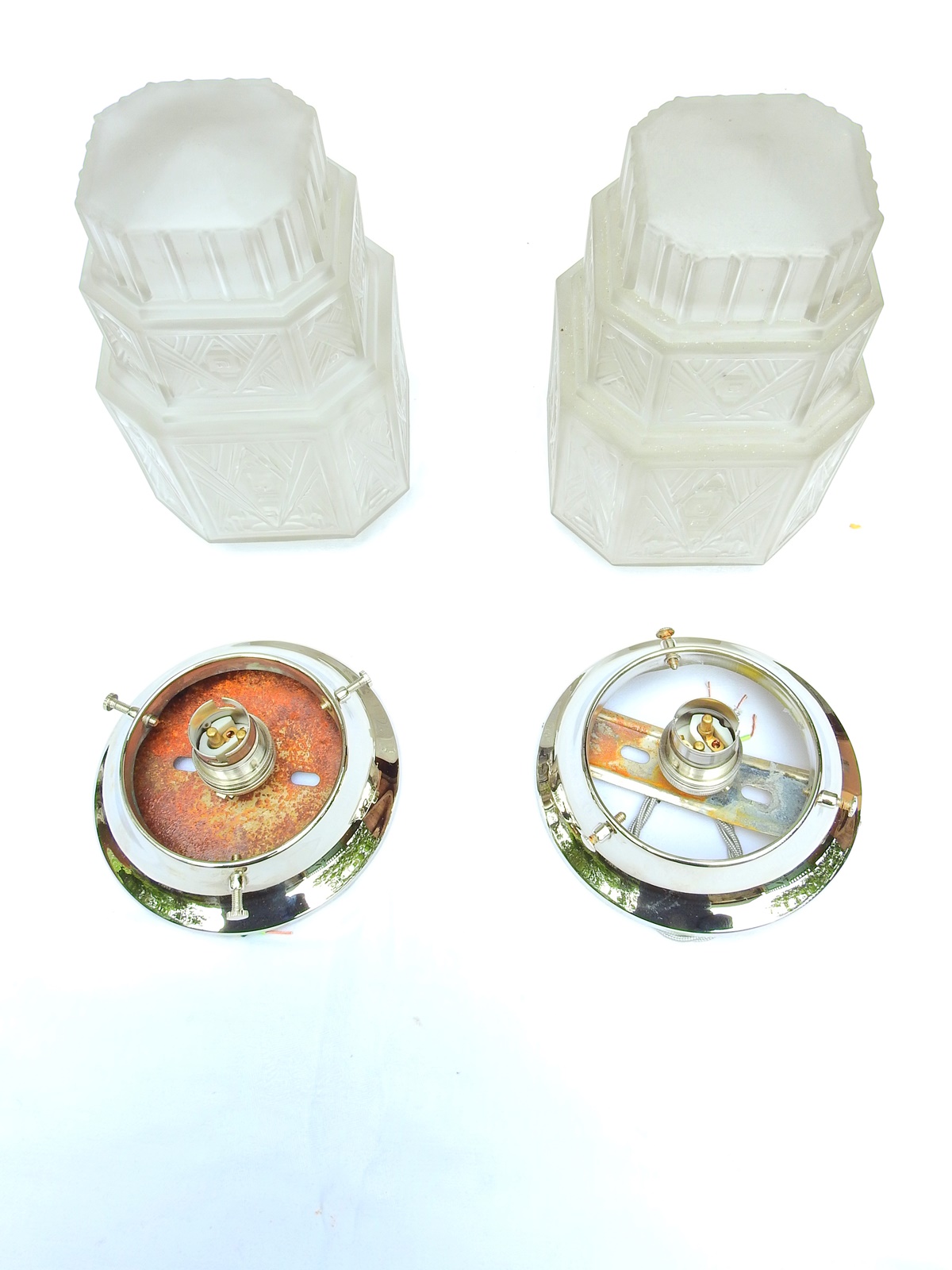 Product Code: JAL0981A pair of art deco flush ceiling fixtures of geometric form, the strongly-designed polished and frosted glass designed exclusively by George Leleu and produced by Verreries Des Hanots supported in nickel-plated fitments. France c1930
