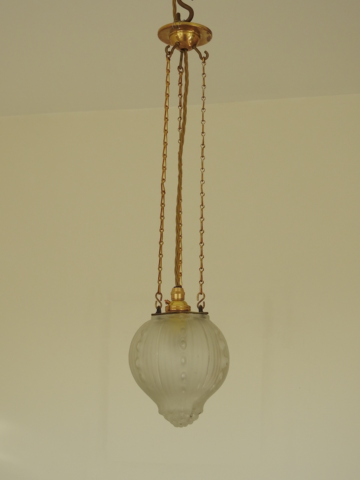 Product Code: JAL0714A collection of 4 unusual art deco frosted glass lanterns by George leleu with original hexagonal brass mounts.
