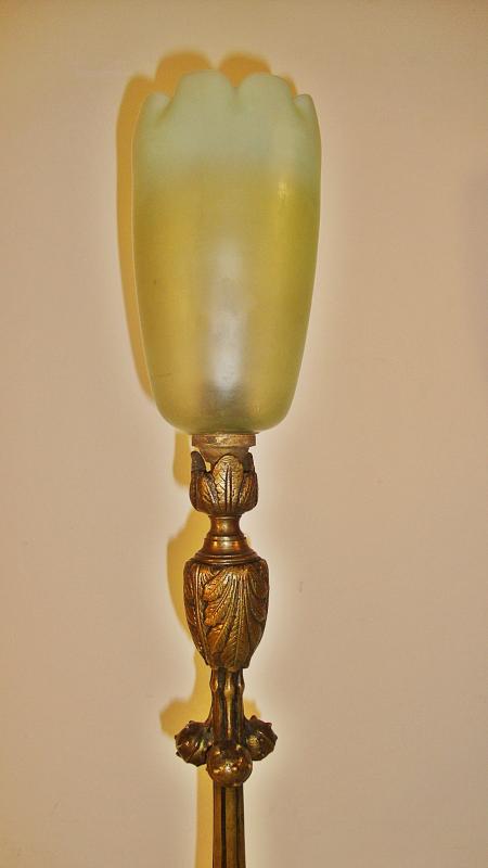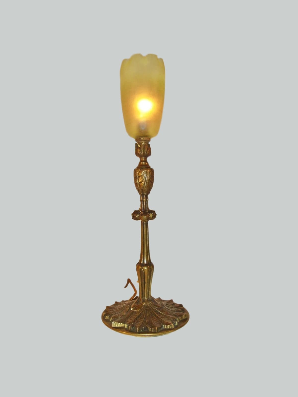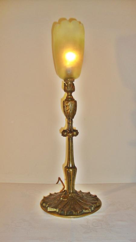 A very good quality bronze table lamp cast with a design of horse chestnut leaves and conkers, the base supporting a vaseline-glass lampshade; France, c.1900. Ht.52cm/20.5ins.