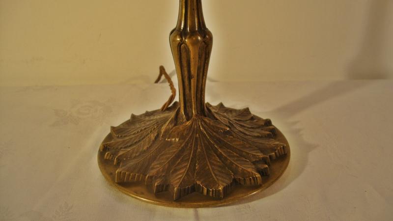 A very good quality bronze table lamp cast with a design of horse chestnut leaves and conkers, apparently unsigned, the base supporting a vaseline glass lampshade. France circa 1900